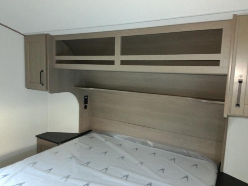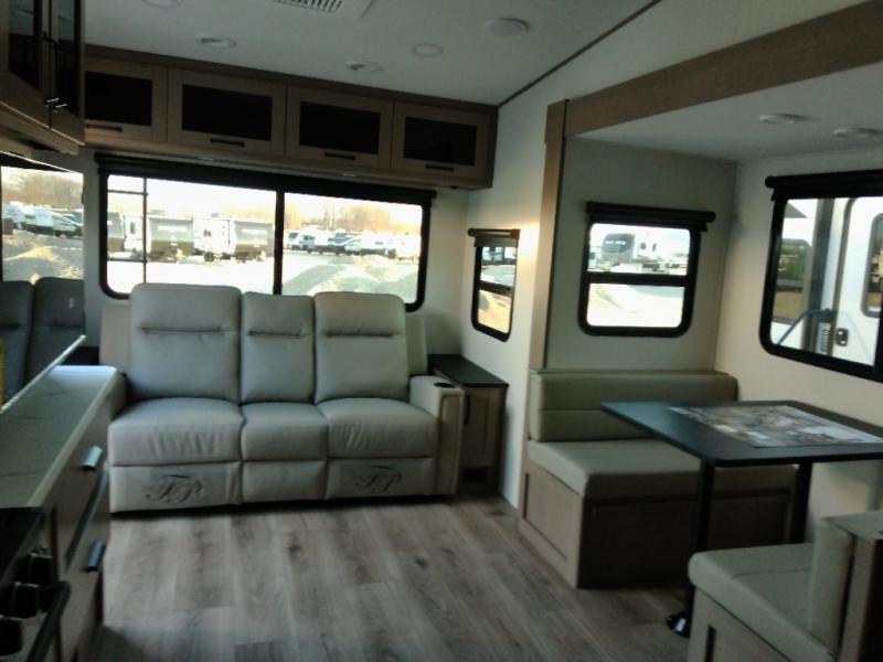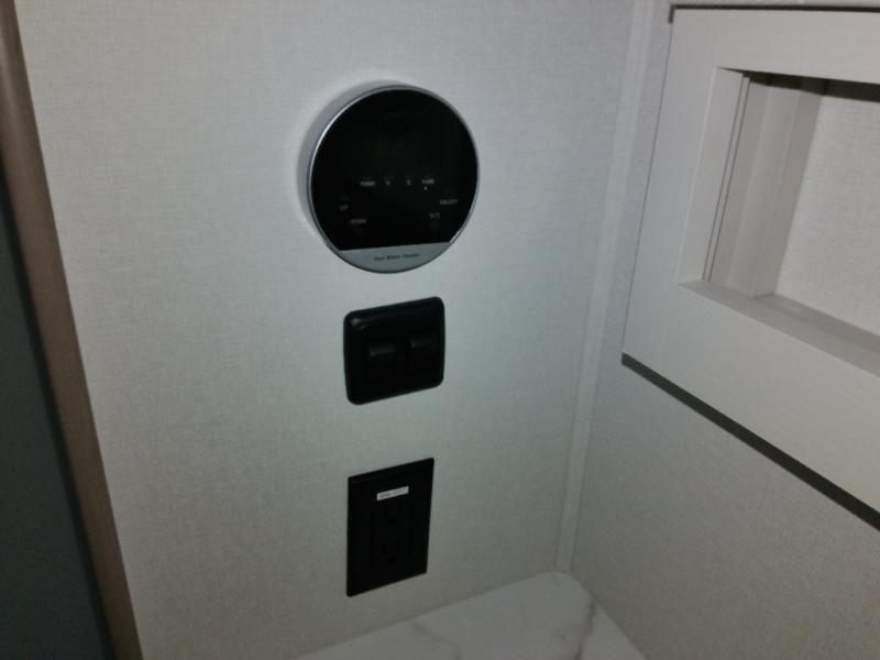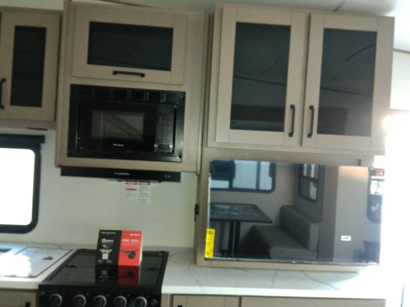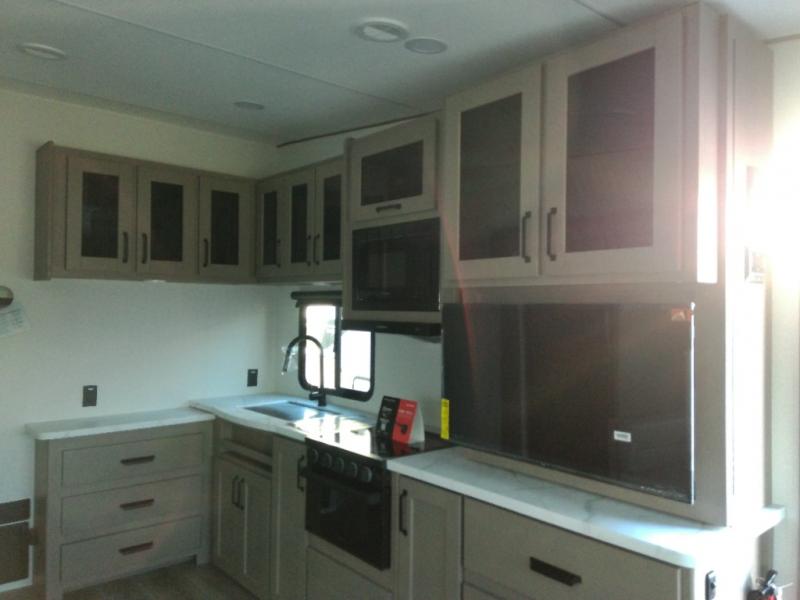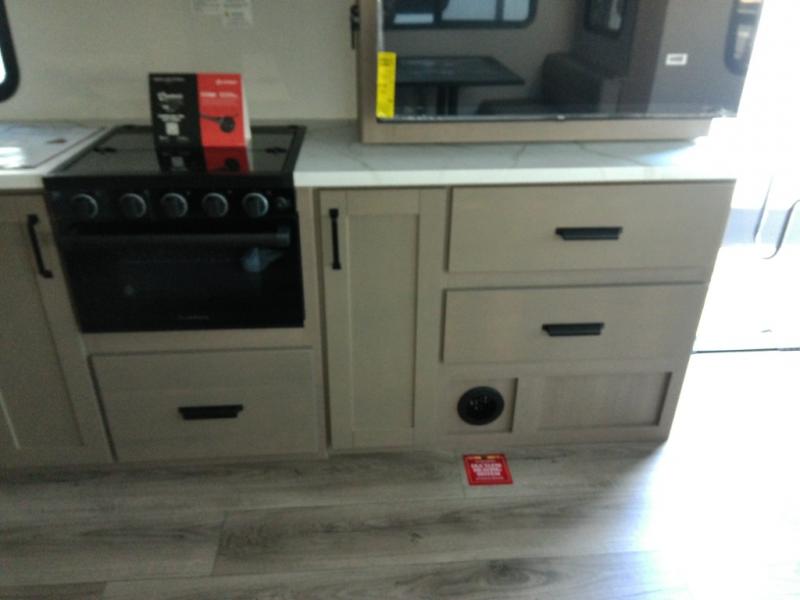This is the perfect couple's trailer with a space for an overnight guest or two little ones on the booth dinette. A 40" HDTV will keep you entertained when the weather isn't cooperating, and you can whip up your best meals in the full kitchen. And a 19' power awning will provide shade if you choose to take your plate outdoors! The spacious full bath will let you clean up each day, and you'll feel right at home in the front private bedroom with a queen bed!