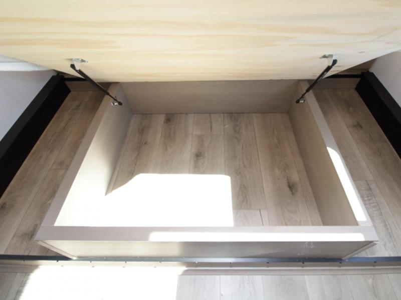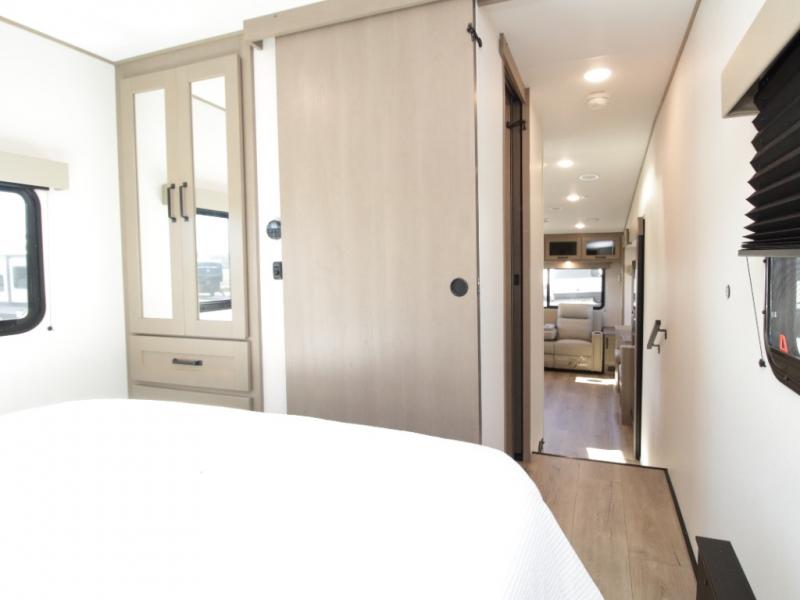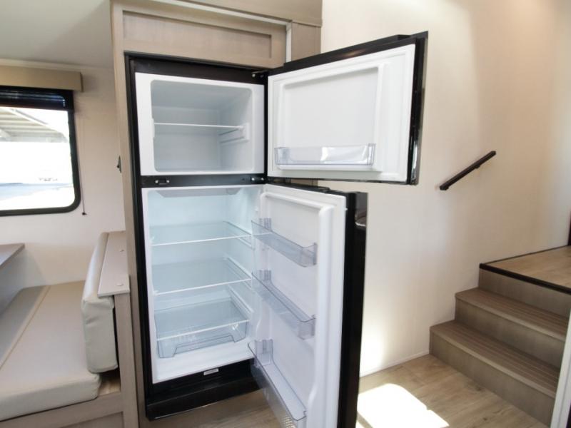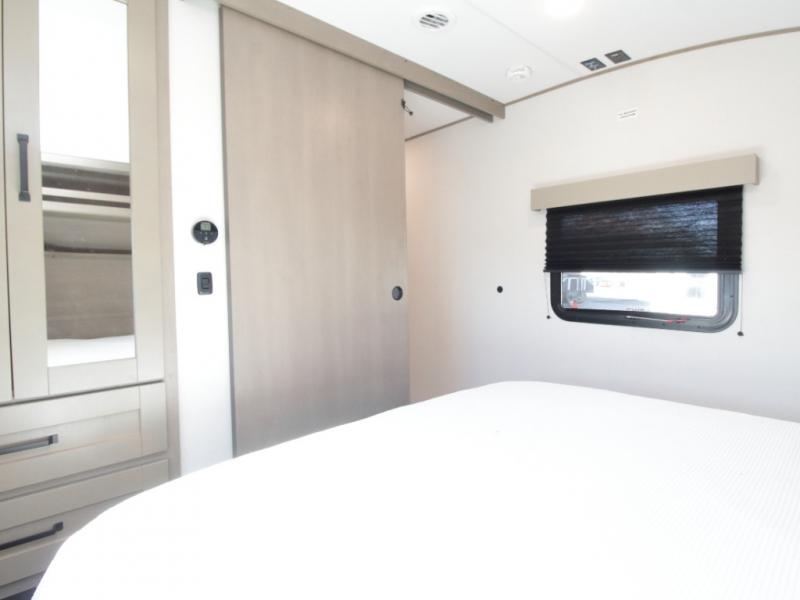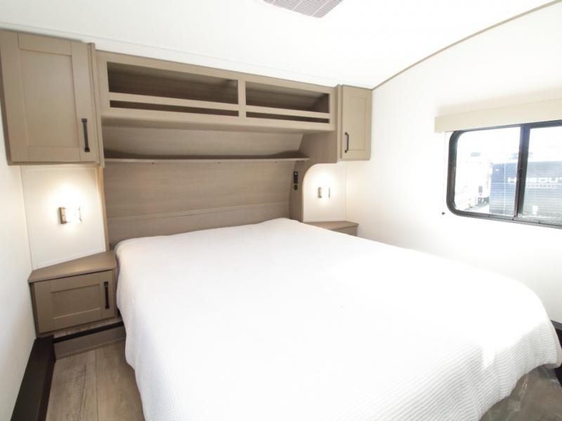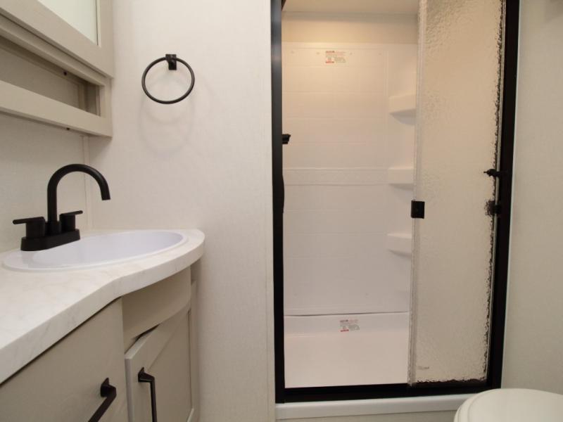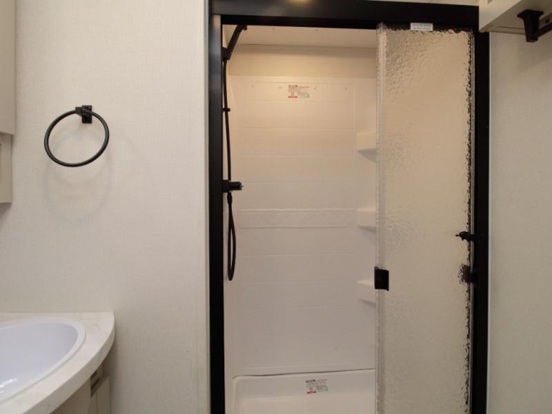 The spacious full bathroom features a walk-in shower, providing residential-style comfort after a day of exploring. Up front, the private master bedroom includes a comfortable queen bed and storage space that makes extended travel feel like home.