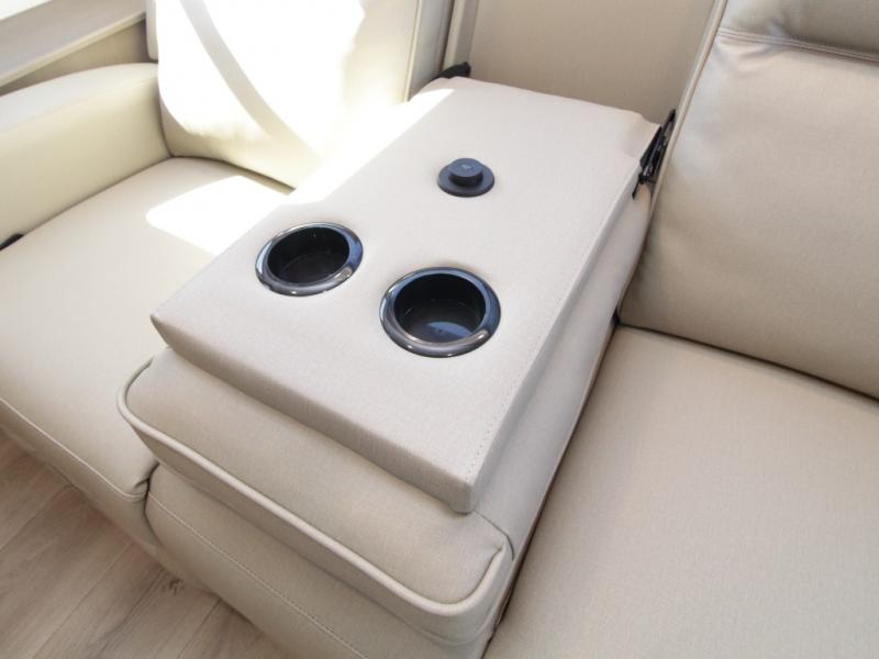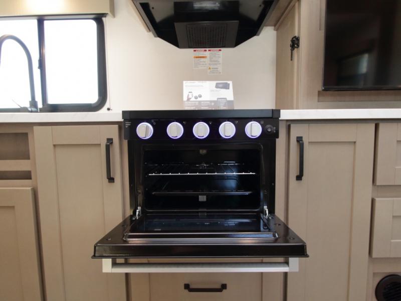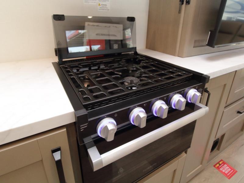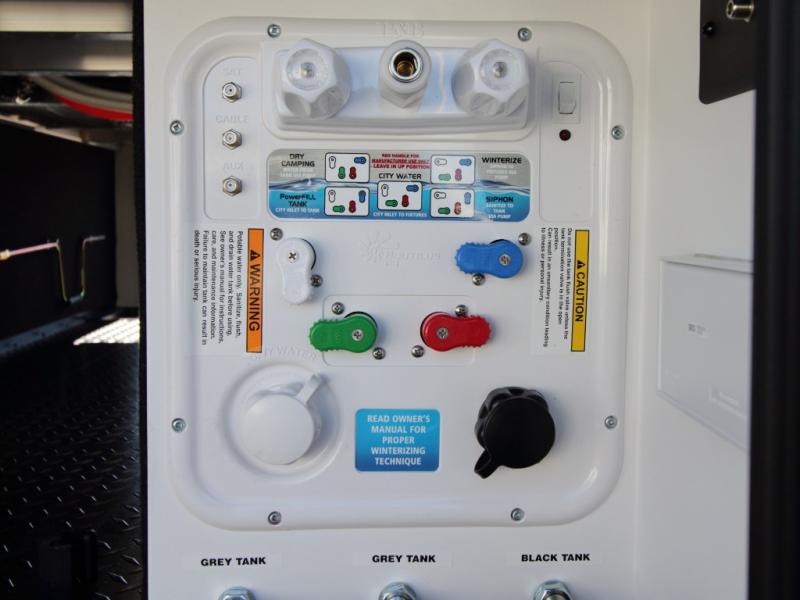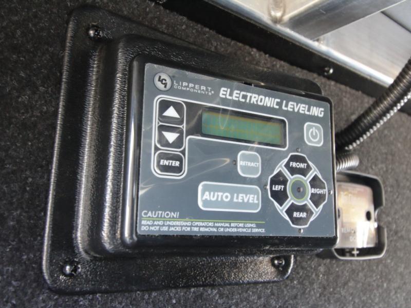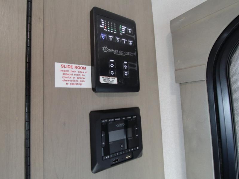 Additional conveniences include an on-demand water heater, a universal all-in-one docking station for easy system monitoring, and refined interior finishes such as premium Congoleum flooring, pleated window shades, residential-style cabinetry, and matte black fixtures and hardware.