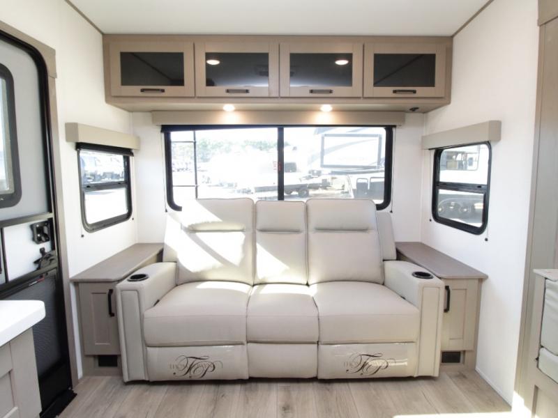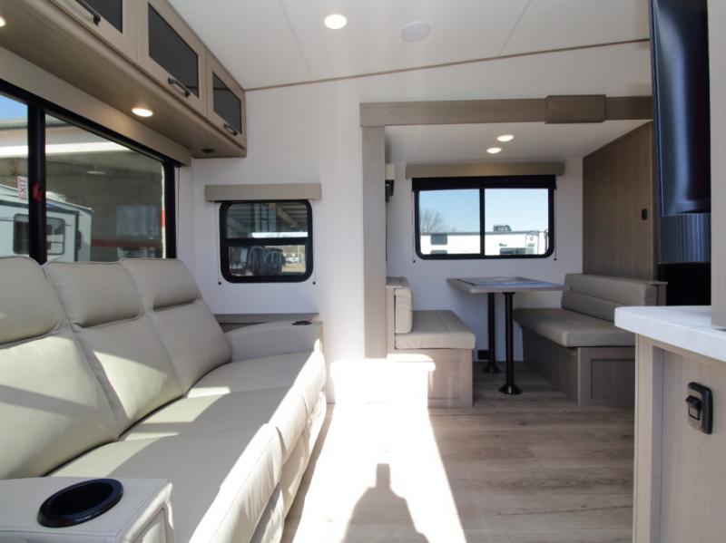 The Grand Design Reflection 100 Series 24RL fifth wheel is the ideal choice for couples seeking comfort, quality, and towability without sacrificing upscale features. With a thoughtfully designed rear living layout, this fifth wheel also offers flexible sleeping options for an overnight guest or two children using the booth dinette. Optional seating upgrades include a swivel dinette or a trundle bed in place of the standard theater seating to accommodate additional sleepers.