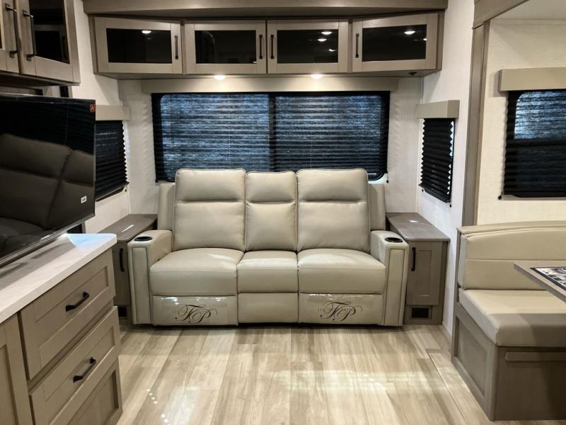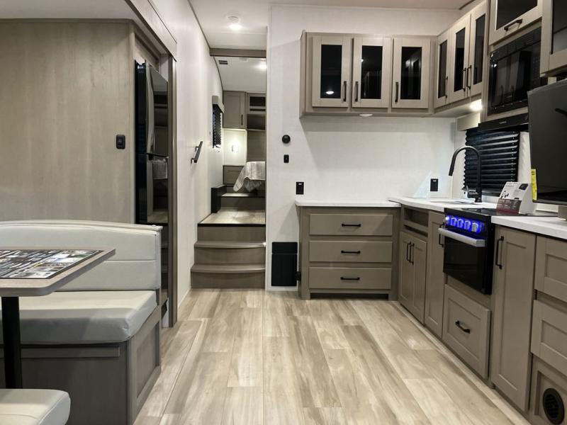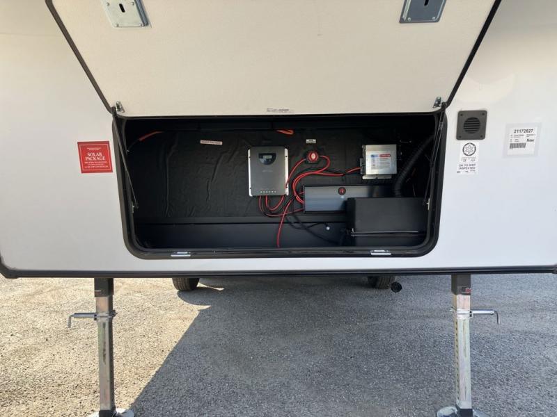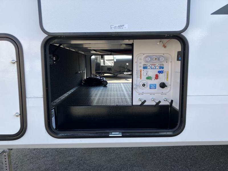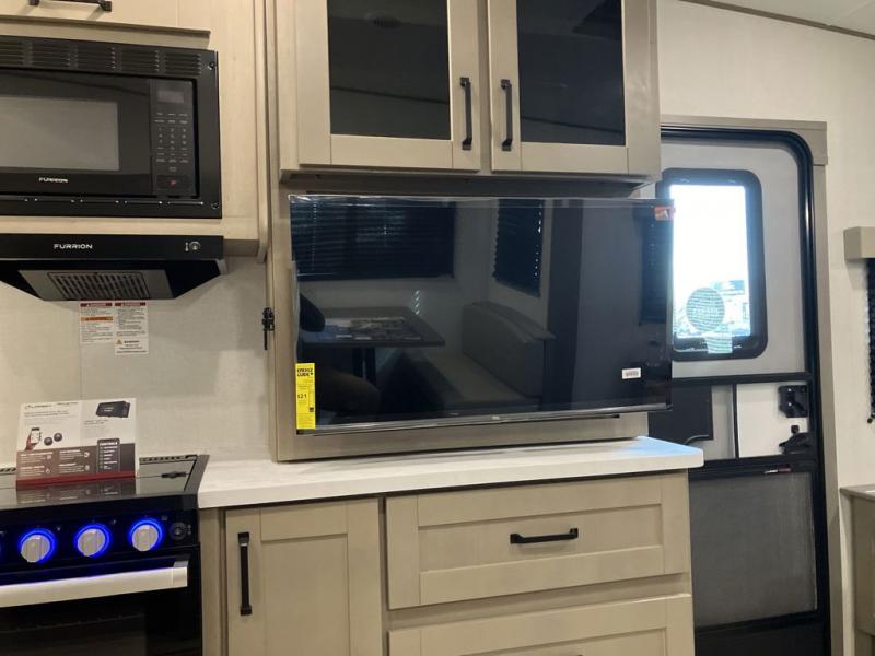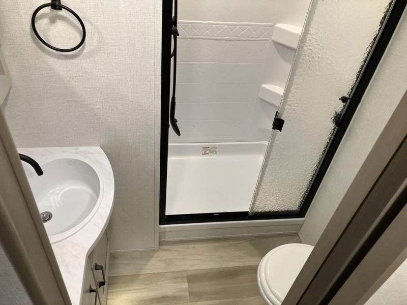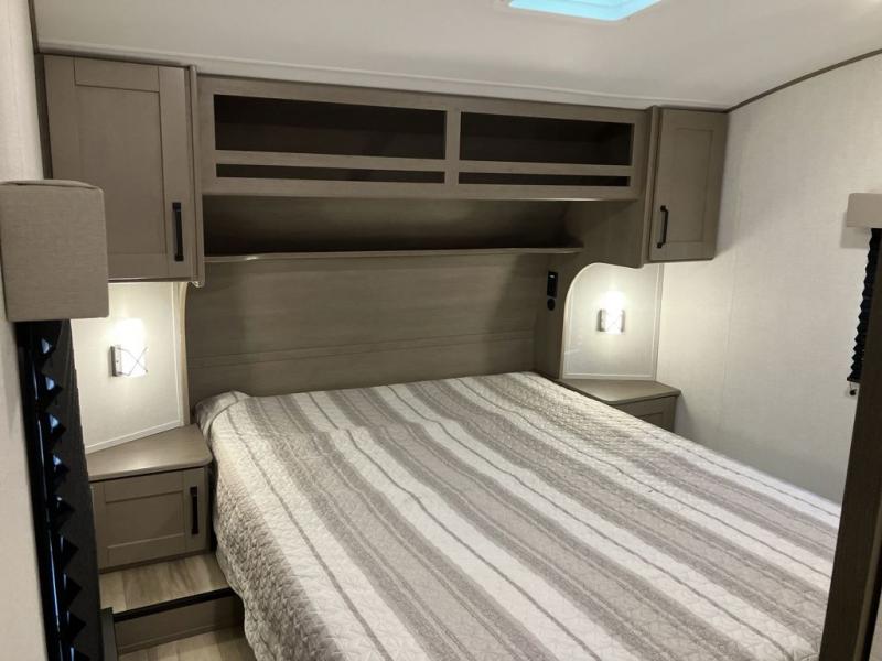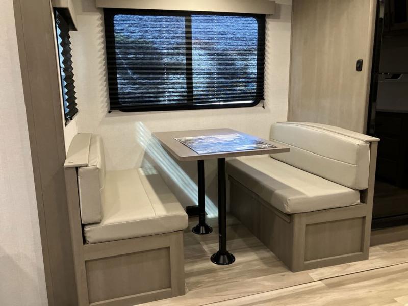 This is the perfect couple's trailer with a space for an overnight guest or two little ones on the booth dinette. You can switch out this dinette for an optional swivel dinette as well, and the standard theater seating can be replaced by an optional trundle bed if you need more sleeping space. A 40" HDTV will keep you entertained when the weather isn't cooperating, and you can whip up your best meals in the full kitchen. And a 19' power awning will provide shade if you choose to take your plate outdoors! The spacious full bath will let you clean up each day, and you'll feel right at home in the front private bedroom with a queen bed!