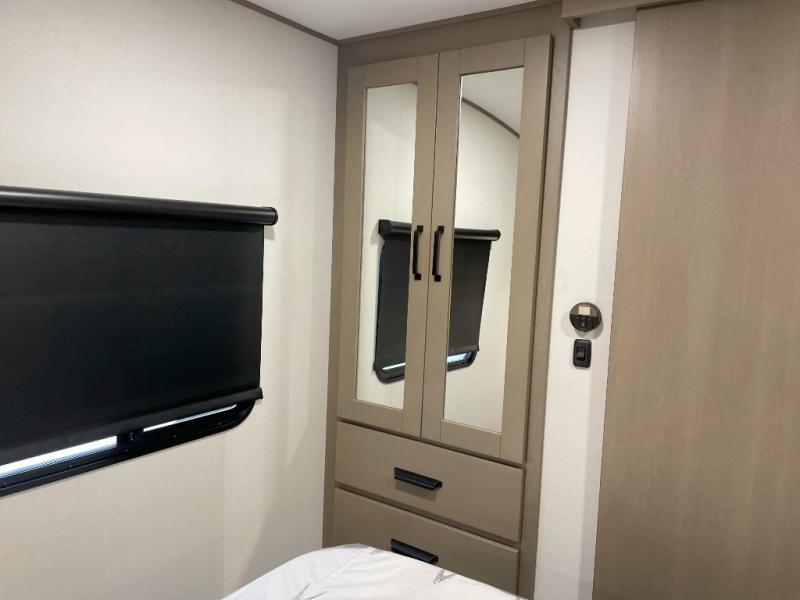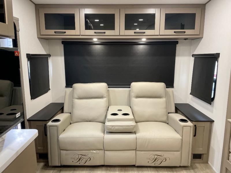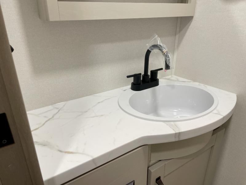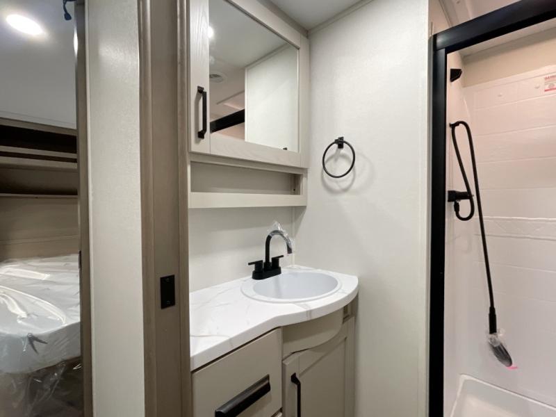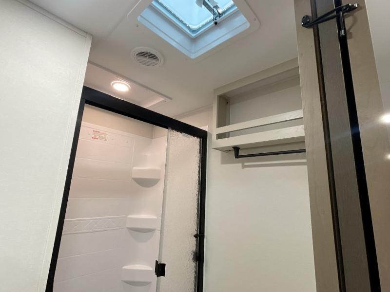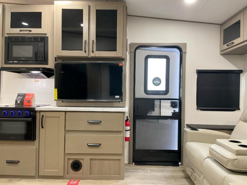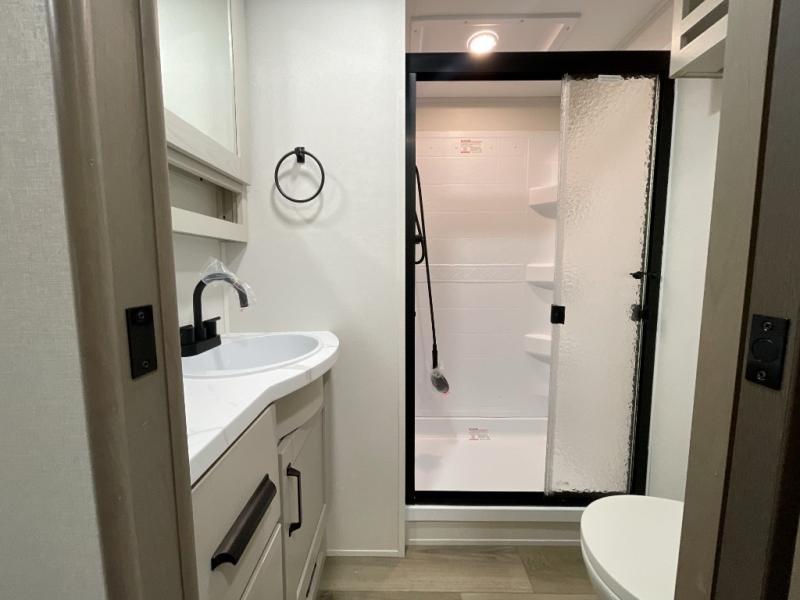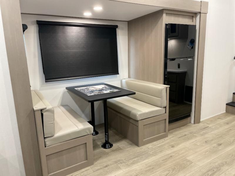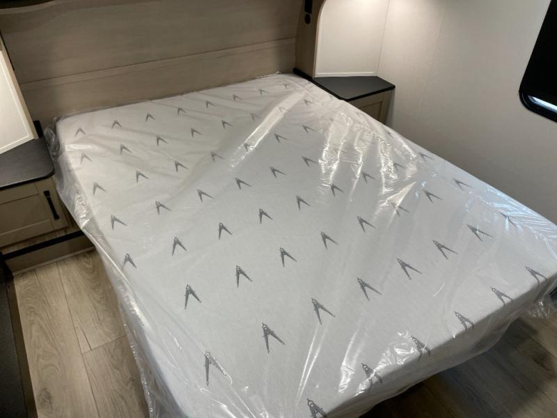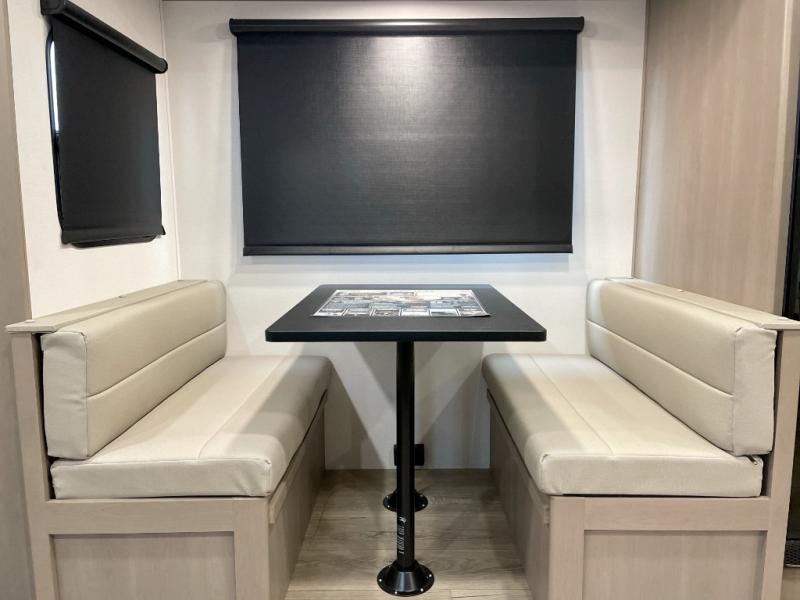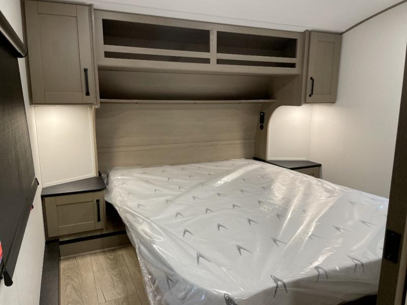 This is the perfect couple's trailer with a space for an overnight guest or two little ones on the booth dinette. You can switch out this dinette for an optional swivel dinette as well, and the standard theater seating can be replaced by an optional trundle bed if you need more sleeping space. A 40" HDTV will keep you entertained when the weather isn't cooperating, and you can whip up your best meals in the full kitchen. And a 19' power awning will provide shade if you choose to take your plate outdoors! The spacious full bath will let you clean up each day, and you'll feel right at home in the front private bedroom with a queen bed!