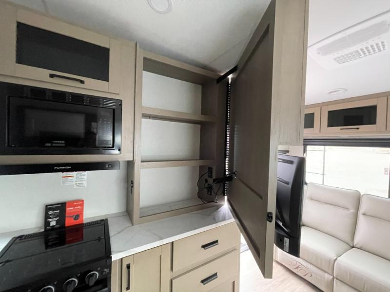 This is the perfect couple's trailer with a space for an overnight guest or two little ones on the booth dinette. You can switch out this dinette for an optional swivel dinette as well, and the standard theater seating can be replaced by an optional trundle bed if you need more sleeping space. A 40" HDTV will keep you entertained when the weather isn't cooperating, and you can whip up your best meals in the full kitchen. And a 19' power awning will provide shade if you choose to take your plate outdoors! The spacious full bath will let you clean up each day, and you'll feel right at home in the front private bedroom with a queen bed!