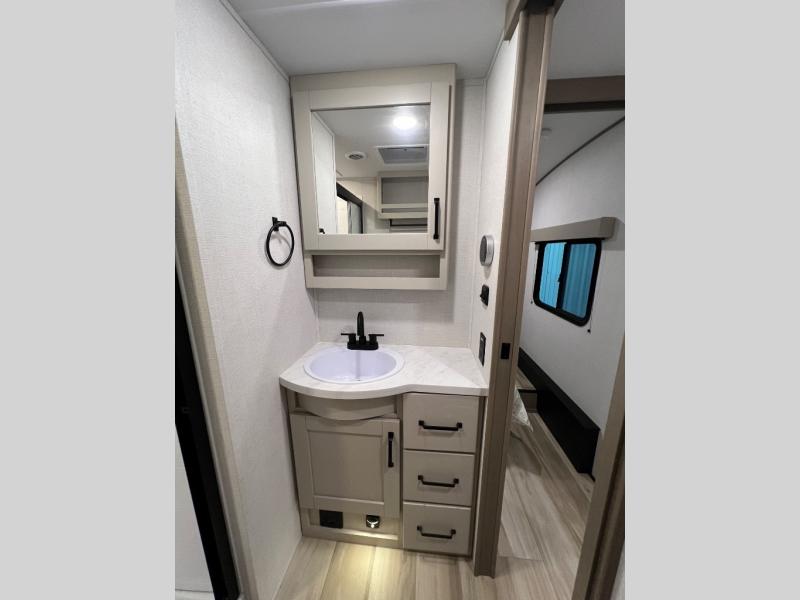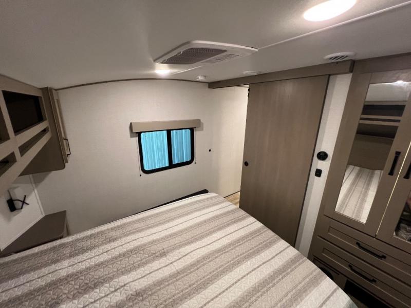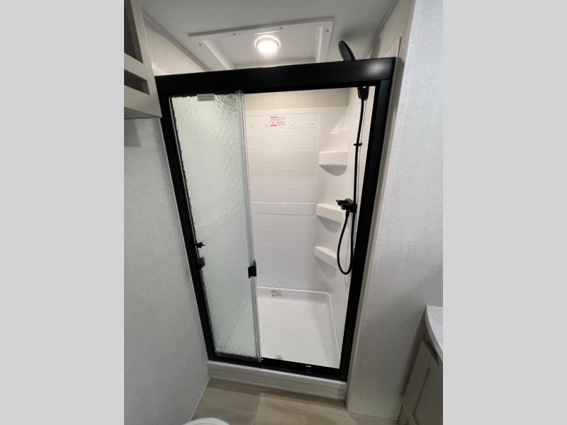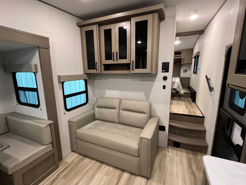 Camping with friends and family just got a whole lot easier in this fifth wheel with double-size bunks and a front private bedroom. Your guests will also have a wardrobe to keep their things tidy, and the bedroom closet will be perfect for your things. If you have other guests stay over, they can sleep on the U-shaped dinette within the slide out or the tri-fold sofa, and there is a 40" high-definition LED TV here to keep everyone entertained on rainy days. Everyone can take turns cleaning up in the full bath that includes a residential walk-in shower, a power vent fan, plus a large vanity top with a deep sink. And you will feel right at home in the front private bedroom with its queen bed, overhead cabinets, and TV prep if you'd like to add a television!