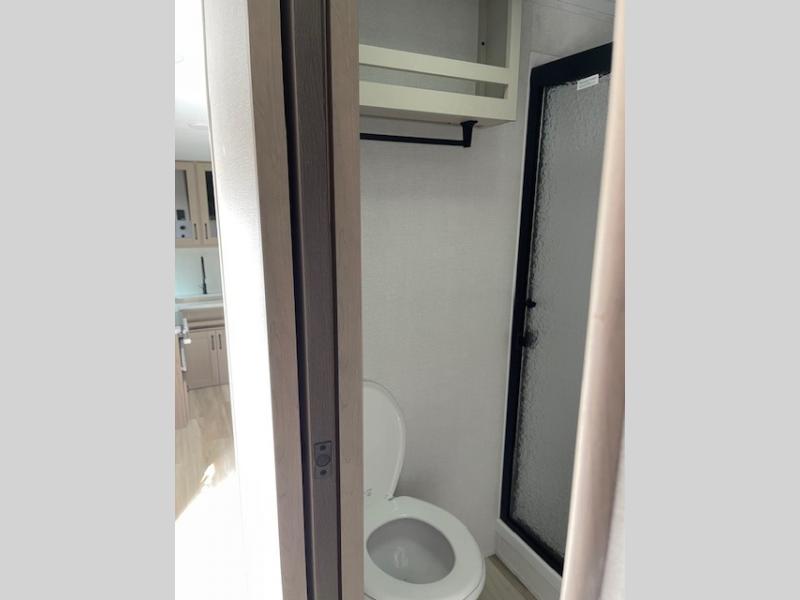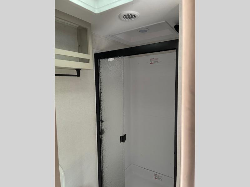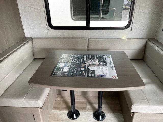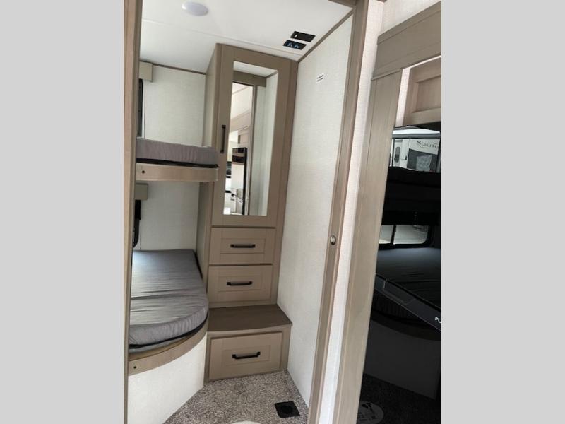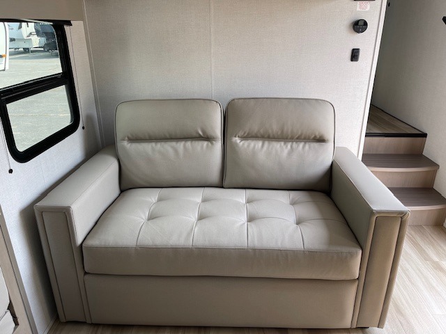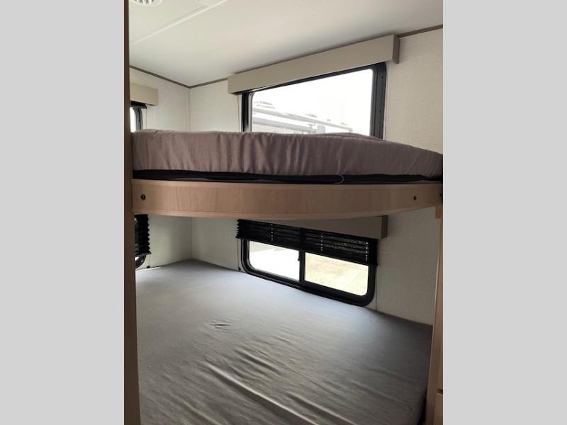 Camping with friends and family just got a whole lot easier in this fifth wheel with double-size bunks and a front private bedroom. Your guests will also have a wardrobe to keep their things tidy, and the bedroom closet will be perfect for your things. If you have other guests stay over, they can sleep on the U-shaped dinette within the slide out or the tri-fold sofa, and there is a 40" high-definition LED TV here to keep everyone entertained on rainy days. Everyone can take turns cleaning up in the full bath that includes a residential walk-in shower, a power vent fan, plus a large vanity top with a deep sink. And you will feel right at home in the front private bedroom with its queen bed, overhead cabinets, and TV prep if you'd like to add a television!