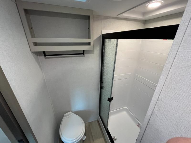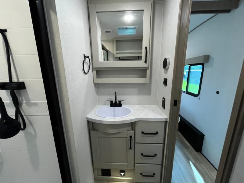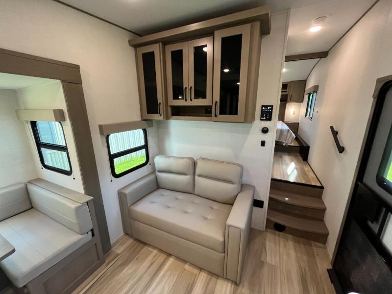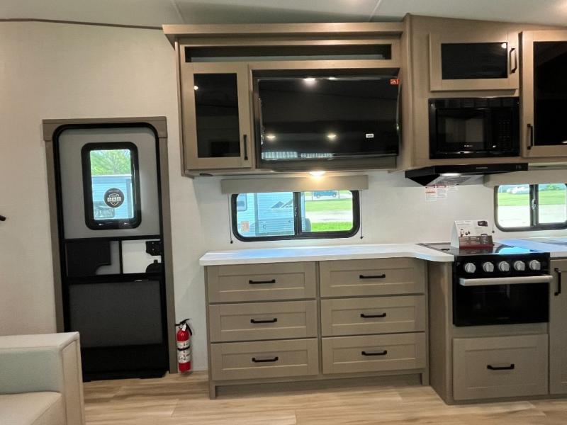 Camping with friends and family just got a whole lot easier in this fifth wheel with double-size bunks and a front private bedroom. Your guests will also have a wardrobe to keep their things tidy, and the bedroom closet will be perfect for your things. If you have other guests stay over, they can sleep on the U-shaped dinette within the slide out or the tri-fold sofa, and there is a 40" high-definition LED TV here to keep everyone entertained on rainy days. Everyone can take turns cleaning up in the full bath that includes a residential walk-in shower, a power vent fan, plus a large vanity top with a deep sink. And you will feel right at home in the front private bedroom with its queen bed, overhead cabinets, and TV prep if you'd like to add a television!