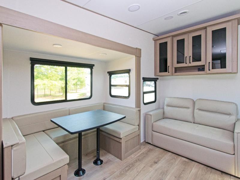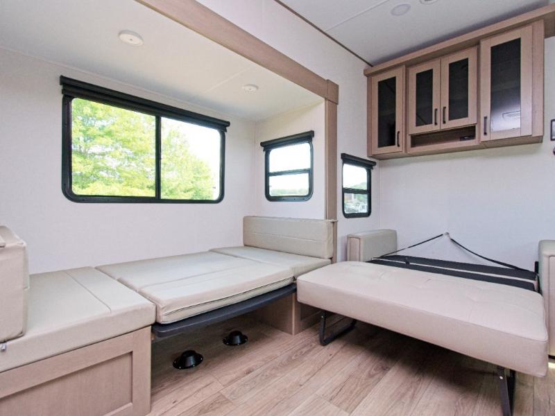 Traveling with friends or family is easy in the Reflection 27BH, thanks to double-size rear bunks and a private front bedroom with a queen bed, overhead storage, and TV prep. Guests can stay comfortable with their own wardrobe space, while additional sleeping options include a tri-fold sofa and a U-shaped dinette in the slide-out.