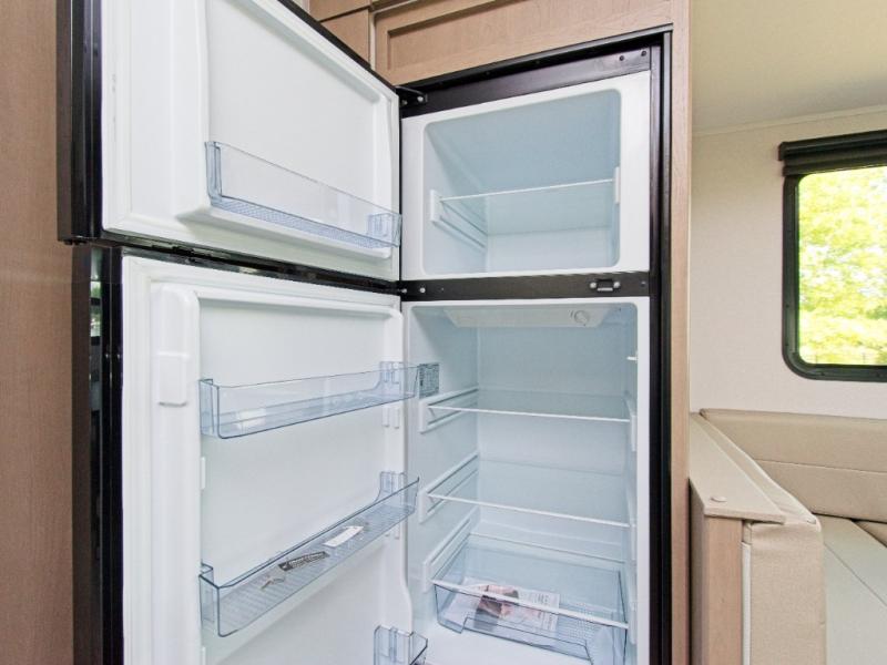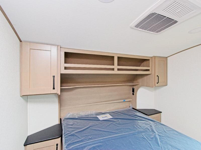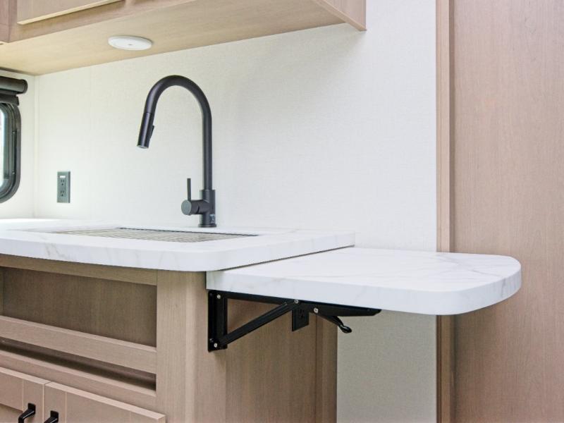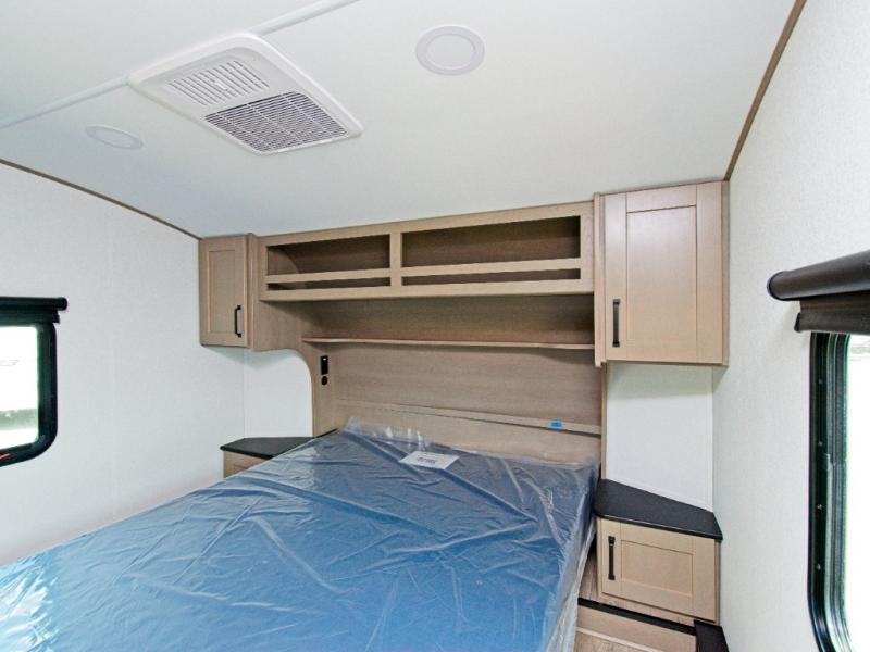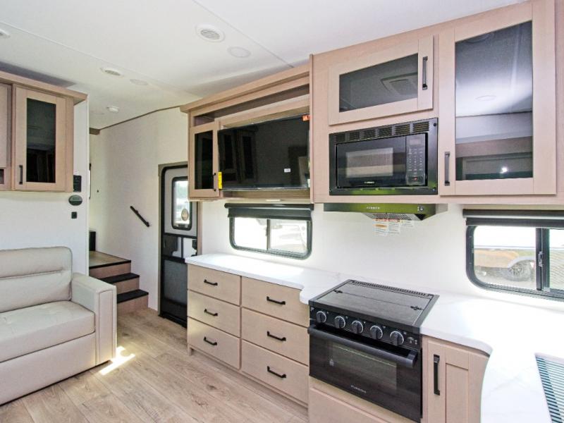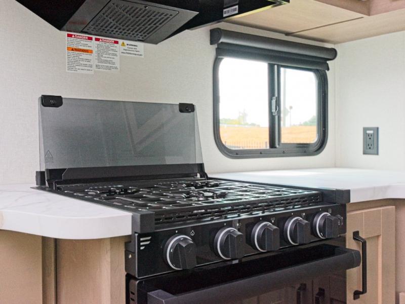 The 10 cu. ft. 12V refrigerator keeps food fresh while off-grid, and the kitchen layout offers plenty of space for meal prep. Outside, the 20' electric awning provides shade at the touch of a button, perfect for relaxing or entertaining outdoors.
