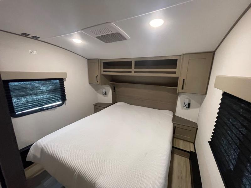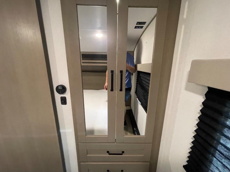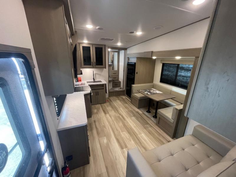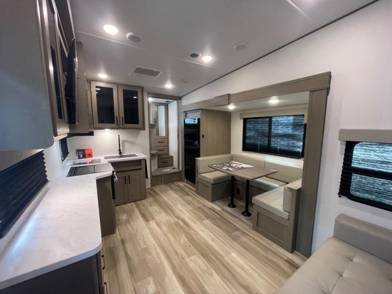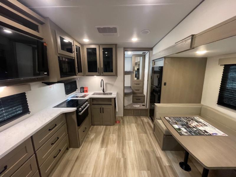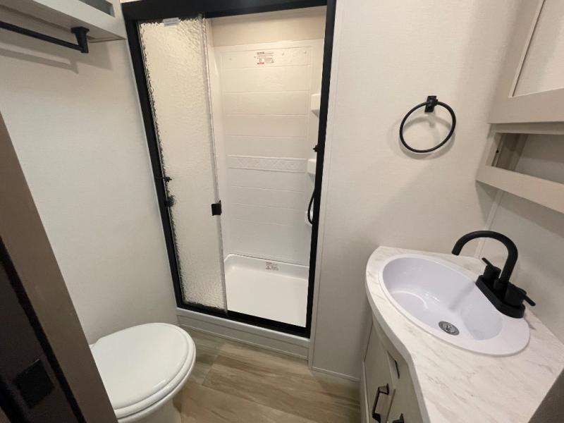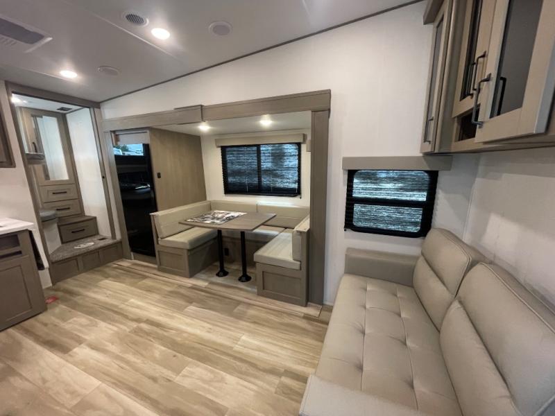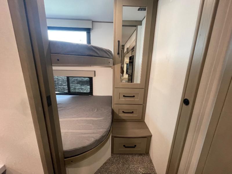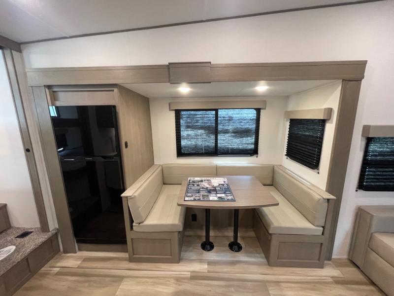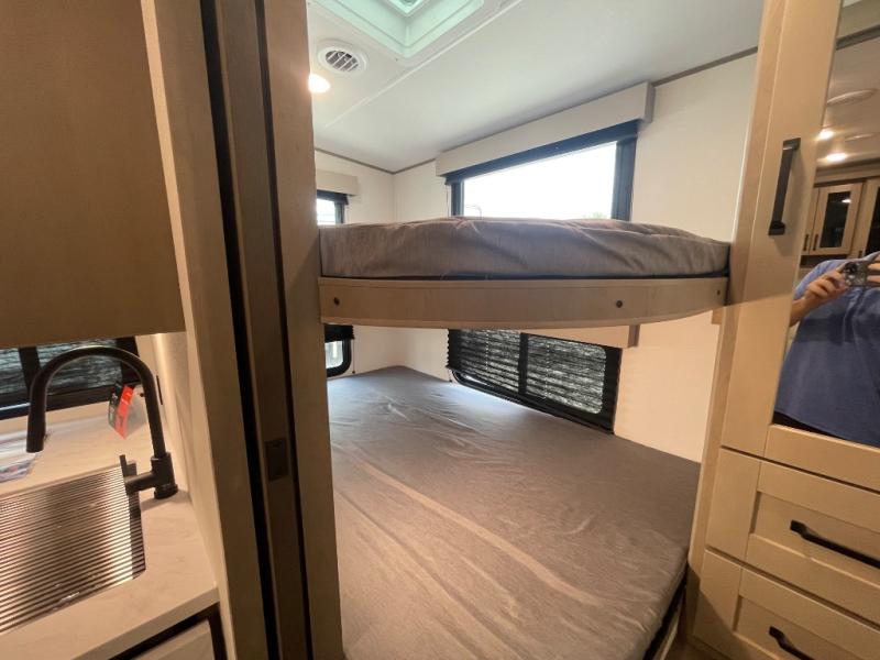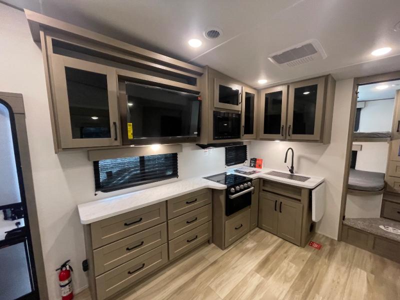 Camping with friends and family just got a whole lot easier in this fifth wheel with double-size bunks and a front private bedroom. Your guests will also have a wardrobe to keep their things tidy, and the bedroom closet will be perfect for your things. If you have other guests stay over, they can sleep on the U-shaped dinette within the slide out or the tri-fold sofa, and there is a 40" high-definition LED TV here to keep everyone entertained on rainy days. Everyone can take turns cleaning up in the full bath that includes a residential walk-in shower, a power vent fan, plus a large vanity top with a deep sink. And you will feel right at home in the front private bedroom with its queen bed, overhead cabinets, and TV prep if you'd like to add a television!