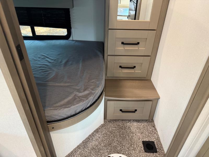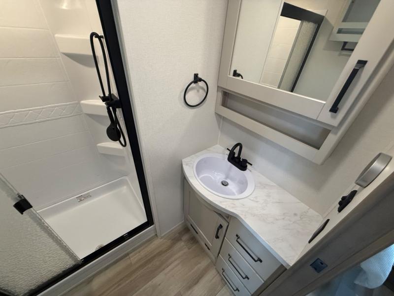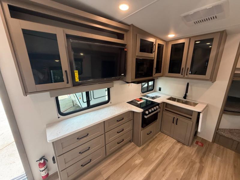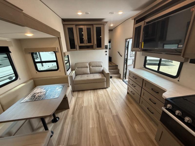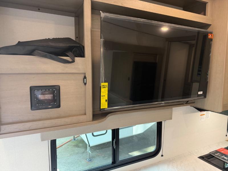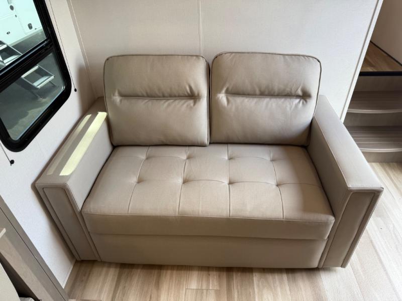 Camping with friends and family just got a whole lot easier in this fifth wheel with double-size bunks and a front private bedroom. Your guests will also have a wardrobe to keep their things tidy, and the bedroom closet will be perfect for your things. If you have other guests stay over, they can sleep on the U-shaped dinette within the slide out or the tri-fold sofa, and there is a 40" high-definition LED TV here to keep everyone entertained on rainy days. Everyone can take turns cleaning up in the full bath that includes a residential walk-in shower, a power vent fan, plus a large vanity top with a deep sink. And you will feel right at home in the front private bedroom with its queen bed, overhead cabinets, and TV prep if you'd like to add a television!