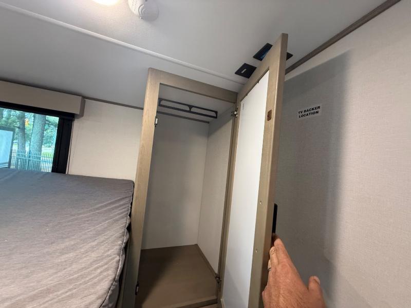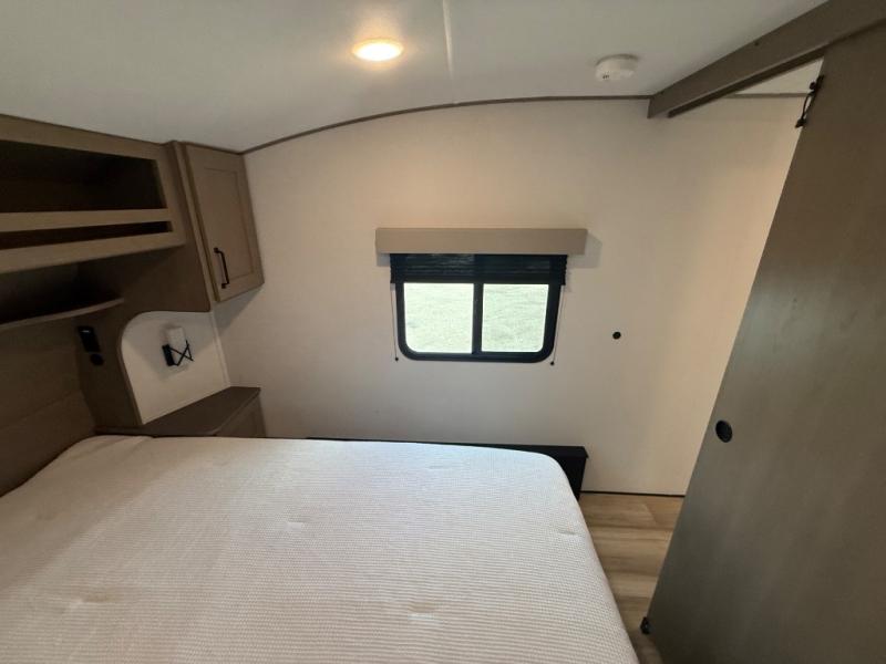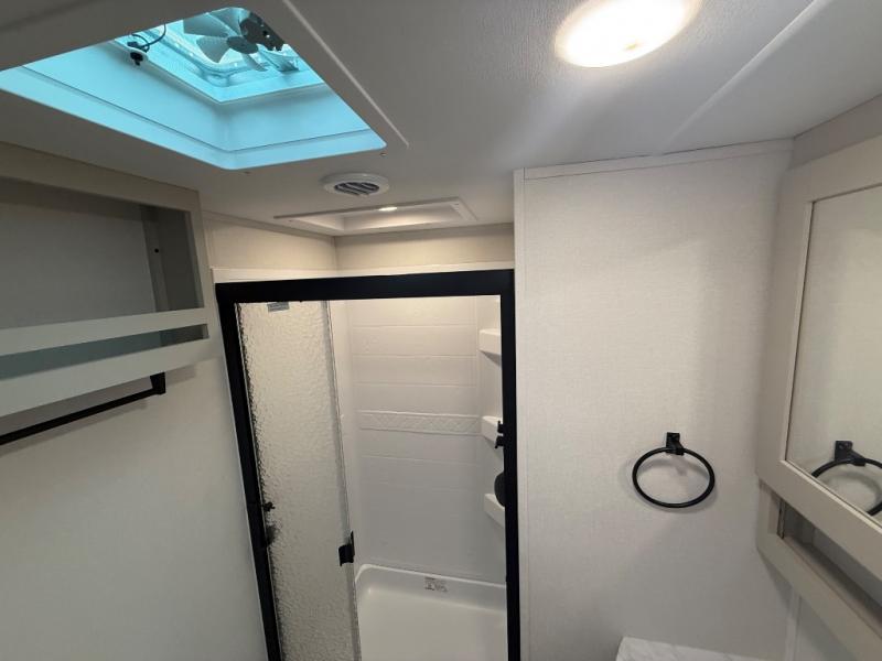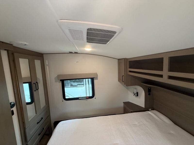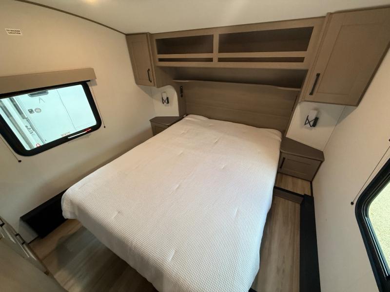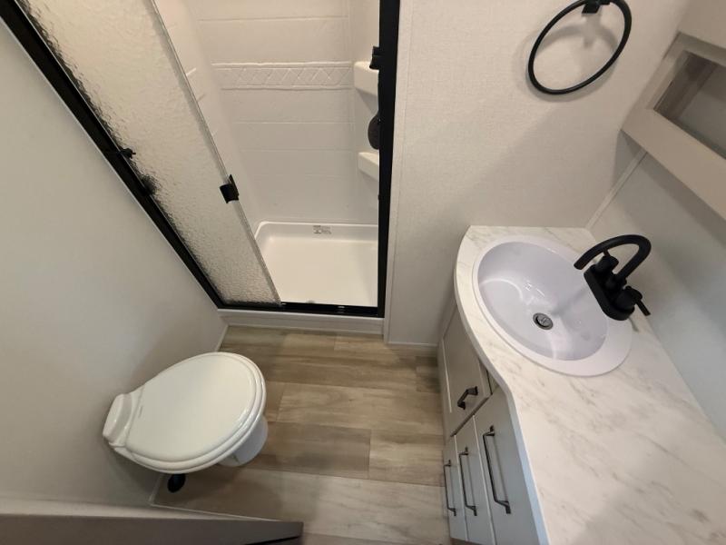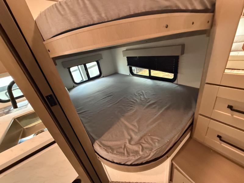 Camping with friends and family just got a whole lot easier in this fifth wheel with double-size bunks and a front private bedroom. Your guests will also have a wardrobe to keep their things tidy, and the bedroom closet will be perfect for your things. If you have other guests stay over, they can sleep on the U-shaped dinette within the slide out or the tri-fold sofa, and there is a 40" high-definition LED TV here to keep everyone entertained on rainy days. Everyone can take turns cleaning up in the full bath that includes a residential walk-in shower, a power vent fan, plus a large vanity top with a deep sink. And you will feel right at home in the front private bedroom with its queen bed, overhead cabinets, and TV prep if you'd like to add a television!
