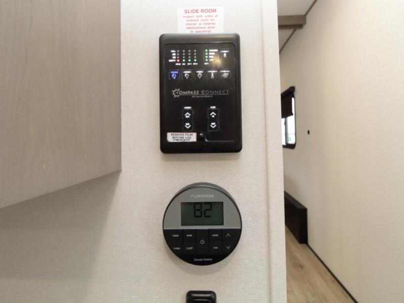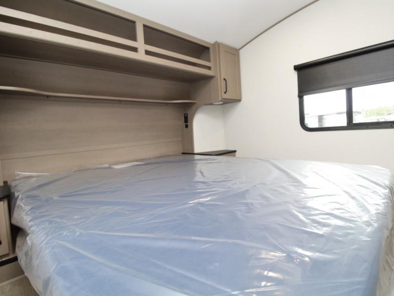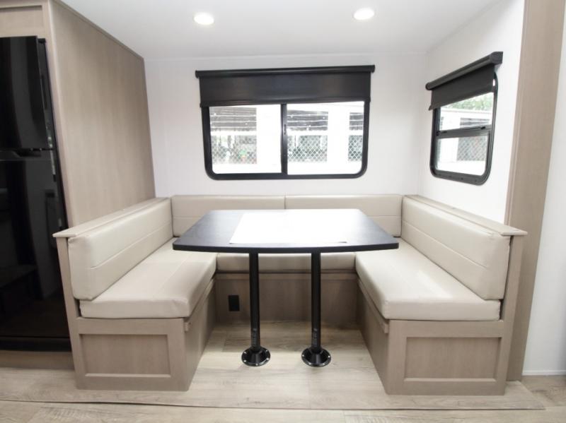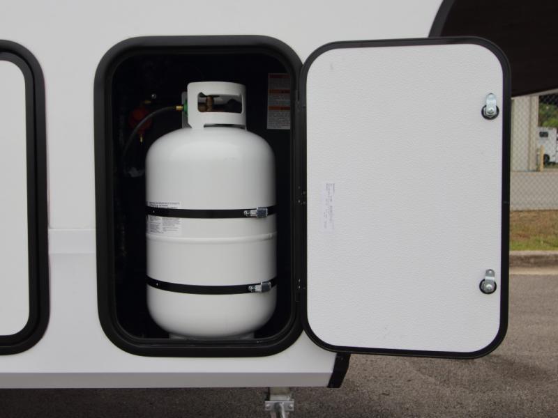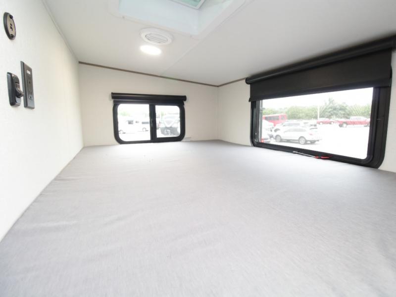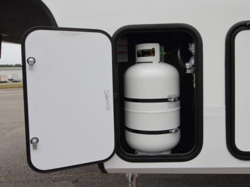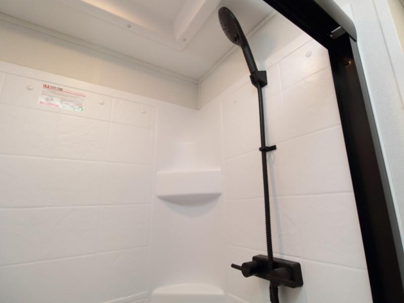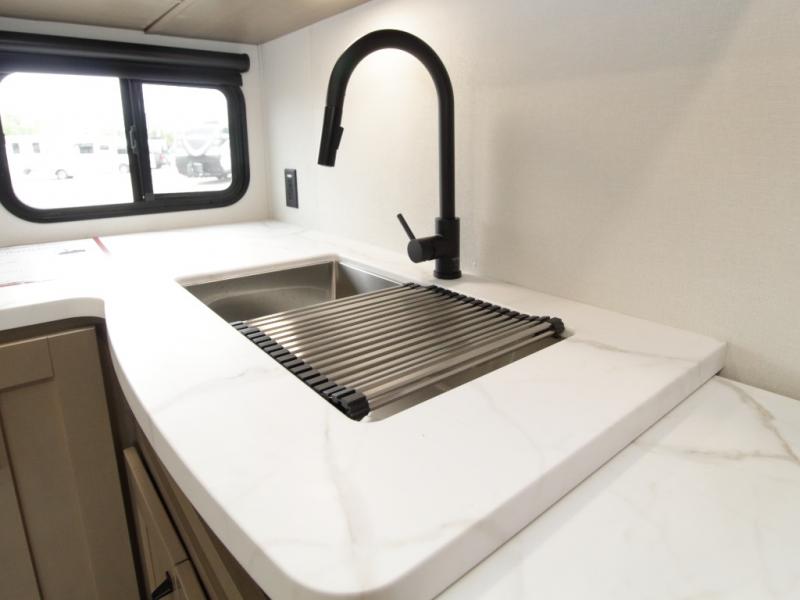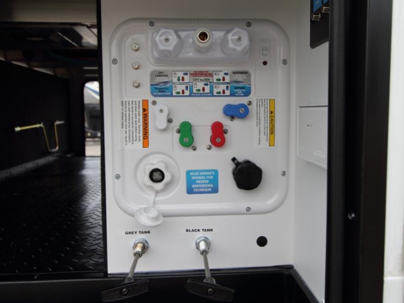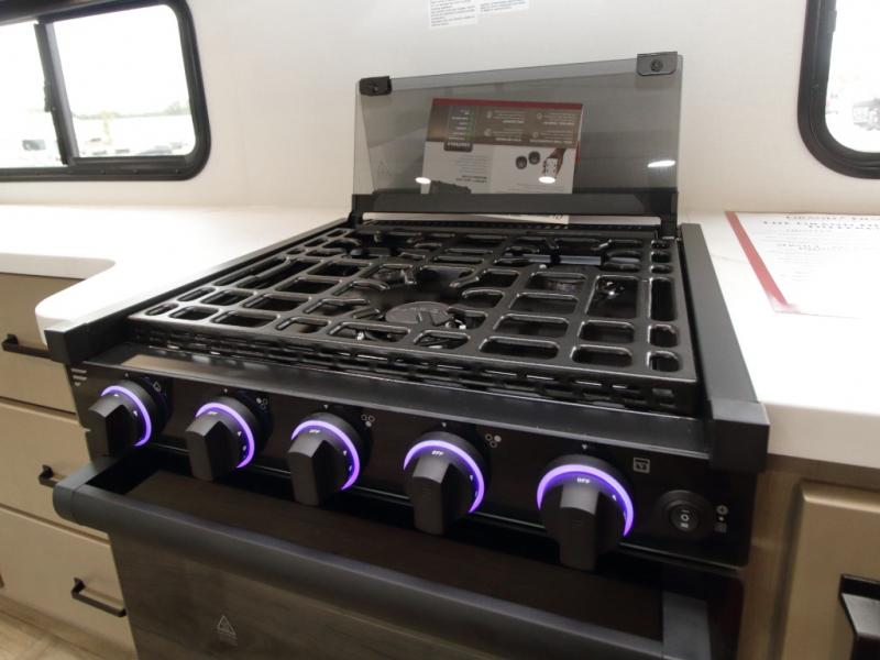 Protection Package provides a heated and enclosed underbelly with circulating heat, double-insulated roof and front cap, plus thermofoil insulation so you can camp year-round. Inside, you’ll enjoy premium Congoleum flooring, residential cabinetry, pleated shades, and modern matte black fixtures.