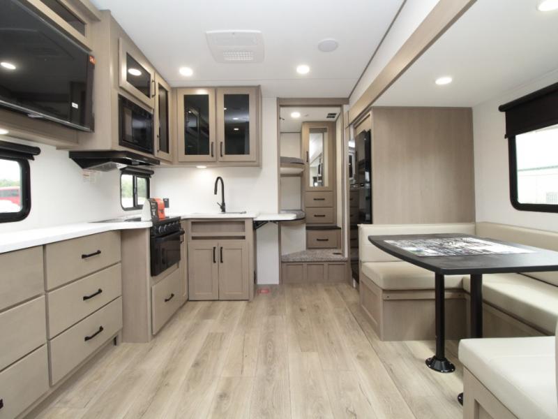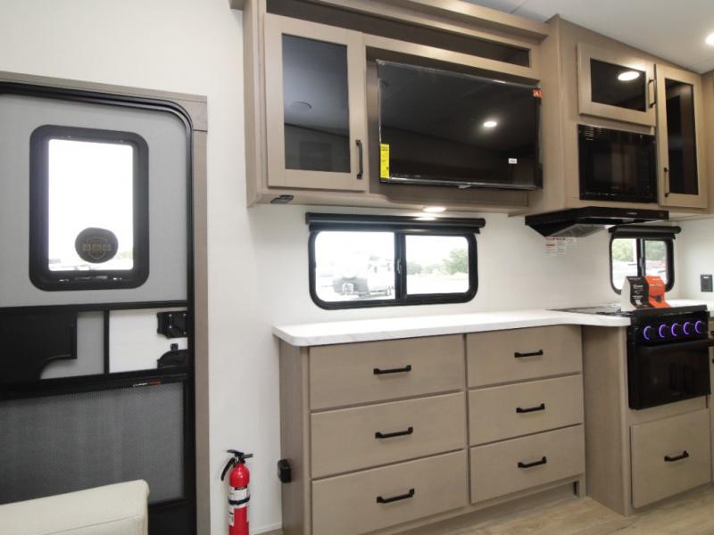 The spacious living area features a 40" HDTV for entertainment, and the kitchen is fully equipped with a 10 cu. ft. 12V refrigerator, three-burner cooktop, microwave, and plenty of counter space. After a day outdoors, refresh in the residential walk-in shower with a large vanity, deep sink, and power vent fan.