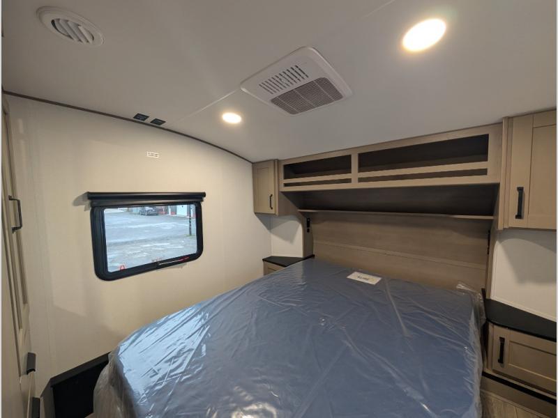 Camping with friends and family just got a whole lot easier in this fifth wheel with double-size bunks and a front private bedroom. Your guests will also have a wardrobe to keep their things tidy, and the bedroom closet will be perfect for your things. If you have other guests stay over, they can sleep on the U-shaped dinette within the slide out or the tri-fold sofa, and there is a 40" high-definition LED TV here to keep everyone entertained on rainy days. Everyone can take turns cleaning up in the full bath that includes a residential walk-in shower, a power vent fan, plus a large vanity top with a deep sink. And you will feel right at home in the front private bedroom with its queen bed, overhead cabinets, and TV prep if you'd like to add a television!