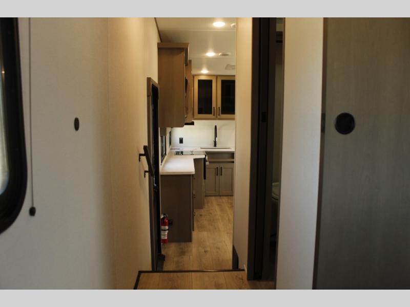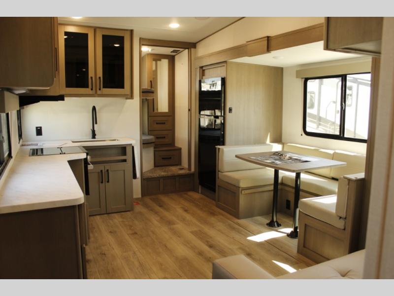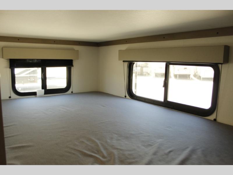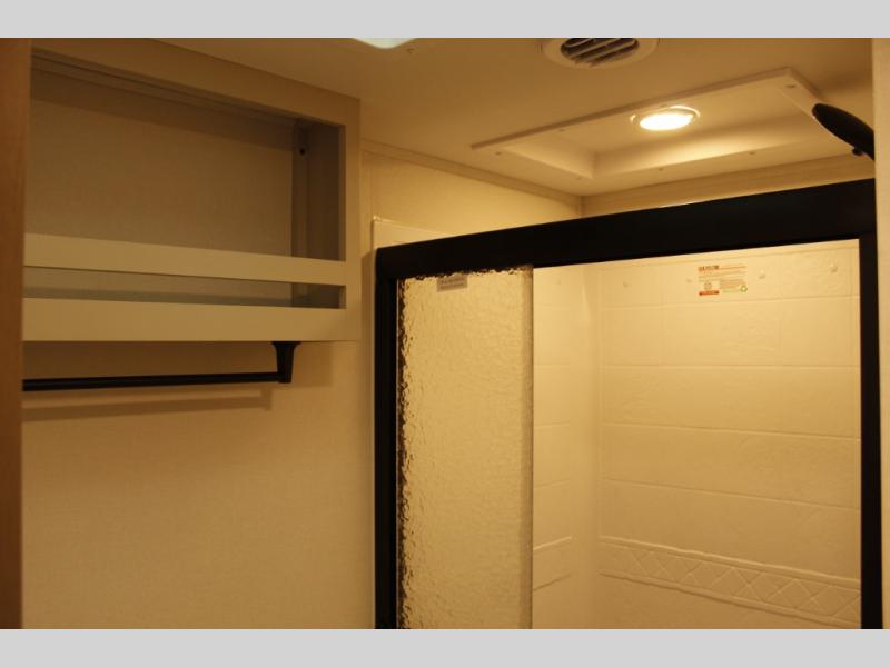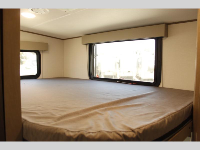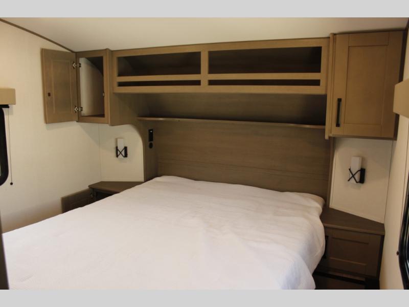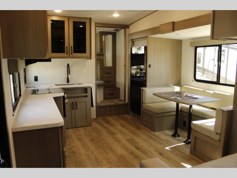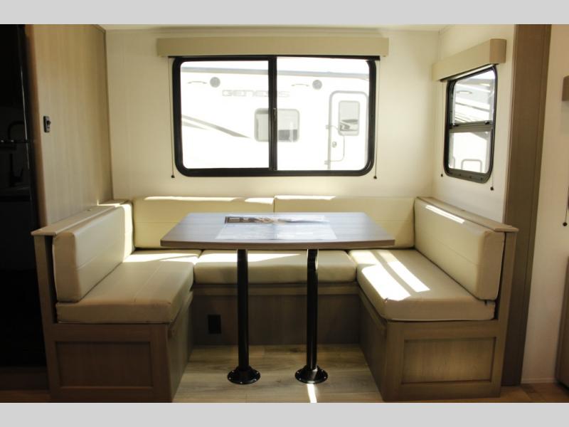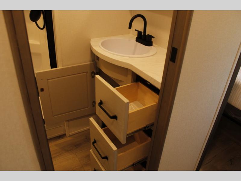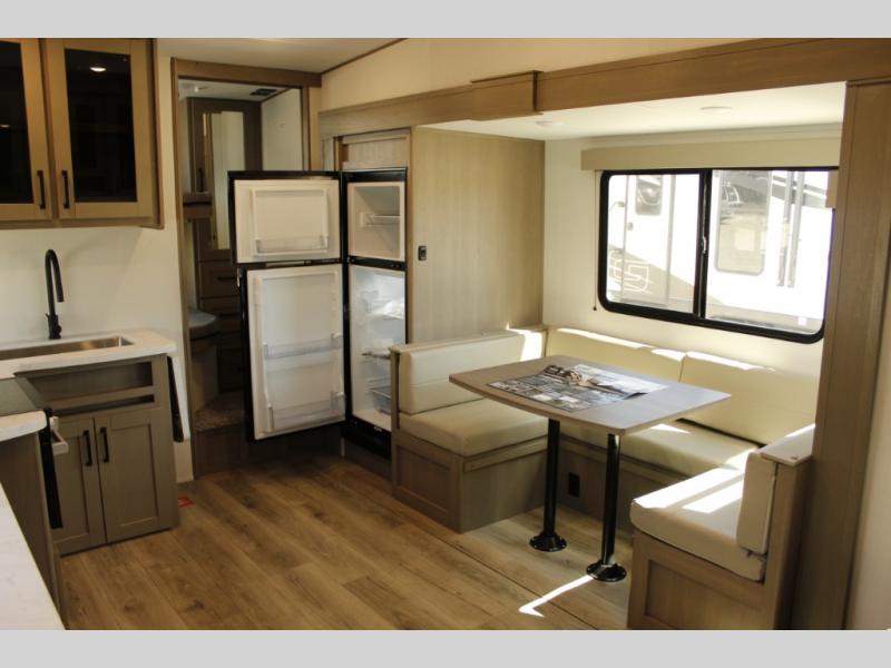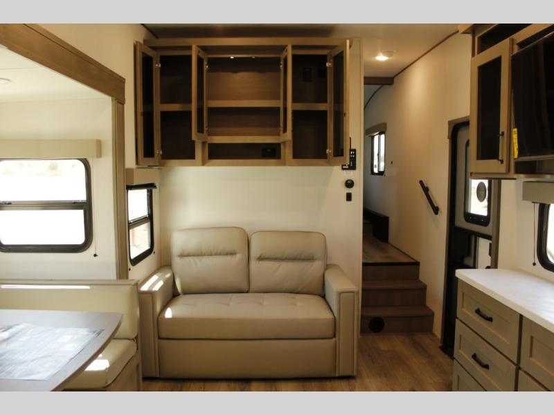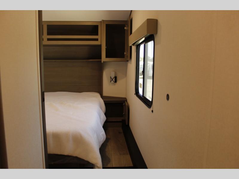 Camping with friends and family just got a whole lot easier in this fifth wheel with double-size bunks and a front private bedroom. Your guests will also have a wardrobe to keep their things tidy, and the bedroom closet will be perfect for your things. If you have other guests stay over, they can sleep on the U-shaped dinette within the slide out or the tri-fold sofa, and there is a 40" high-definition LED TV here to keep everyone entertained on rainy days. Everyone can take turns cleaning up in the full bath that includes a residential walk-in shower, a power vent fan, plus a large vanity top with a deep sink. And you will feel right at home in the front private bedroom with its queen bed, overhead cabinets, and TV prep if you'd like to add a television!