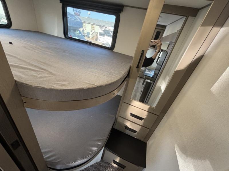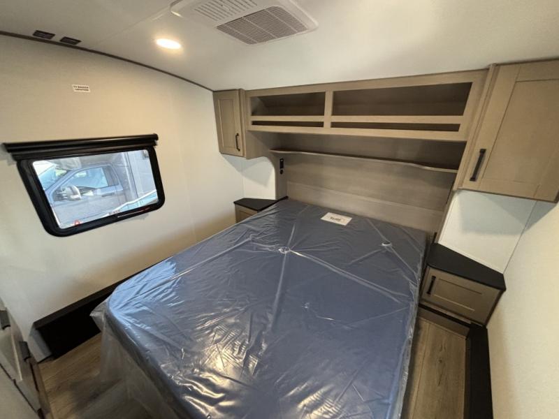 Camping with friends and family just got a whole lot easier in this fifth wheel with double-size bunks and a front private bedroom. Your guests will also have a wardrobe to keep their things tidy, and the bedroom closet will be perfect for your things. If you have other guests stay over, they can sleep on the U-shaped dinette within the slide out or the tri-fold sofa, and there is a 40" high-definition LED TV here to keep everyone entertained on rainy days. Everyone can take turns cleaning up in the full bath that includes a residential walk-in shower, a power vent fan, plus a large vanity top with a deep sink. And you will feel right at home in the front private bedroom with its queen bed, overhead cabinets, and TV prep if you'd like to add a television!