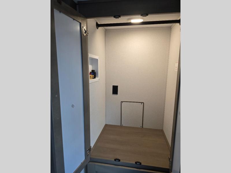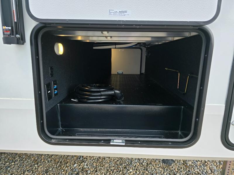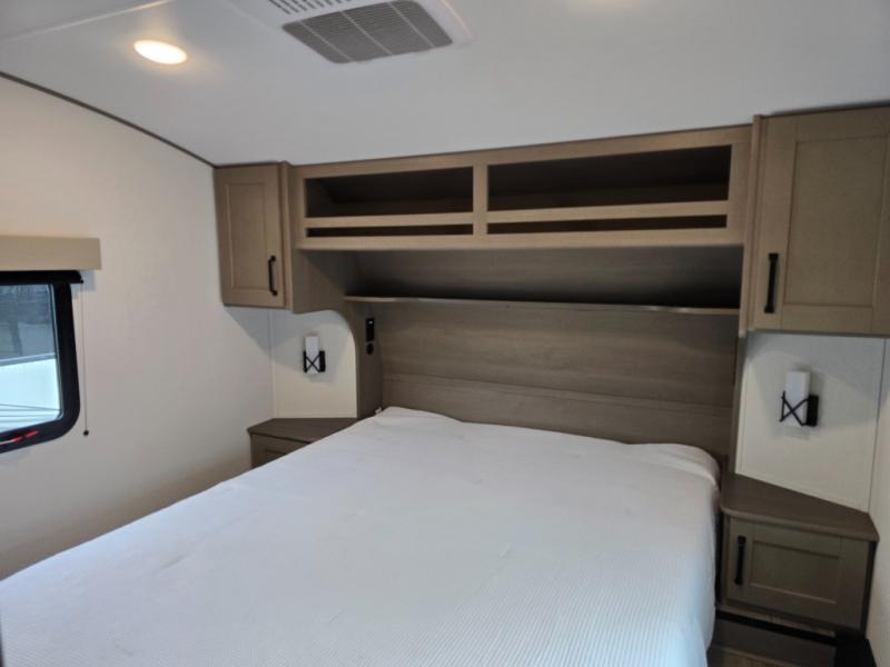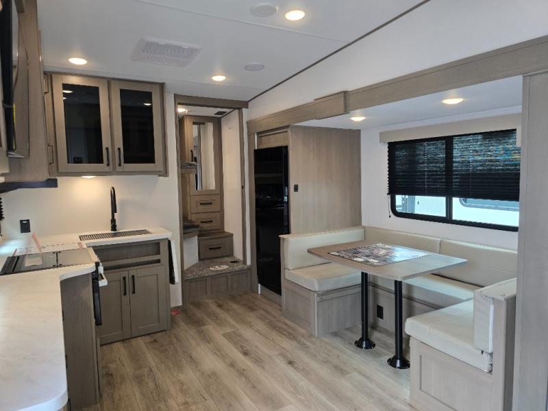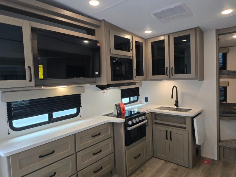 Camping with friends and family just got a whole lot easier in this fifth wheel with double-size bunks and a front private bedroom. Your guests will also have a wardrobe to keep their things tidy, and the bedroom closet will be perfect for your things. If you have other guests stay over, they can sleep on the U-shaped dinette within the slide out or the tri-fold sofa, and there is a 40" high-definition LED TV here to keep everyone entertained on rainy days. Everyone can take turns cleaning up in the full bath that includes a residential walk-in shower, a power vent fan, plus a large vanity top with a deep sink. And you will feel right at home in the front private bedroom with its queen bed, overhead cabinets, and TV prep if you'd like to add a television!