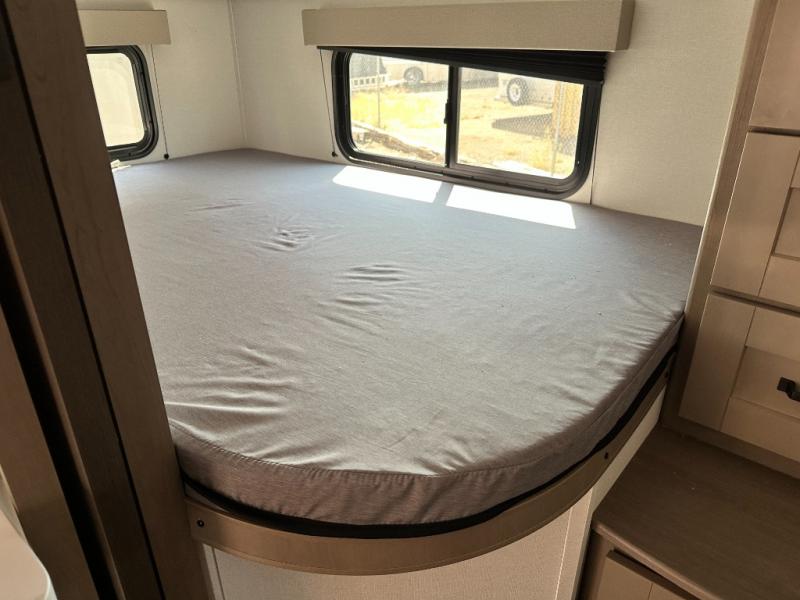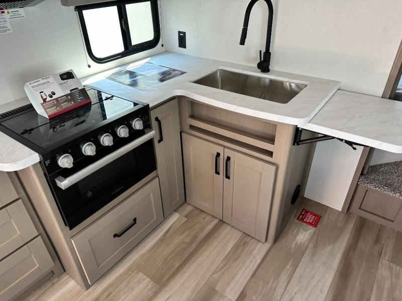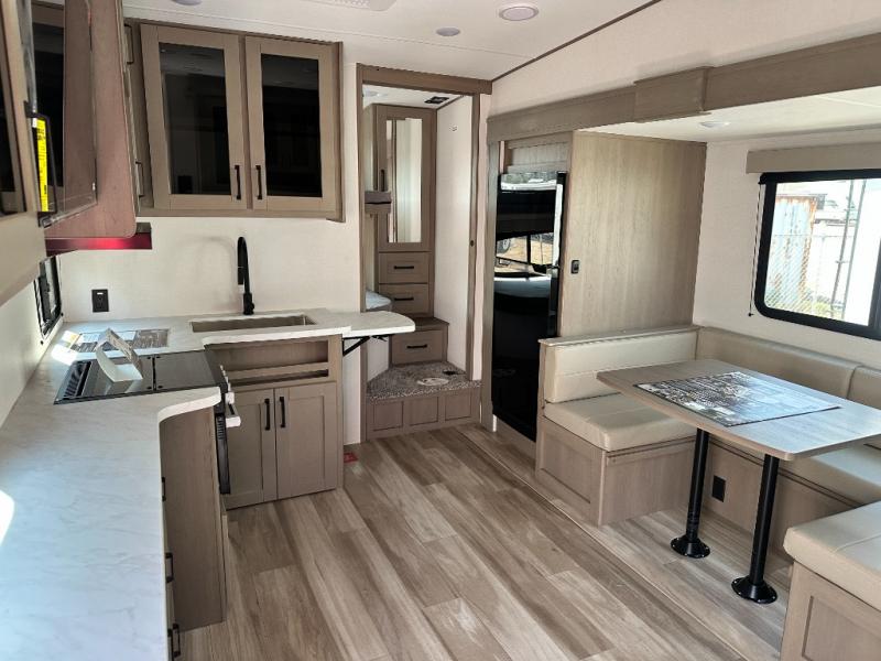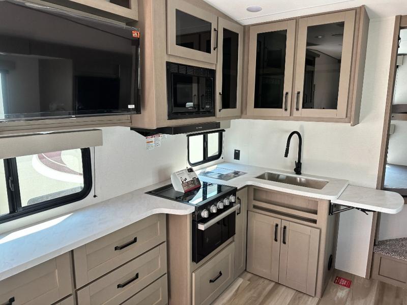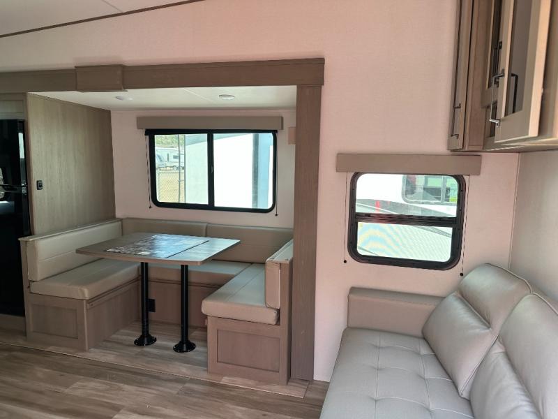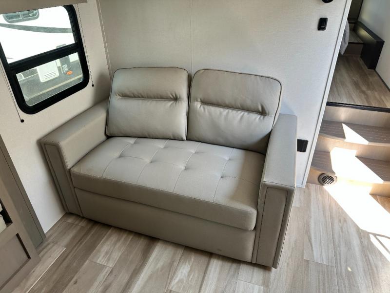 Camping with friends and family just got a whole lot easier in this fifth wheel with double-size bunks and a front private bedroom. Your guests will also have a wardrobe to keep their things tidy, and the bedroom closet will be perfect for your things. If you have other guests stay over, they can sleep on the U-shaped dinette within the slide out or the tri-fold sofa, and there is a 40" high-definition LED TV here to keep everyone entertained on rainy days. Everyone can take turns cleaning up in the full bath that includes a residential walk-in shower, a power vent fan, plus a large vanity top with a deep sink. And you will feel right at home in the front private bedroom with its queen bed, overhead cabinets, and TV prep if you'd like to add a television!