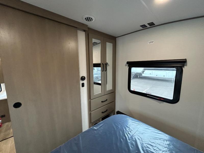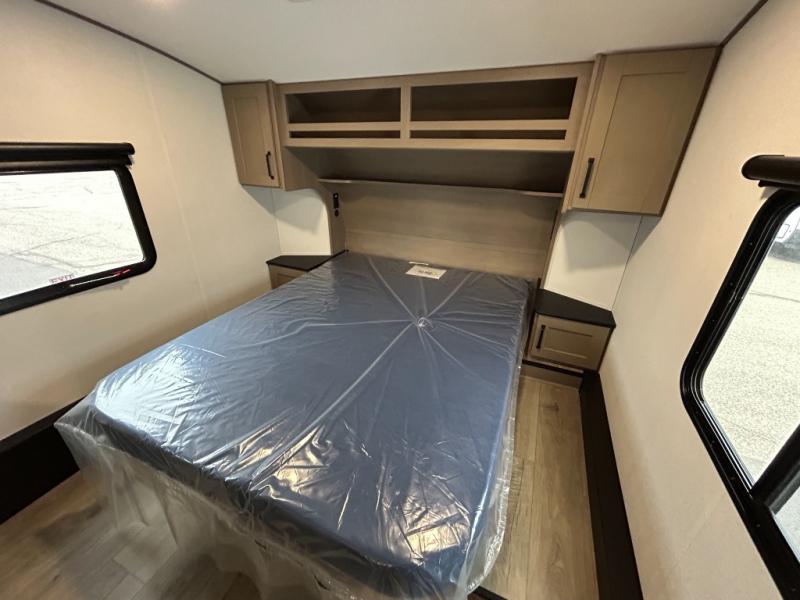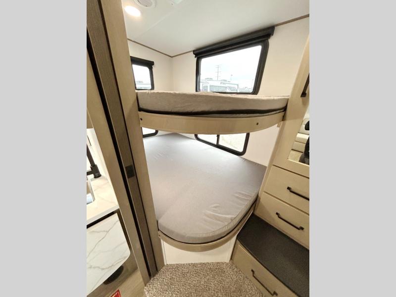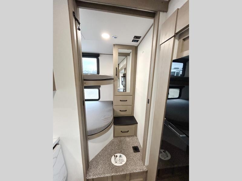 Camping with friends and family just got a whole lot easier in this fifth wheel with double-size bunks and a front private bedroom. Your guests will also have a wardrobe to keep their things tidy, and the bedroom closet will be perfect for your things. If you have other guests stay over, they can sleep on the U-shaped dinette within the slide out or the tri-fold sofa, and there is a 40" high-definition LED TV here to keep everyone entertained on rainy days. Everyone can take turns cleaning up in the full bath that includes a residential walk-in shower, a power vent fan, plus a large vanity top with a deep sink. And you will feel right at home in the front private bedroom with its queen bed, overhead cabinets, and TV prep if you'd like to add a television!