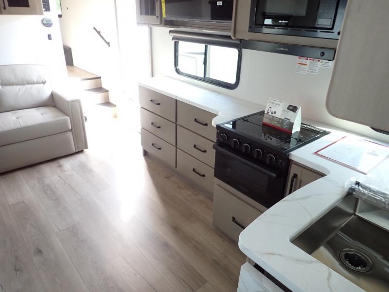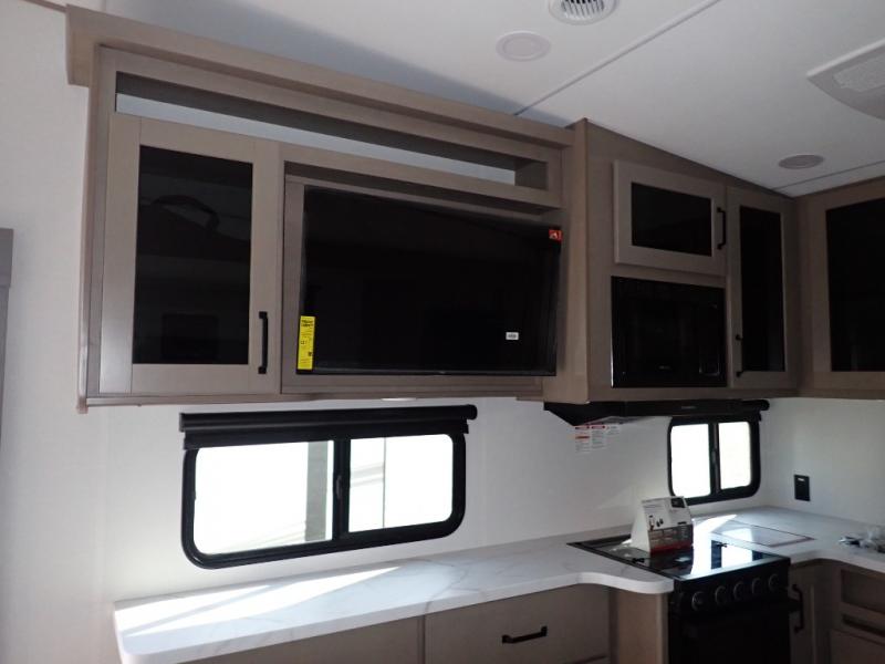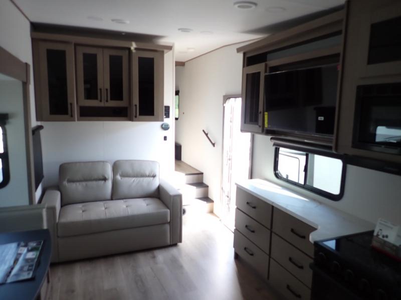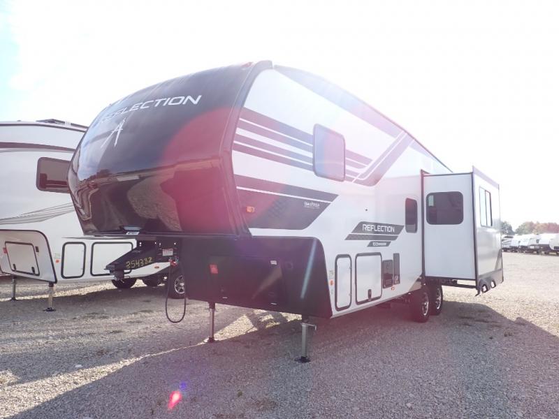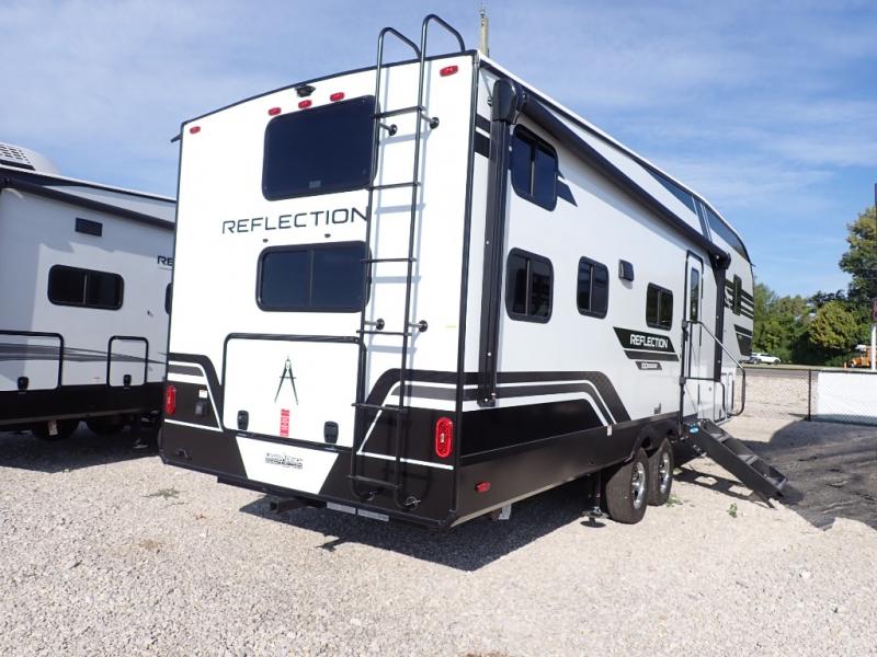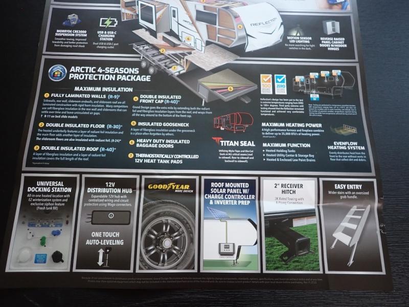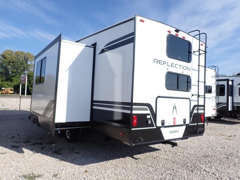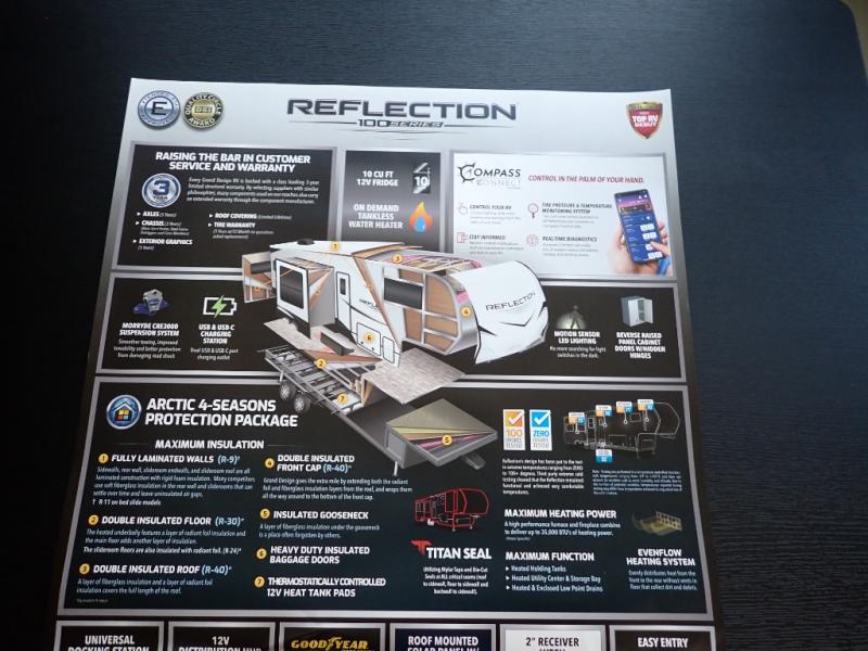 Each Reflection 100 Series fifth wheel by Grand Design is affordable and packed with luxury for unforgettable camping memories! The MorRyde CRE3000 suspension system and Goodyear Endurance tires will provide smooth towing from home to campground. And the solar package with a 180W solar panel, 60 Amp charge controller and 12V refrigerator will allow you to camp for longer periods of time and in more locations! A heated and enclosed underbelly with circulating heat is included in the Arctic 4-Seasons Protection Package, along with a double insulated roof and front cap, and thermofoil insulation under the holding tanks so you can camp all year long if you choose. You will appreciate having an on-demand water heater for hot showers after exploring, and the universal all-in-one docking station will let you monitor your RVs tanks levels and functions with ease. These models also include many luxurious interior features, such as premium Congoleum flooring, pleated shades, residential cabinetry, and matte black fixtures and hardware. Don't let the Reflection 100 Series fifth wheels pass you by!