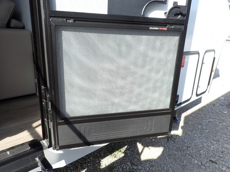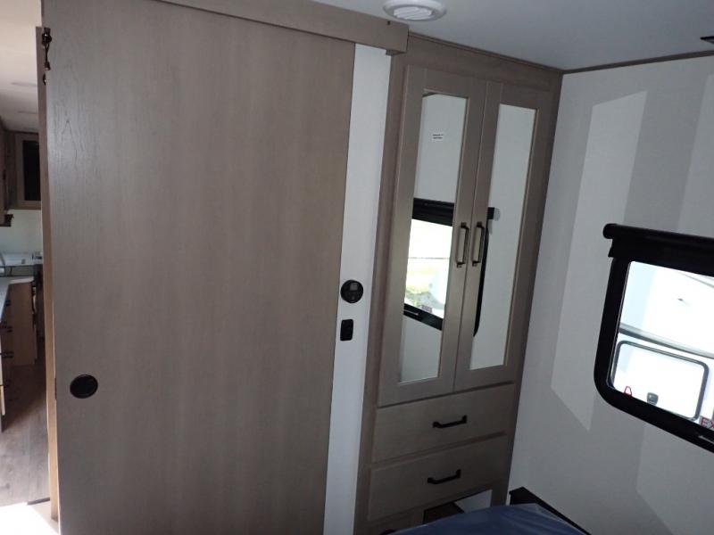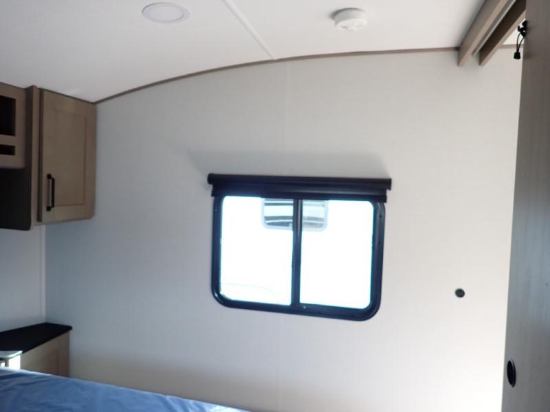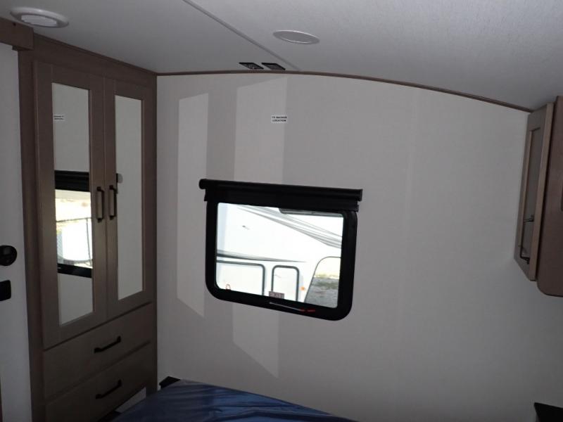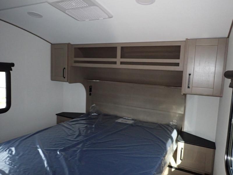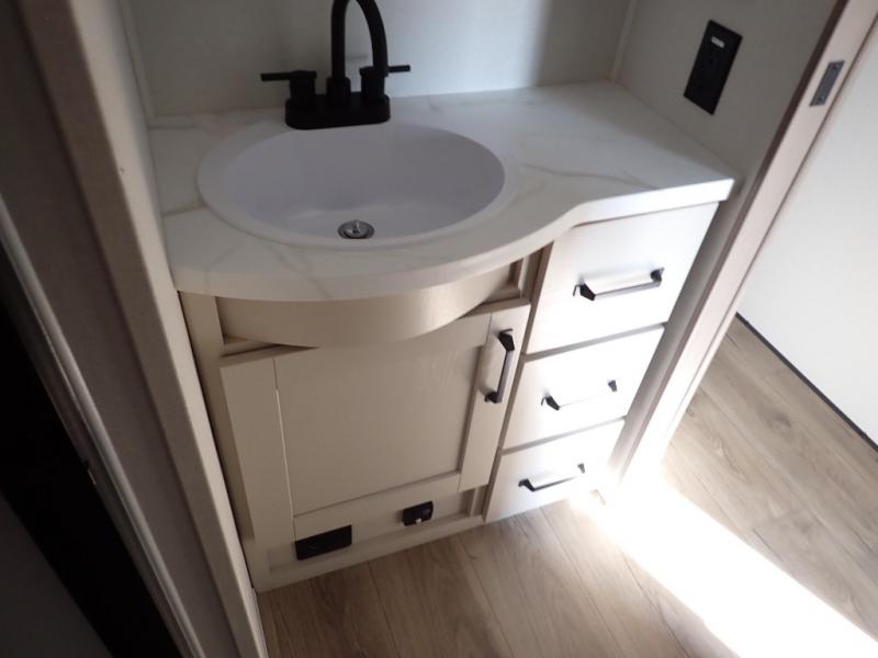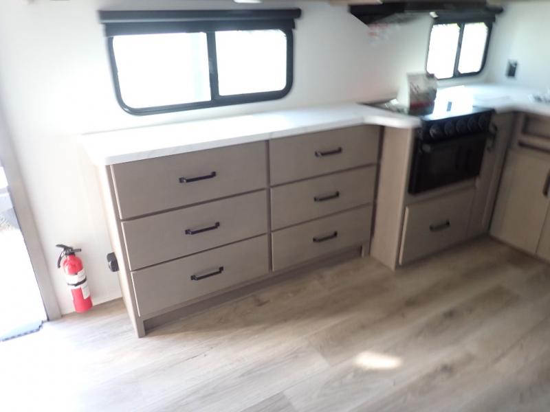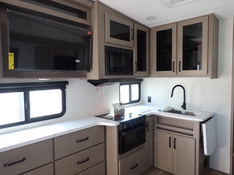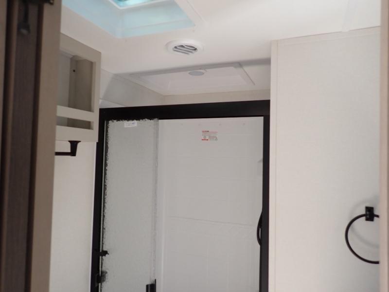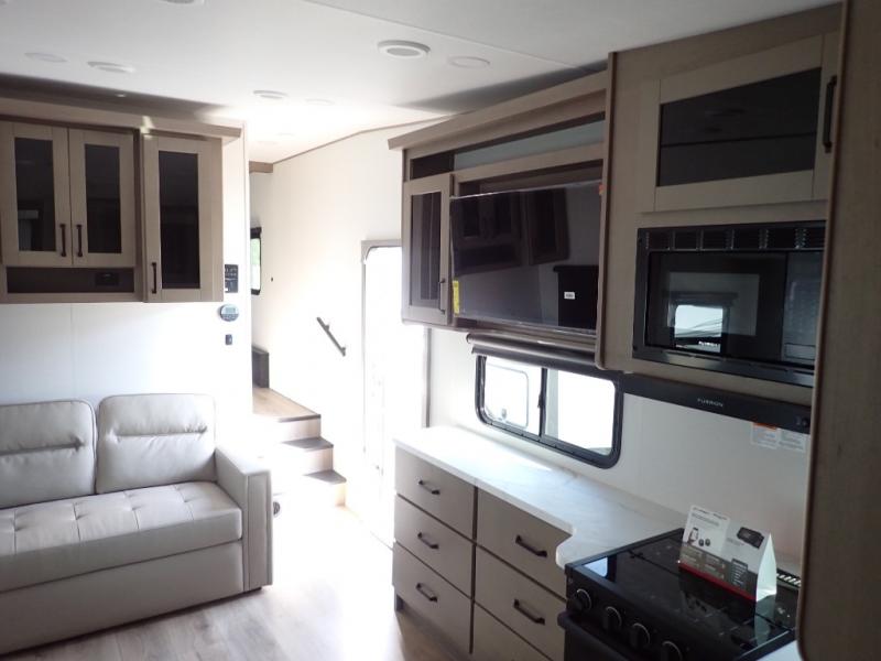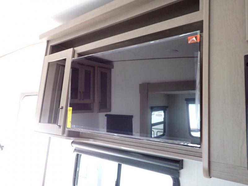Camping with friends and family just got a whole lot easier in this fifth wheel with double-size bunks and a front private bedroom. Your guests will also have a wardrobe to keep their things tidy, and the bedroom closet will be perfect for your things. If you have other guests stay over, they can sleep on the U-shaped dinette within the slide out or the tri-fold sofa, and there is a 40" high-definition LED TV here to keep everyone entertained on rainy days. Everyone can take turns cleaning up in the full bath that includes a residential walk-in shower, a power vent fan, plus a large vanity top with a deep sink. And you will feel right at home in the front private bedroom with its queen bed, overhead cabinets, and TV prep if you'd like to add a television!