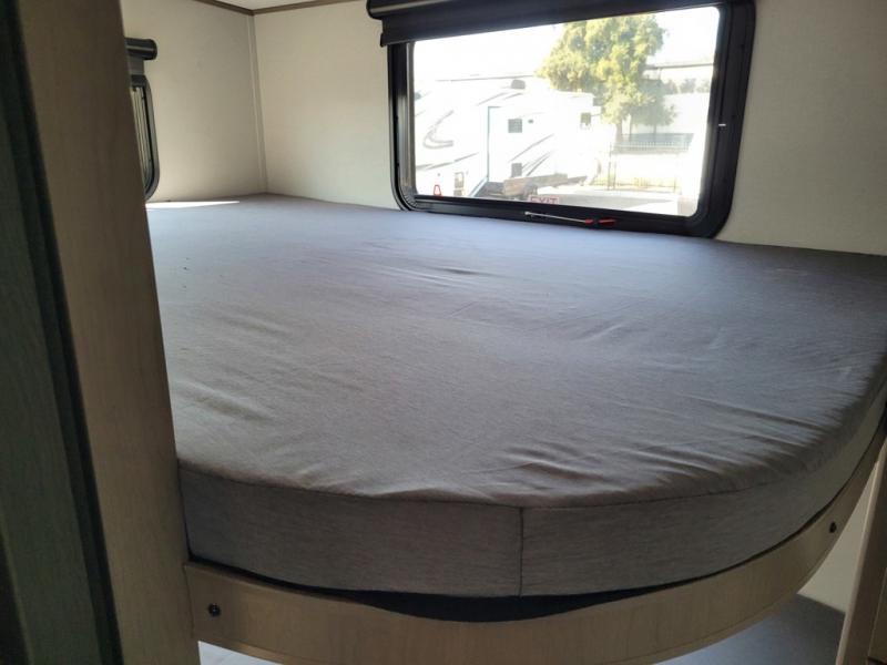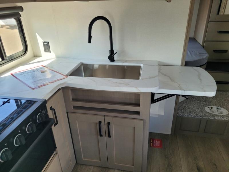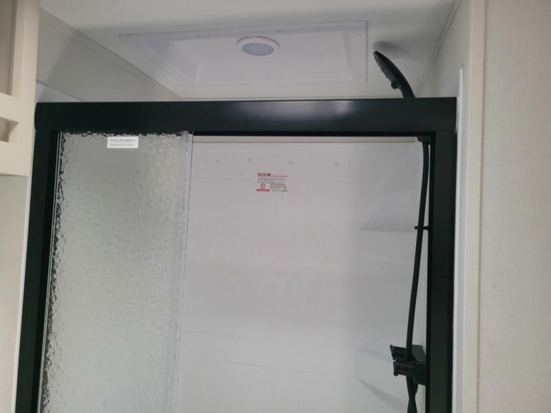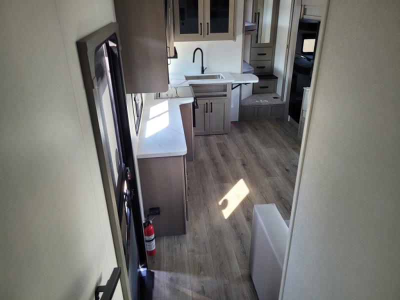 Camping with friends and family just got a whole lot easier in this fifth wheel with double-size bunks and a front private bedroom. Your guests will also have a wardrobe to keep their things tidy, and the bedroom closet will be perfect for your things. If you have other guests stay over, they can sleep on the U-shaped dinette within the slide out or the tri-fold sofa, and there is a 40" high-definition LED TV here to keep everyone entertained on rainy days. Everyone can take turns cleaning up in the full bath that includes a residential walk-in shower, a power vent fan, plus a large vanity top with a deep sink. And you will feel right at home in the front private bedroom with its queen bed, overhead cabinets, and TV prep if you'd like to add a television!