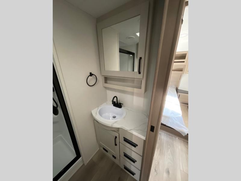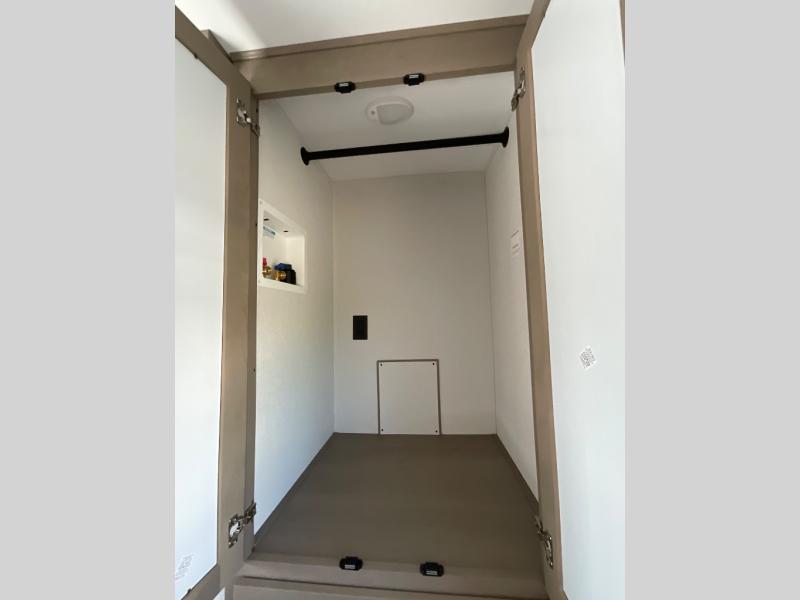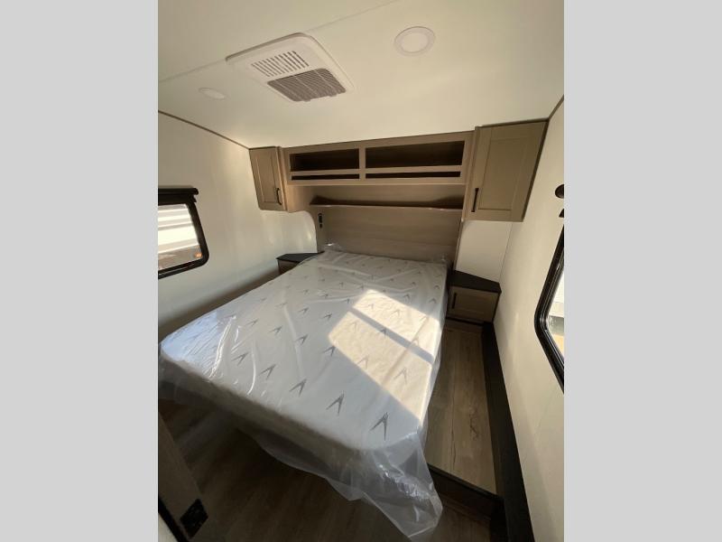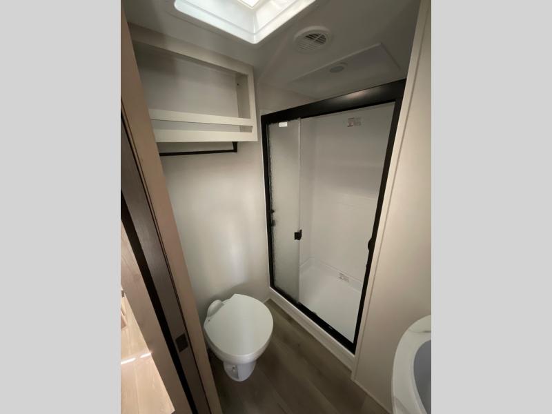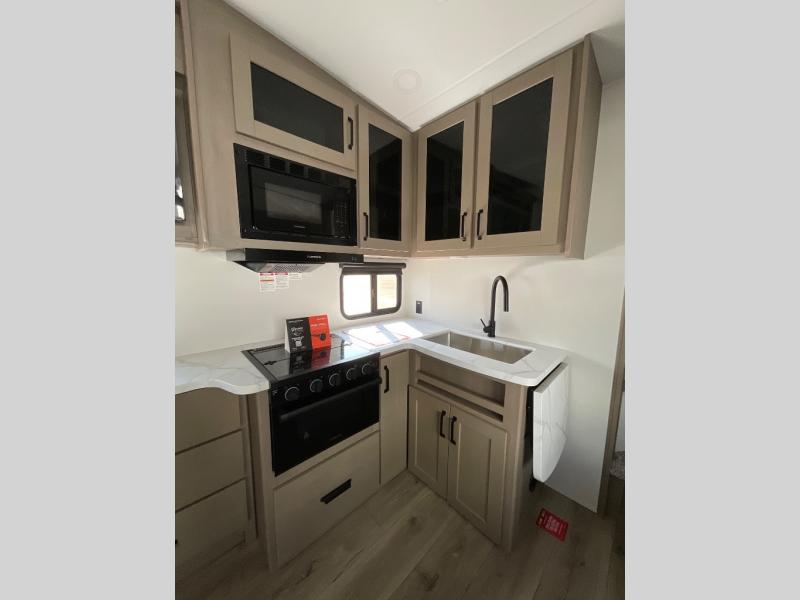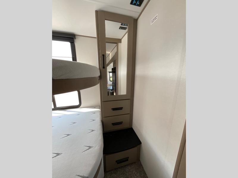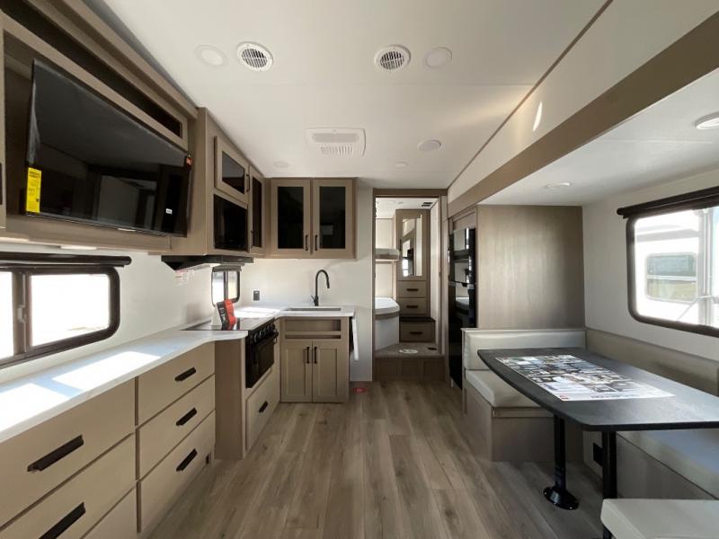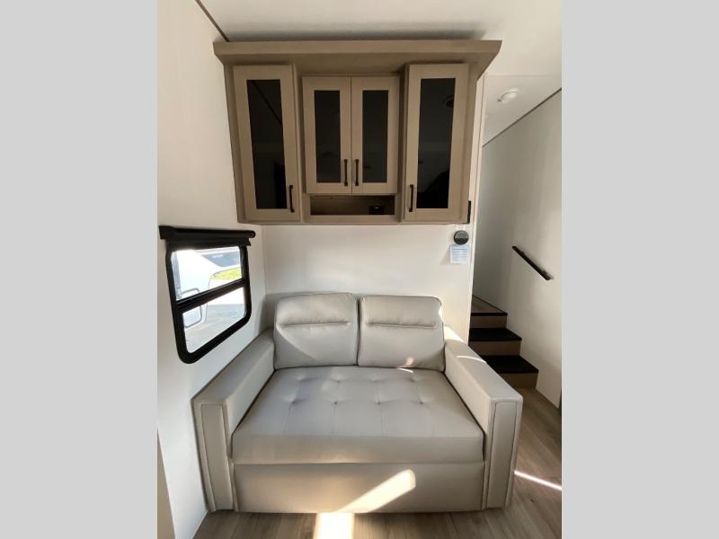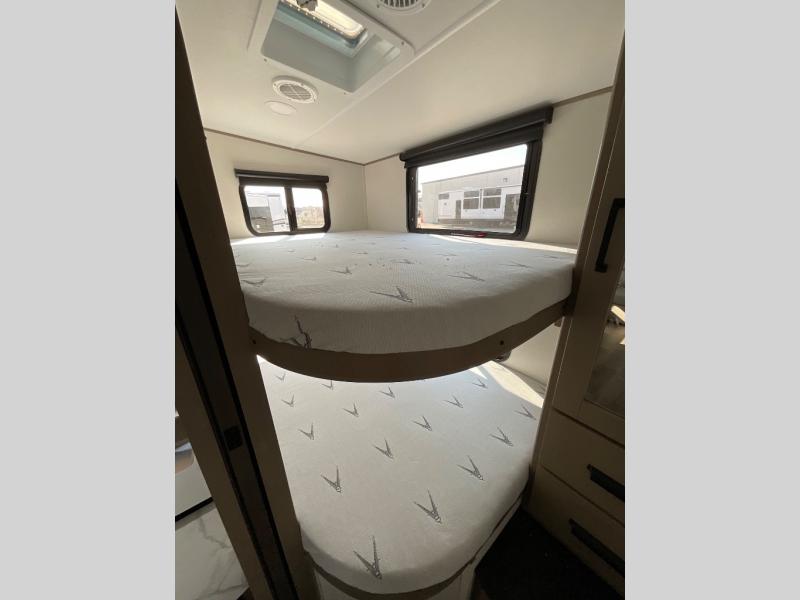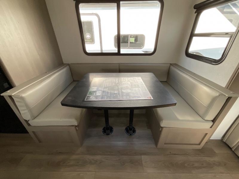 Camping with friends and family just got a whole lot easier in this fifth wheel with double-size bunks and a front private bedroom. Your guests will also have a wardrobe to keep their things tidy, and the bedroom closet will be perfect for your things. If you have other guests stay over, they can sleep on the U-shaped dinette within the slide out or the tri-fold sofa, and there is a 40" high-definition LED TV here to keep everyone entertained on rainy days. Everyone can take turns cleaning up in the full bath that includes a residential walk-in shower, a power vent fan, plus a large vanity top with a deep sink. And you will feel right at home in the front private bedroom with its queen bed, overhead cabinets, and TV prep if you'd like to add a television!