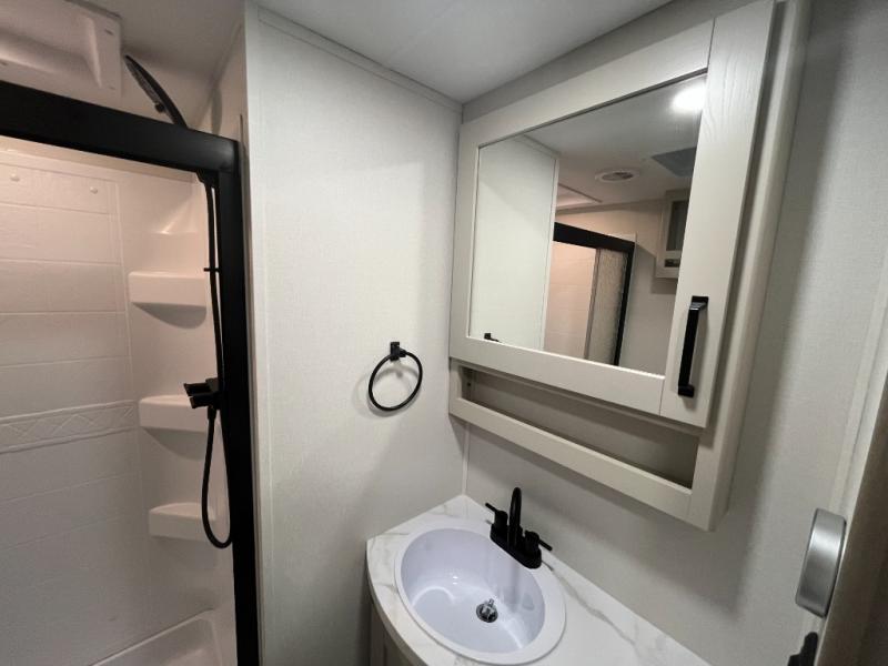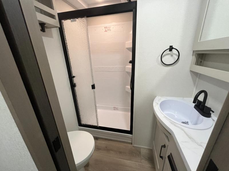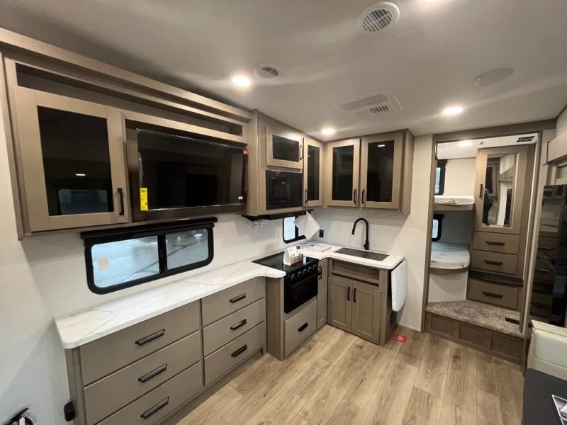 Camping with friends and family just got a whole lot easier in this fifth wheel with double-size bunks and a front private bedroom. Your guests will also have a wardrobe to keep their things tidy, and the bedroom closet will be perfect for your things. If you have other guests stay over, they can sleep on the U-shaped dinette within the slide out or the tri-fold sofa, and there is a 40" high-definition LED TV here to keep everyone entertained on rainy days. Everyone can take turns cleaning up in the full bath that includes a residential walk-in shower, a power vent fan, plus a large vanity top with a deep sink. And you will feel right at home in the front private bedroom with its queen bed, overhead cabinets, and TV prep if you'd like to add a television!