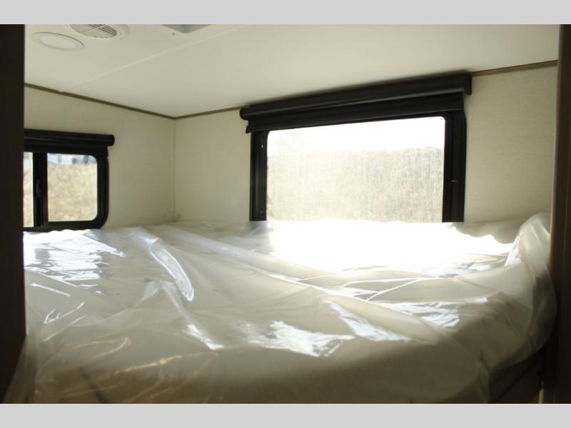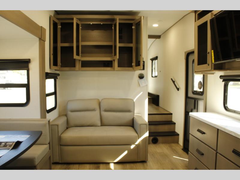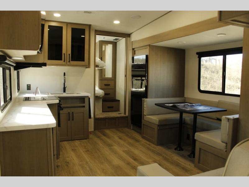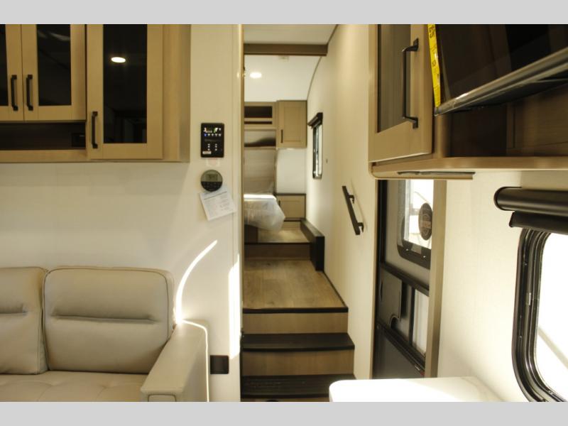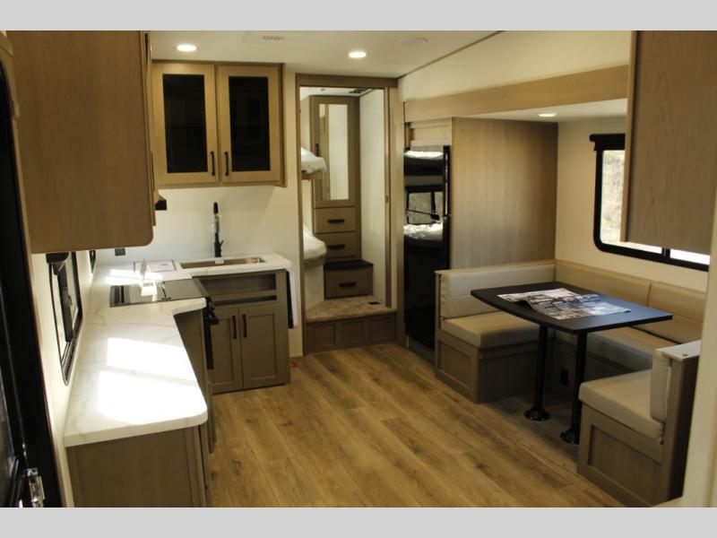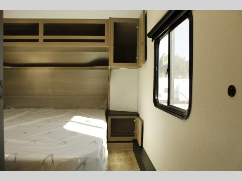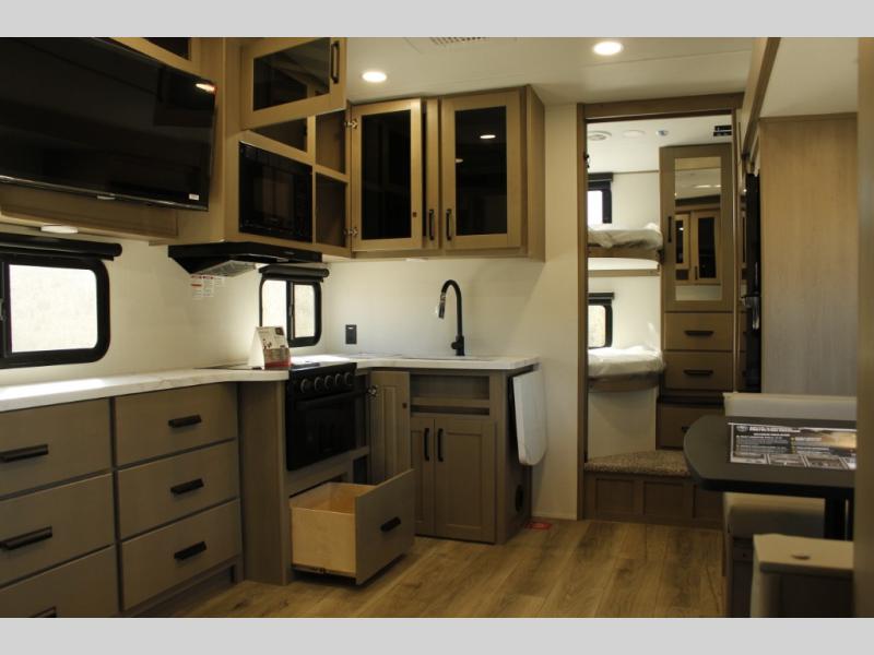 Camping with friends and family just got a whole lot easier in this fifth wheel with double-size bunks and a front private bedroom. Your guests will also have a wardrobe to keep their things tidy, and the bedroom closet will be perfect for your things. If you have other guests stay over, they can sleep on the U-shaped dinette within the slide out or the tri-fold sofa, and there is a 40" high-definition LED TV here to keep everyone entertained on rainy days. Everyone can take turns cleaning up in the full bath that includes a residential walk-in shower, a power vent fan, plus a large vanity top with a deep sink. And you will feel right at home in the front private bedroom with its queen bed, overhead cabinets, and TV prep if you'd like to add a television!
