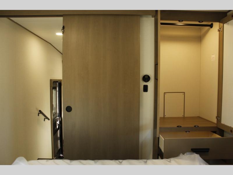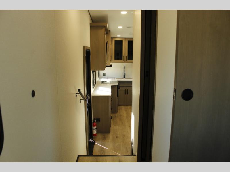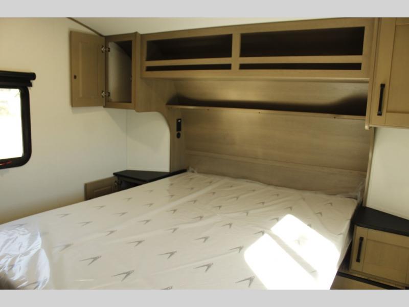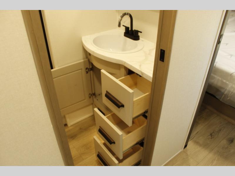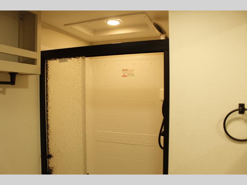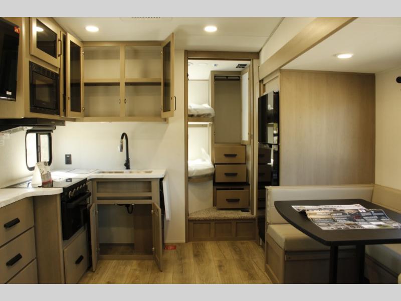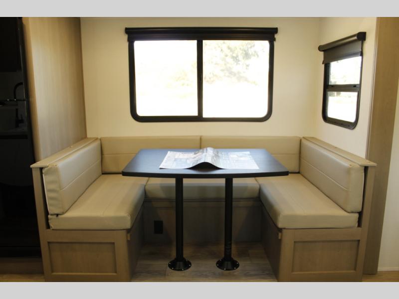 Camping with friends and family just got a whole lot easier in this fifth wheel with double-size bunks and a front private bedroom. Your guests will also have a wardrobe to keep their things tidy, and the bedroom closet will be perfect for your things. If you have other guests stay over, they can sleep on the U-shaped dinette within the slide out or the tri-fold sofa, and there is a 40" high-definition LED TV here to keep everyone entertained on rainy days. Everyone can take turns cleaning up in the full bath that includes a residential walk-in shower, a power vent fan, plus a large vanity top with a deep sink. And you will feel right at home in the front private bedroom with its queen bed, overhead cabinets, and TV prep if you'd like to add a television!