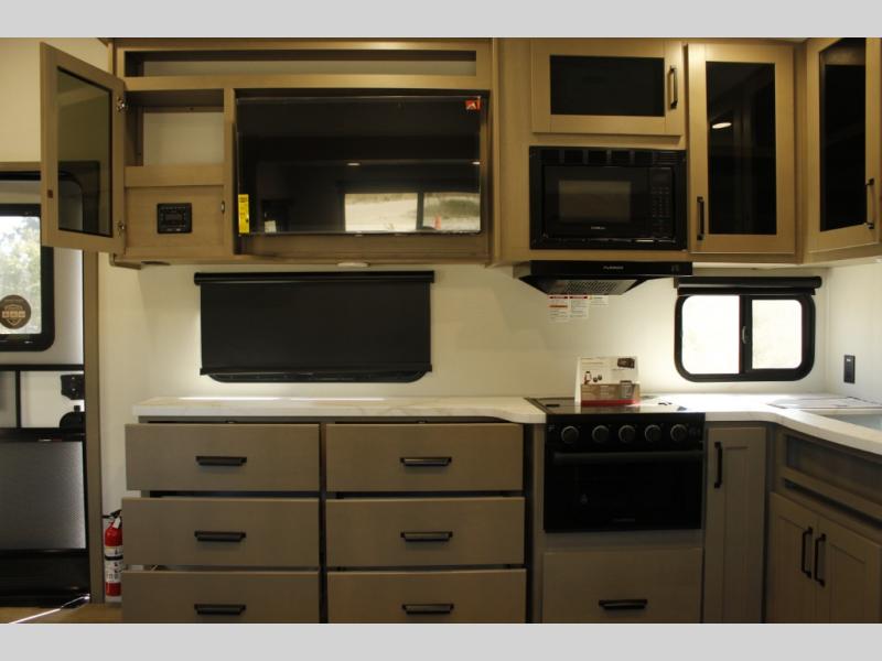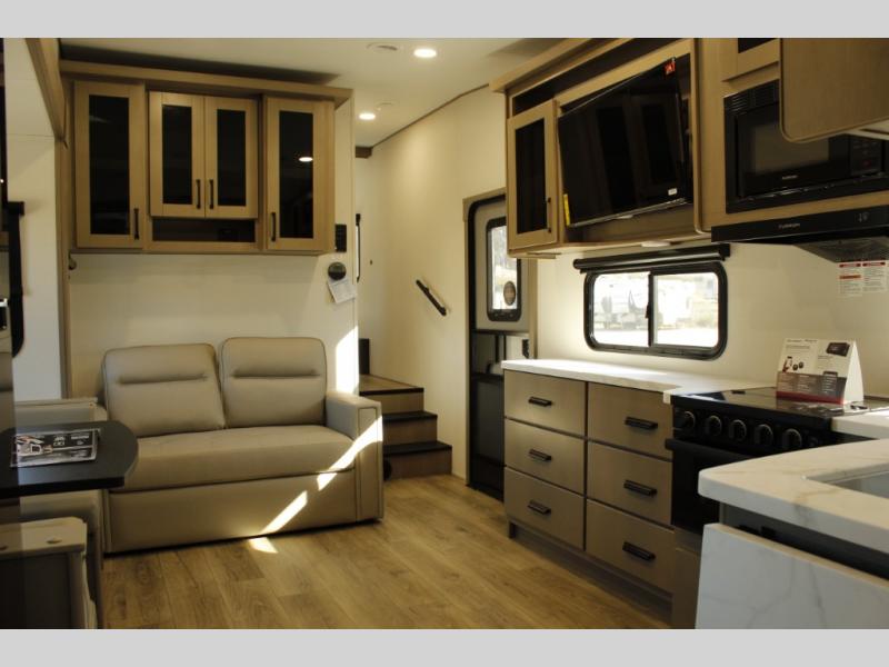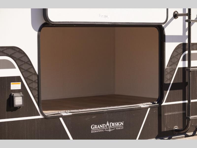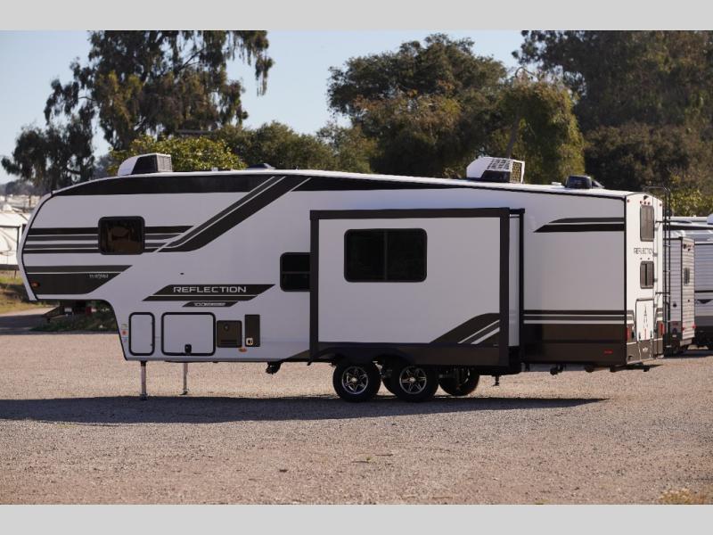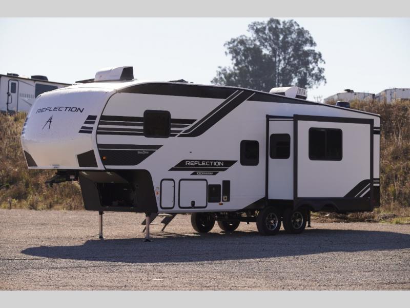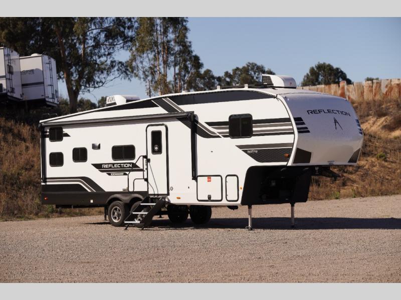 Each Reflection 100 Series fifth wheel by Grand Design is affordable and packed with luxury for unforgettable camping memories! The MorRyde CRE3000 suspension system and Goodyear Endurance tires will provide smooth towing from home to campground. And the solar package with a 180W solar panel, 60 Amp charge controller and 12V refrigerator will allow you to camp for longer periods of time and in more locations! A heated and enclosed underbelly with circulating heat is included in the Arctic 4-Seasons Protection Package, along with a double insulated roof and front cap, and thermofoil insulation under the holding tanks so you can camp all year long if you choose. You will appreciate having an on-demand water heater for hot showers after exploring, and the universal all-in-one docking station will let you monitor your RVs tanks levels and functions with ease. These models also include many luxurious interior features, such as premium Congoleum flooring, pleated shades, residential cabinetry, and matte black fixtures and hardware. Don't let the Reflection 100 Series fifth wheels pass you by!