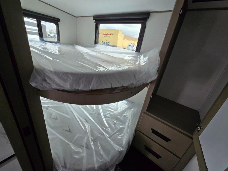 Camping with friends and family just got a whole lot easier in this fifth wheel with double-size bunks and a front private bedroom. Your guests will also have a wardrobe to keep their things tidy, and the bedroom closet will be perfect for your things. If you have other guests stay over, they can sleep on the U-shaped dinette within the slide out or the tri-fold sofa, and there is a 40" high-definition LED TV here to keep everyone entertained on rainy days. Everyone can take turns cleaning up in the full bath that includes a residential walk-in shower, a power vent fan, plus a large vanity top with a deep sink. And you will feel right at home in the front private bedroom with its queen bed, overhead cabinets, and TV prep if you'd like to add a television!