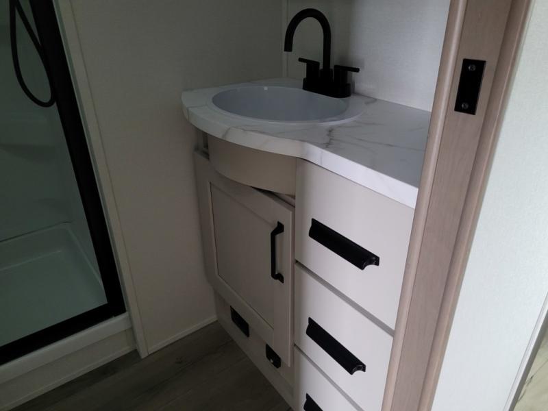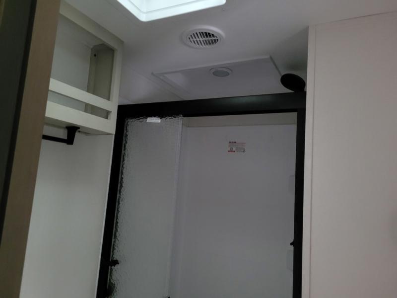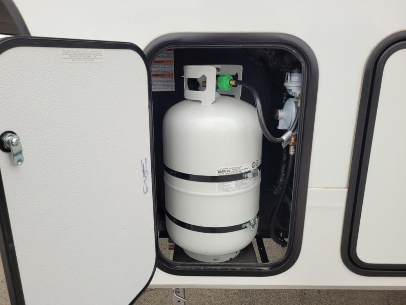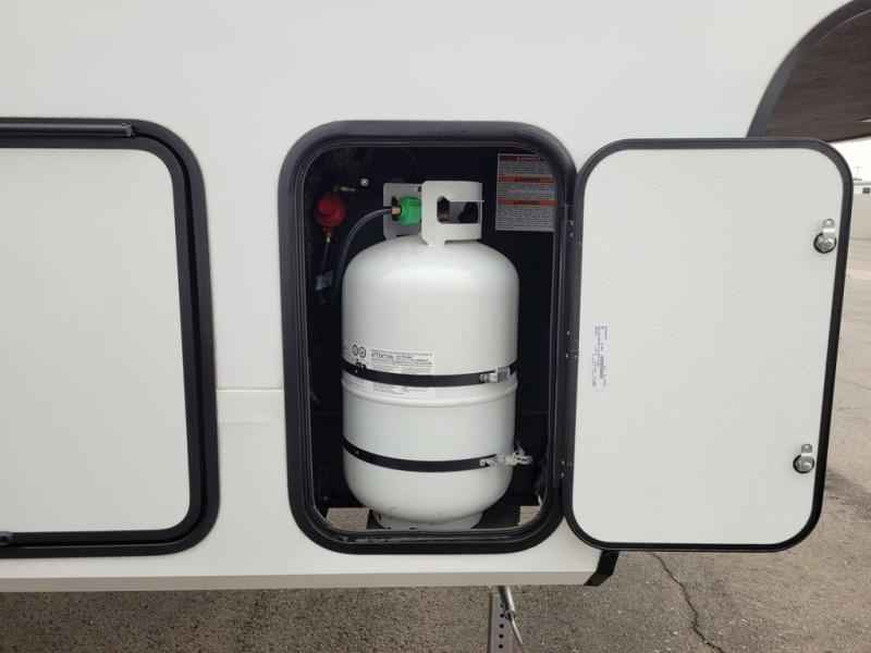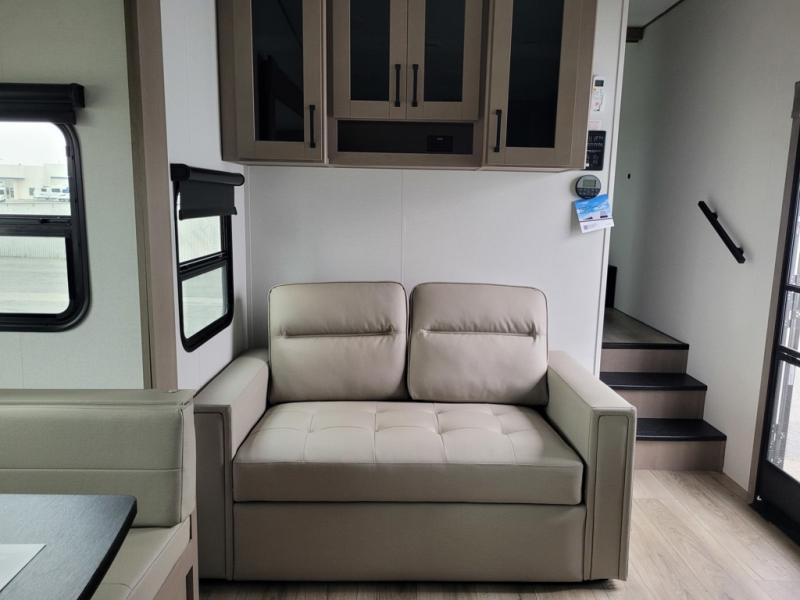 Camping with friends and family just got a whole lot easier in this fifth wheel with double-size bunks and a front private bedroom. Your guests will also have a wardrobe to keep their things tidy, and the bedroom closet will be perfect for your things. If you have other guests stay over, they can sleep on the U-shaped dinette within the slide out or the tri-fold sofa, and there is a 40" high-definition LED TV here to keep everyone entertained on rainy days. Everyone can take turns cleaning up in the full bath that includes a residential walk-in shower, a power vent fan, plus a large vanity top with a deep sink. And you will feel right at home in the front private bedroom with its queen bed, overhead cabinets, and TV prep if you'd like to add a television!