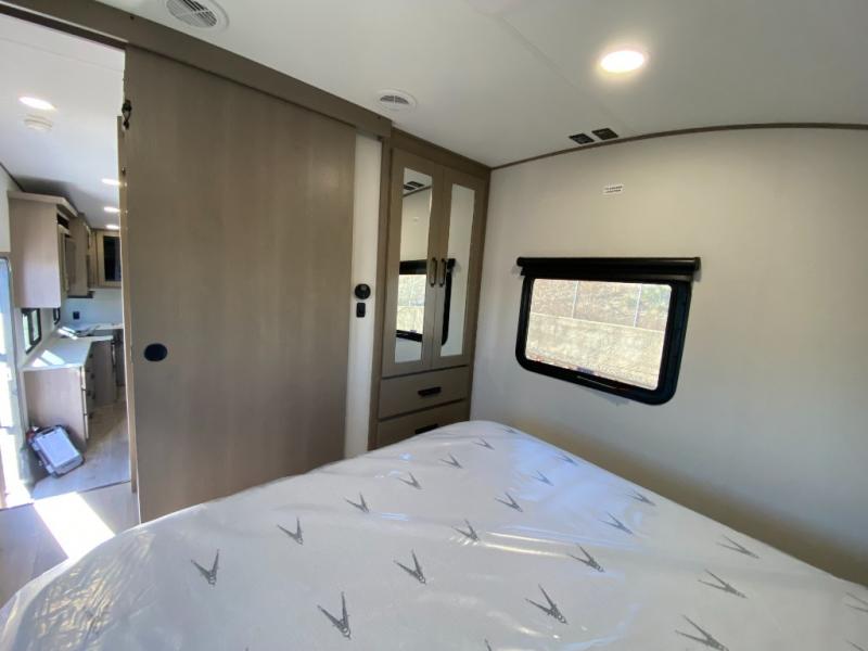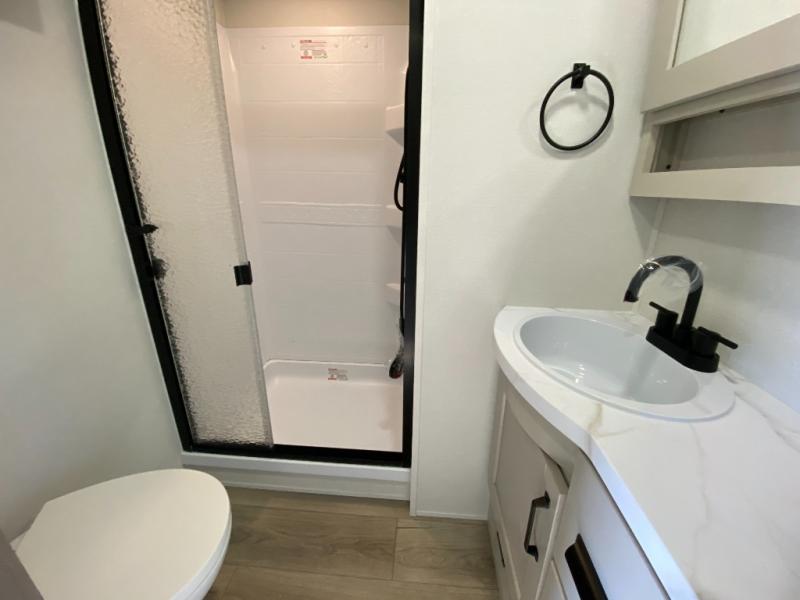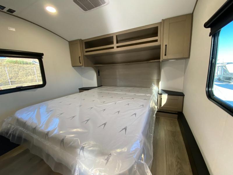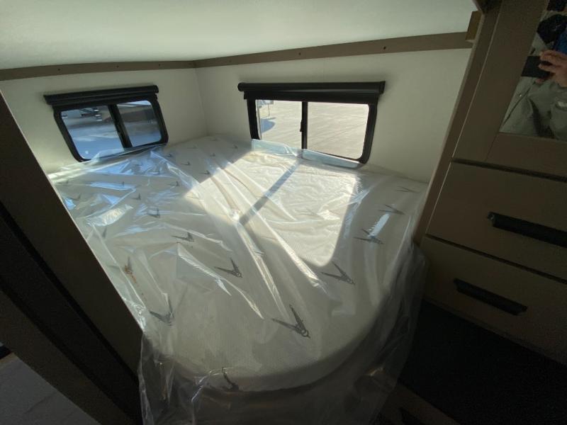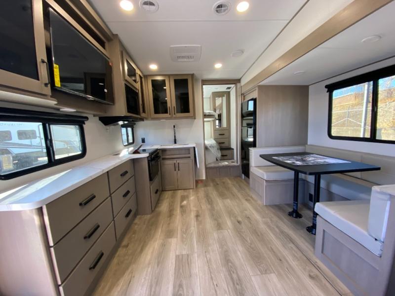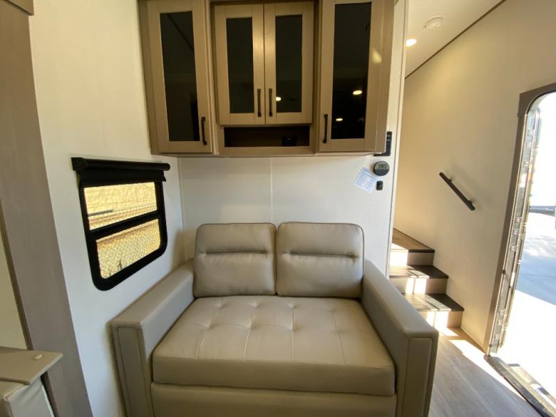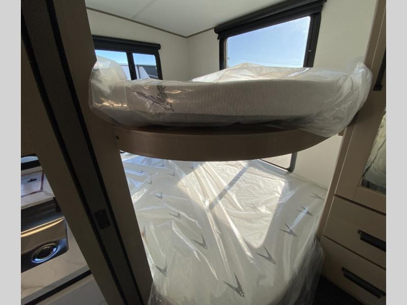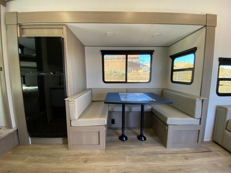 Camping with friends and family just got a whole lot easier in this fifth wheel with double-size bunks and a front private bedroom. Your guests will also have a wardrobe to keep their things tidy, and the bedroom closet will be perfect for your things. If you have other guests stay over, they can sleep on the U-shaped dinette within the slide out or the tri-fold sofa, and there is a 40" high-definition LED TV here to keep everyone entertained on rainy days. Everyone can take turns cleaning up in the full bath that includes a residential walk-in shower, a power vent fan, plus a large vanity top with a deep sink. And you will feel right at home in the front private bedroom with its queen bed, overhead cabinets, and TV prep if you'd like to add a television!