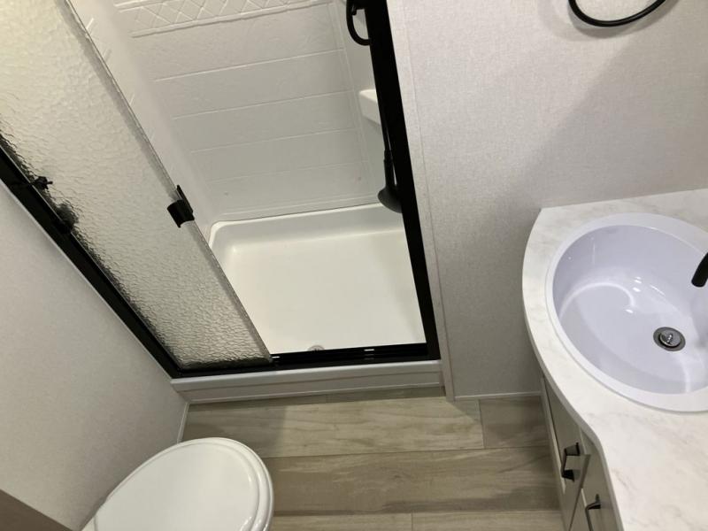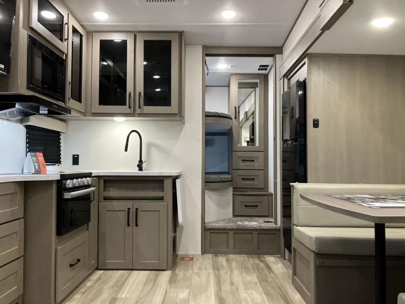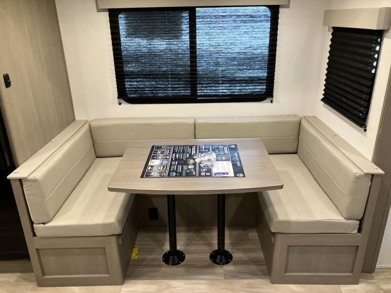 Camping with friends and family just got a whole lot easier in this fifth wheel with double-size bunks and a front private bedroom. Your guests will also have a wardrobe to keep their things tidy, and the bedroom closet will be perfect for your things. If you have other guests stay over, they can sleep on the U-shaped dinette within the slide out or the tri-fold sofa, and there is a 40" high-definition LED TV here to keep everyone entertained on rainy days. Everyone can take turns cleaning up in the full bath that includes a residential walk-in shower, a power vent fan, plus a large vanity top with a deep sink. And you will feel right at home in the front private bedroom with its queen bed, overhead cabinets, and TV prep if you'd like to add a television!