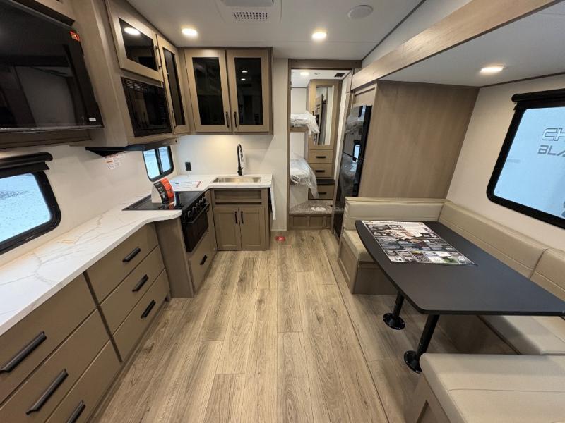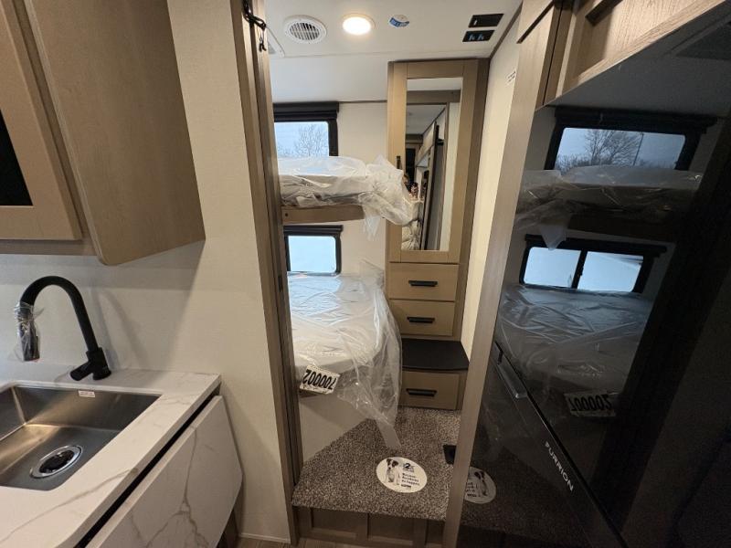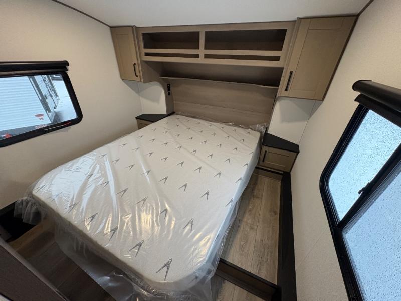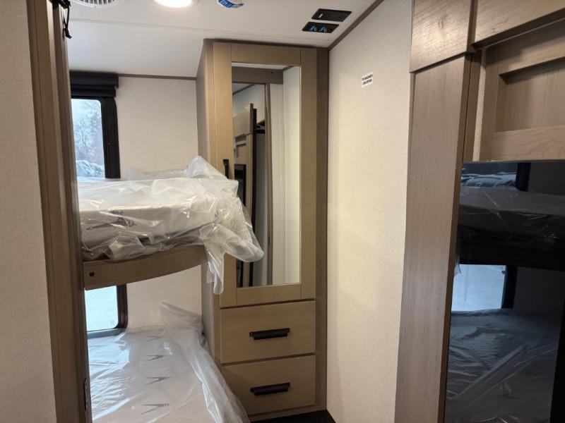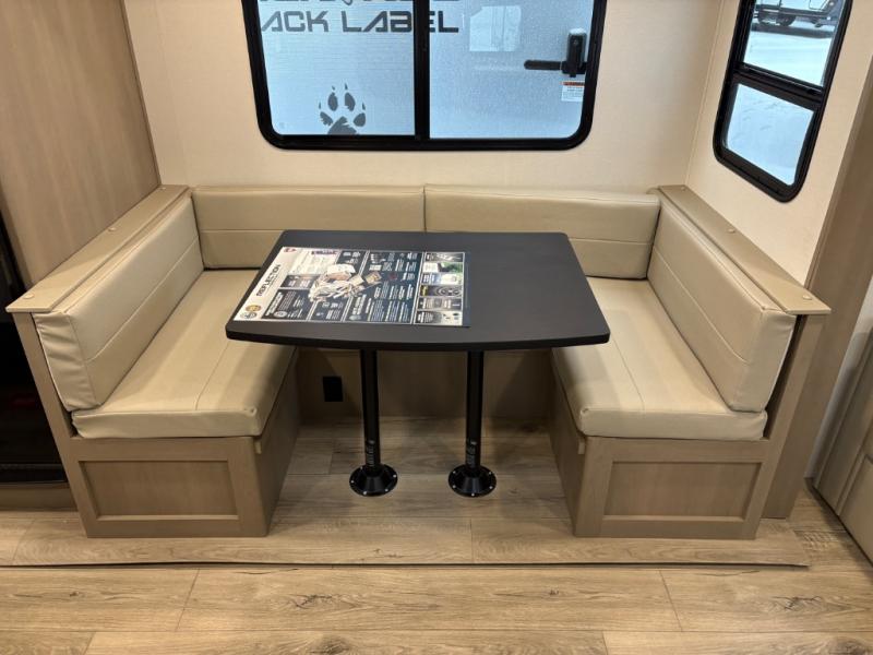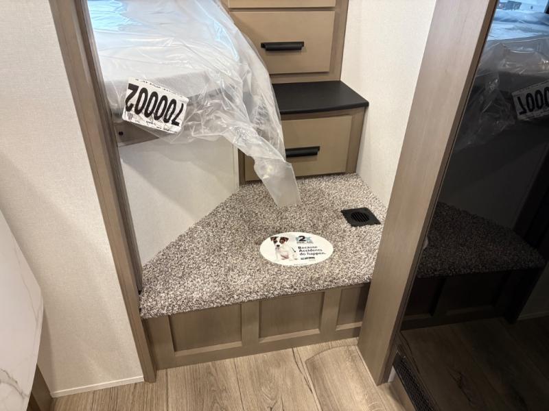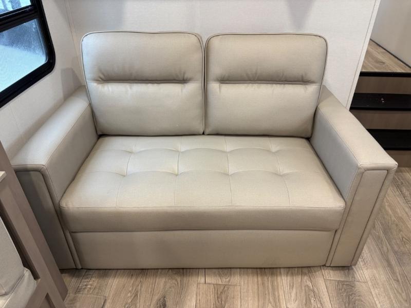 Camping with friends and family just got a whole lot easier in this fifth wheel with double-size bunks and a front private bedroom. Your guests will also have a wardrobe to keep their things tidy, and the bedroom closet will be perfect for your things. If you have other guests stay over, they can sleep on the U-shaped dinette within the slide out or the tri-fold sofa, and there is a 40" high-definition LED TV here to keep everyone entertained on rainy days. Everyone can take turns cleaning up in the full bath that includes a residential walk-in shower, a power vent fan, plus a large vanity top with a deep sink. And you will feel right at home in the front private bedroom with its queen bed, overhead cabinets, and TV prep if you'd like to add a television!