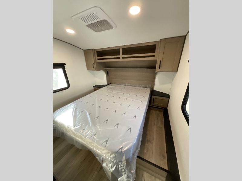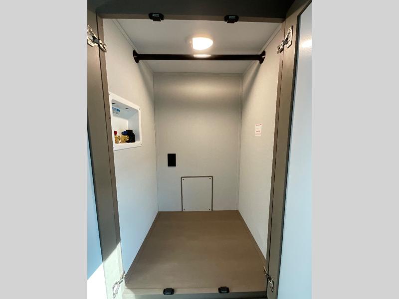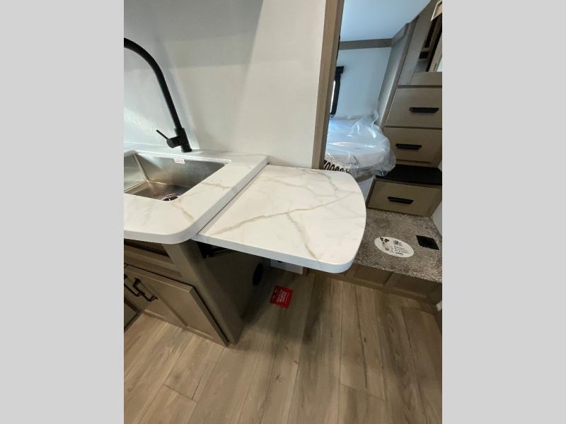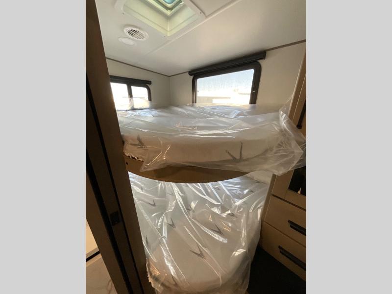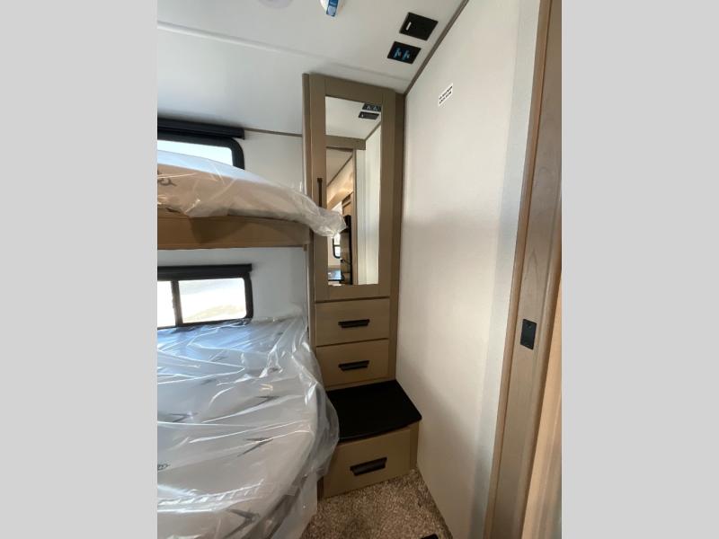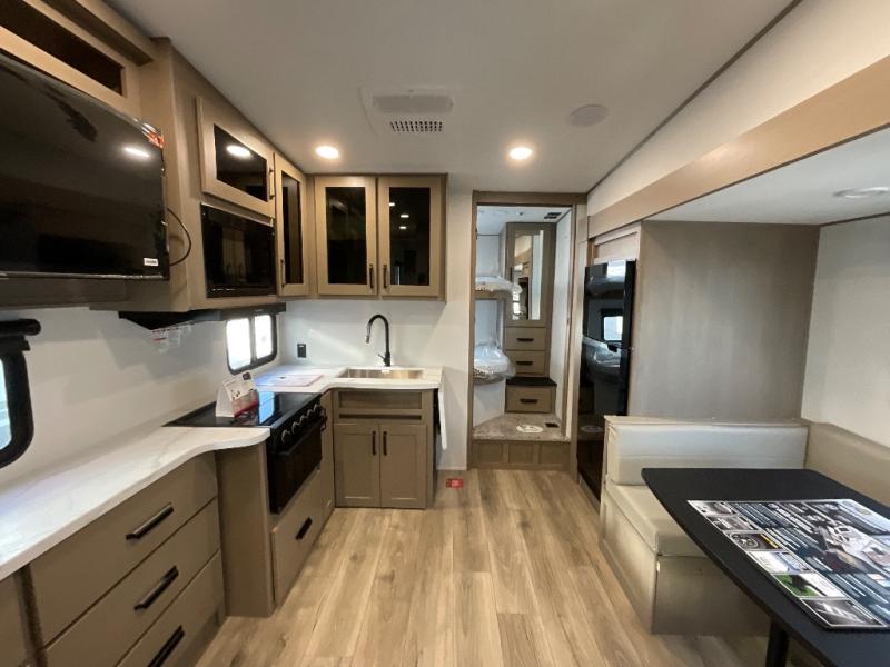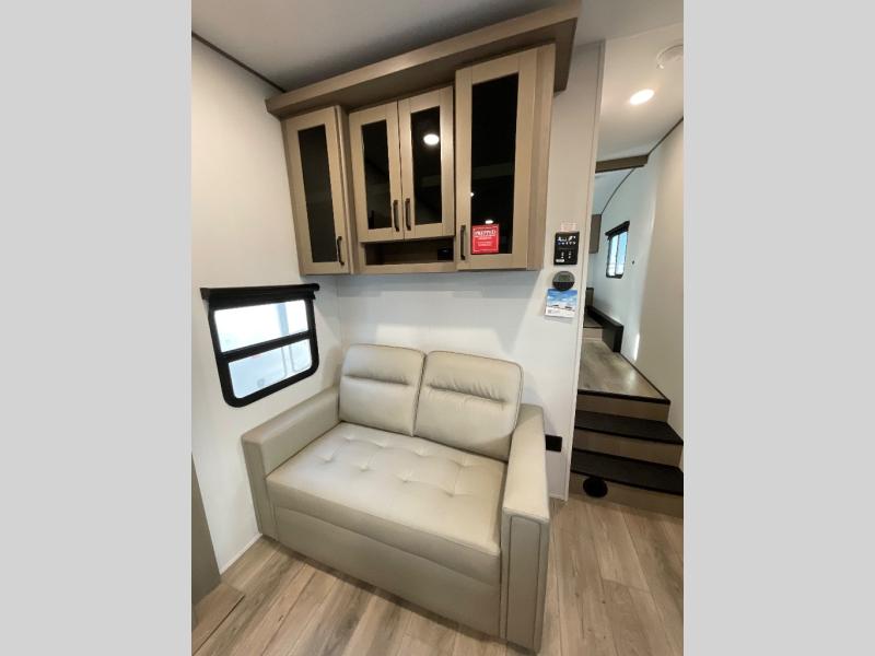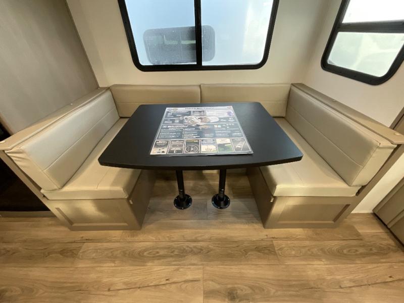 Camping with friends and family just got a whole lot easier in this fifth wheel with double-size bunks and a front private bedroom. Your guests will also have a wardrobe to keep their things tidy, and the bedroom closet will be perfect for your things. If you have other guests stay over, they can sleep on the U-shaped dinette within the slide out or the tri-fold sofa, and there is a 40" high-definition LED TV here to keep everyone entertained on rainy days. Everyone can take turns cleaning up in the full bath that includes a residential walk-in shower, a power vent fan, plus a large vanity top with a deep sink. And you will feel right at home in the front private bedroom with its queen bed, overhead cabinets, and TV prep if you'd like to add a television!