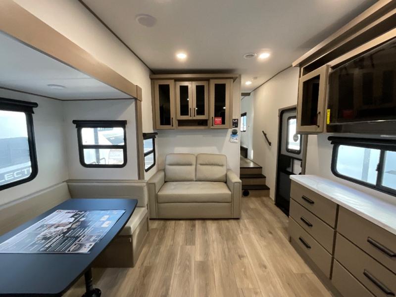 Each Reflection 100 Series fifth wheel by Grand Design is affordable and packed with luxury for unforgettable camping memories! The MorRyde CRE3000 suspension system and Goodyear Endurance tires will provide smooth towing from home to campground. And the solar package with a 180W solar panel, 60 Amp charge controller and 12V refrigerator will allow you to camp for longer periods of time and in more locations! A heated and enclosed underbelly with circulating heat is included in the Arctic 4-Seasons Protection Package, along with a double insulated roof and front cap, and thermofoil insulation under the holding tanks so you can camp all year long if you choose. You will appreciate having an on-demand water heater for hot showers after exploring, and the universal all-in-one docking station will let you monitor your RVs tanks levels and functions with ease. These models also include many luxurious interior features, such as premium Congoleum flooring, pleated shades, residential cabinetry, and matte black fixtures and hardware. Don't let the Reflection 100 Series fifth wheels pass you by!