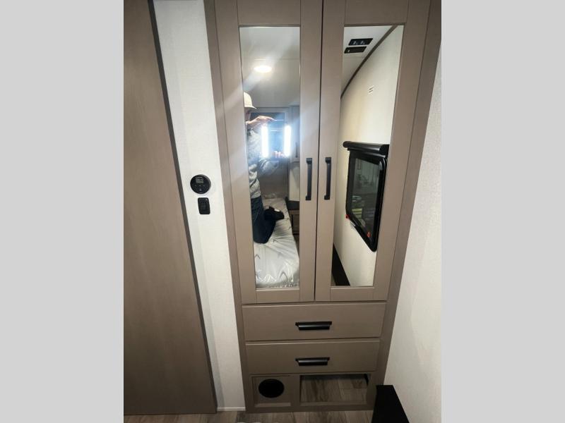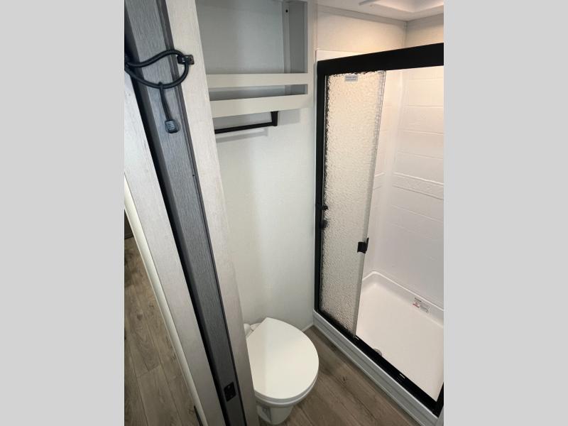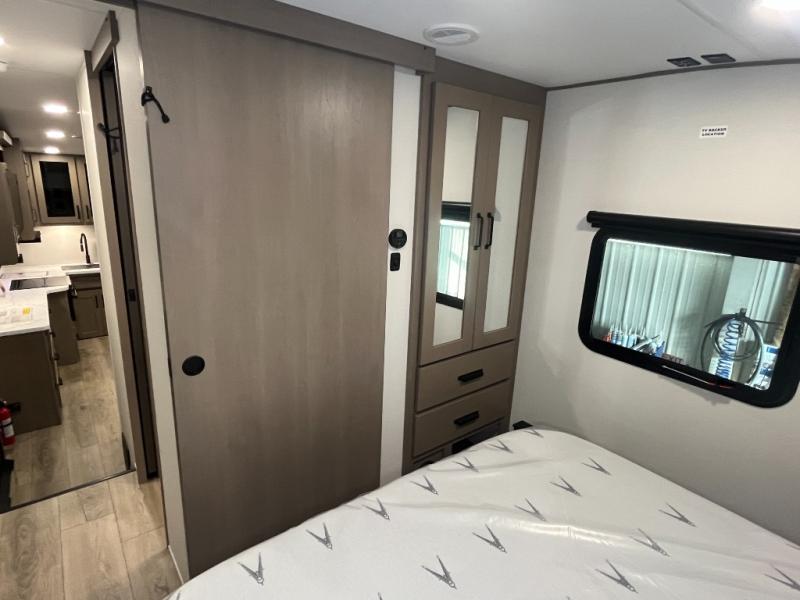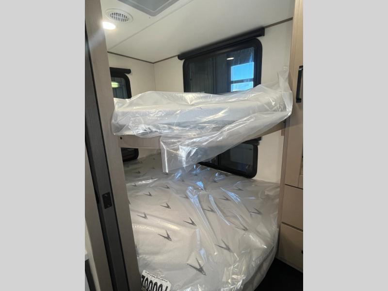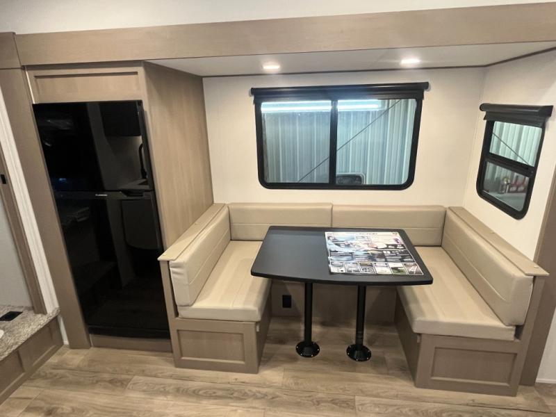 Camping with friends and family just got a whole lot easier in this fifth wheel with double-size bunks and a front private bedroom. Your guests will also have a wardrobe to keep their things tidy, and the bedroom closet will be perfect for your things. If you have other guests stay over, they can sleep on the U-shaped dinette within the slide out or the tri-fold sofa, and there is a 40" high-definition LED TV here to keep everyone entertained on rainy days. Everyone can take turns cleaning up in the full bath that includes a residential walk-in shower, a power vent fan, plus a large vanity top with a deep sink. And you will feel right at home in the front private bedroom with its queen bed, overhead cabinets, and TV prep if you'd like to add a television!