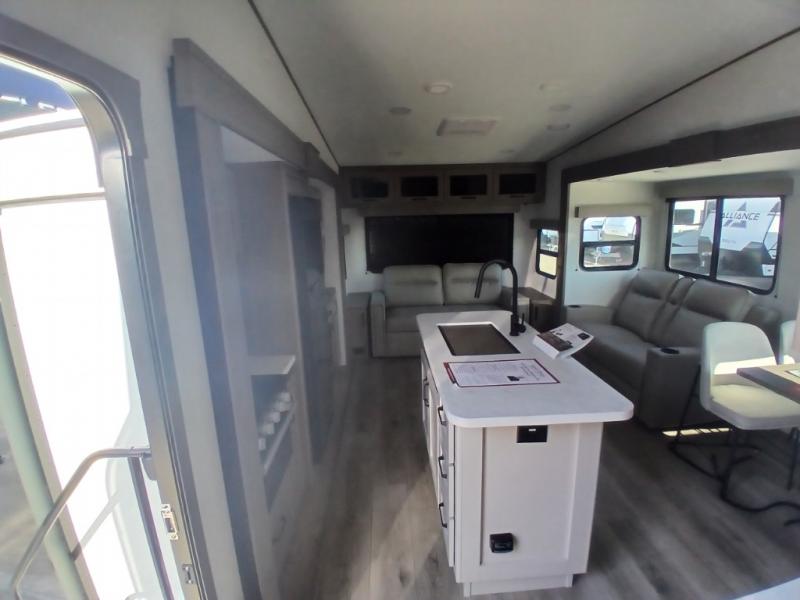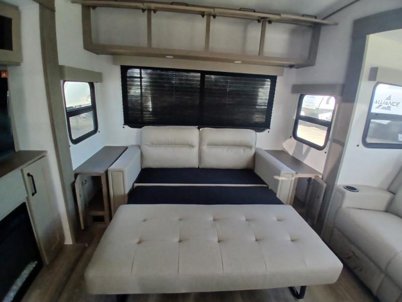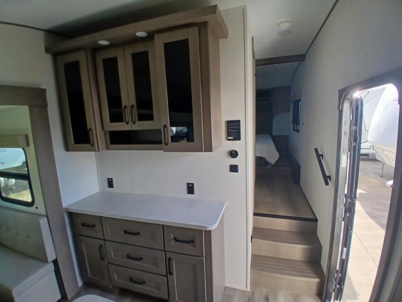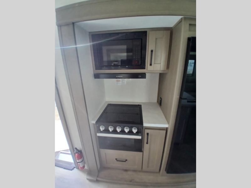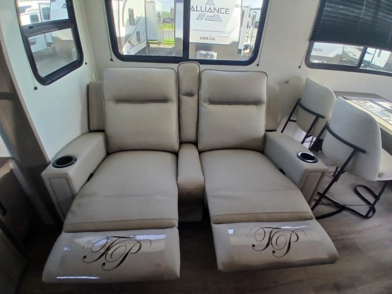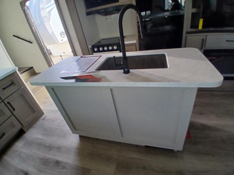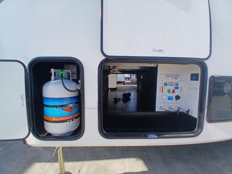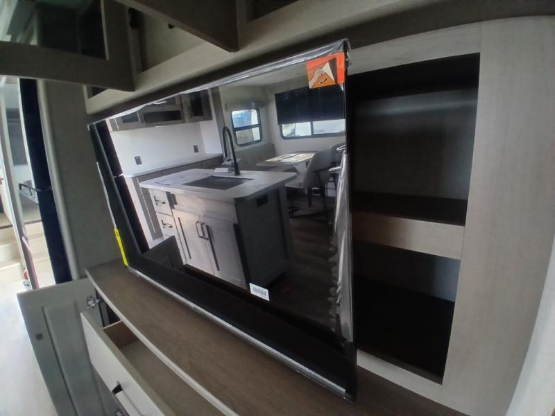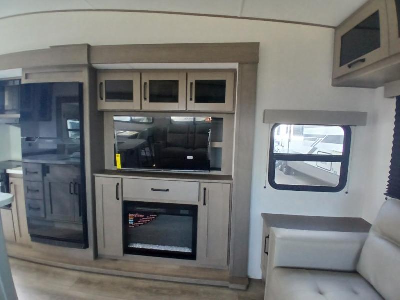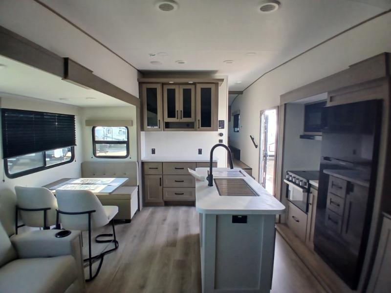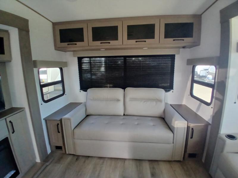 You'll love the amount of space you have in this fifth wheel thanks to the dual opposing slides in the rear living area/kitchen. Your friends and family can relax on the tri-fold sofa or theater seating across from the high-definition 40" LED TV. There is also a booth dinette or you can choose the optional swivel dinette if you prefer that seating. The chef of your group will appreciate having a kitchen island that will provide more counter space, plus there is a hutch with overhead cabinets for nice dishes. A full bath onboard lets you clean up each day and the front private bedroom includes a queen bed just like at home. You'll also love spending time outdoors under the electric awning, and there is an unobstructed pass-thru storage for fishing poles, hiking gear, and camp chairs!