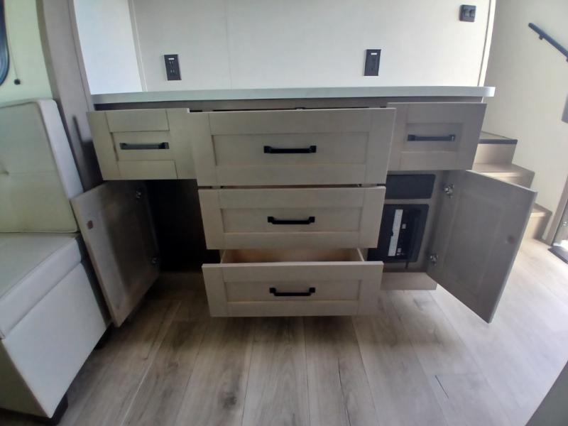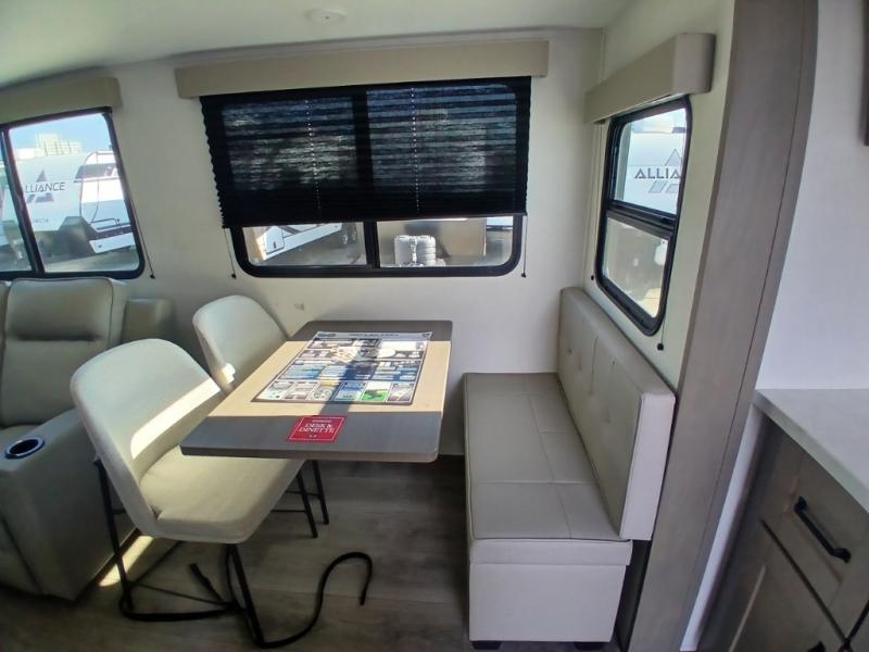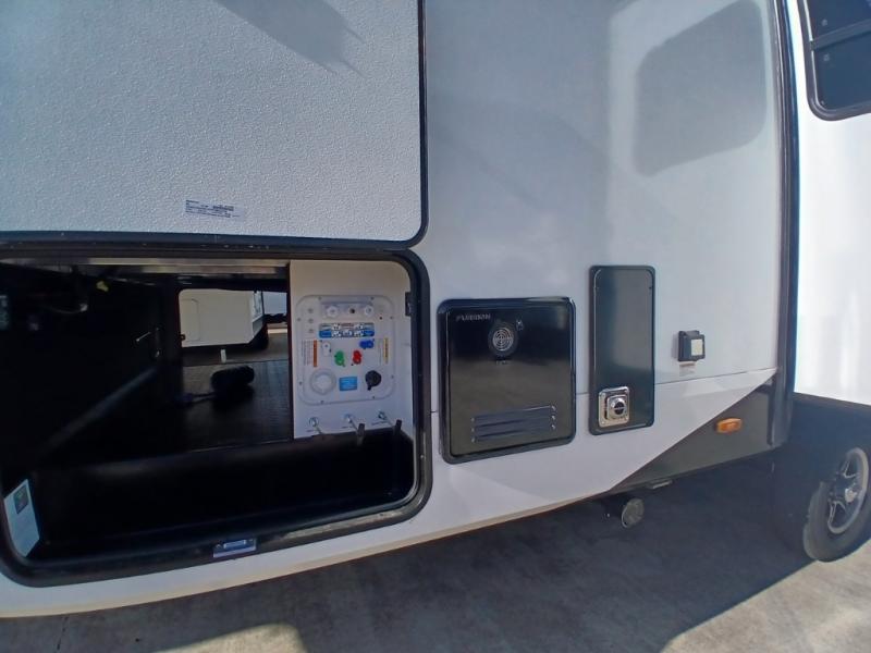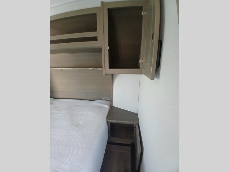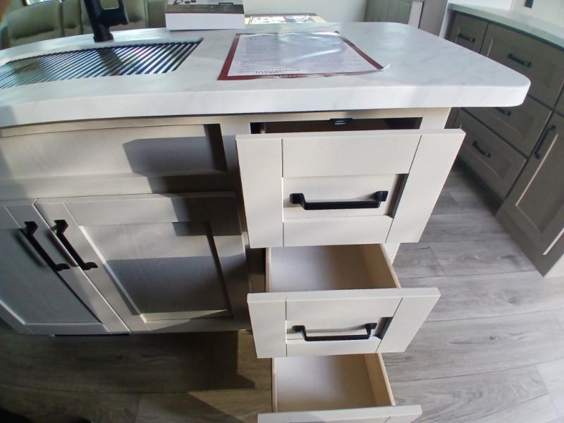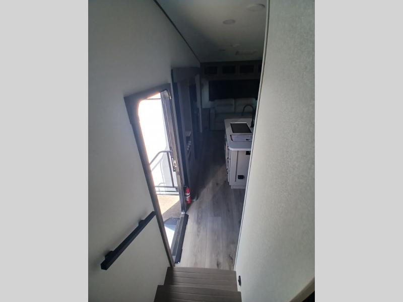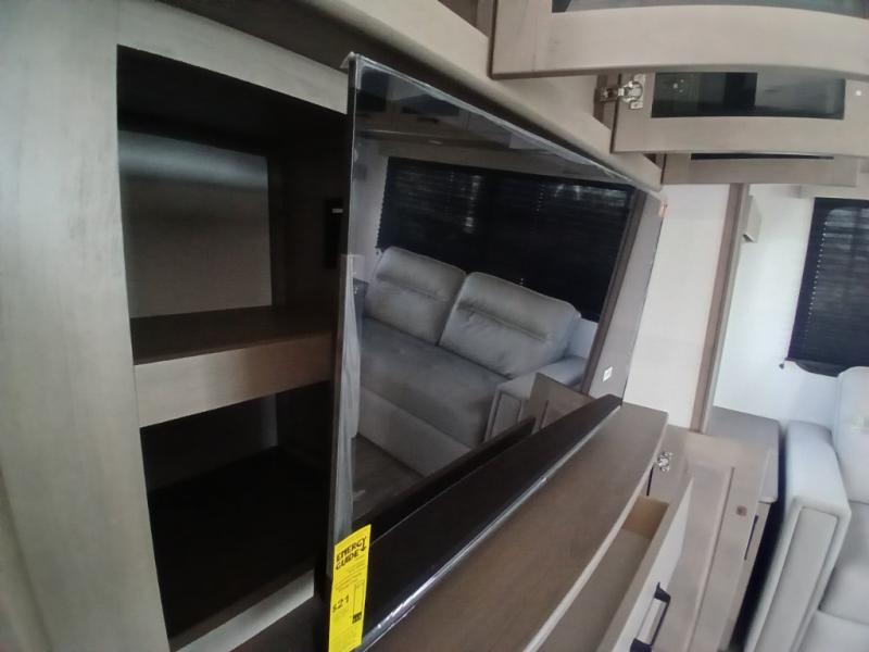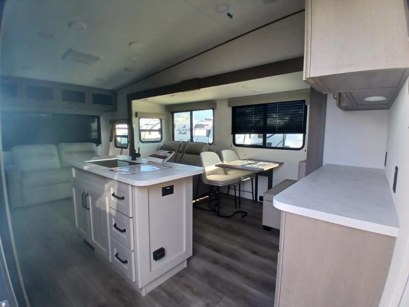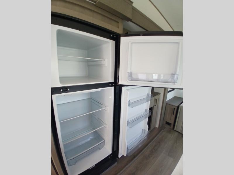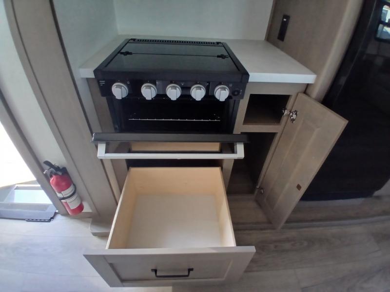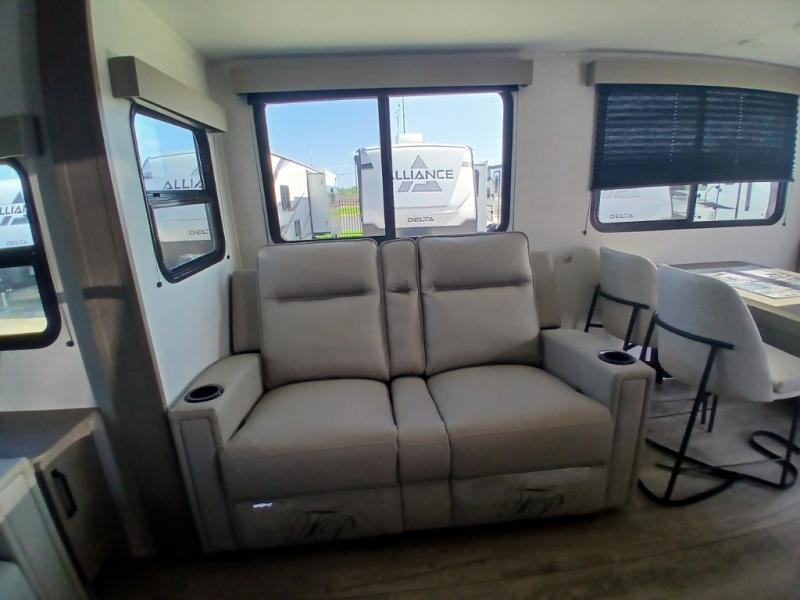 You'll love the amount of space you have in this fifth wheel thanks to the dual opposing slides in the rear living area/kitchen. Your friends and family can relax on the tri-fold sofa or theater seating across from the high-definition 40" LED TV. There is also a booth dinette or you can choose the optional swivel dinette if you prefer that seating. The chef of your group will appreciate having a kitchen island that will provide more counter space, plus there is a hutch with overhead cabinets for nice dishes. A full bath onboard lets you clean up each day and the front private bedroom includes a queen bed just like at home. You'll also love spending time outdoors under the electric awning, and there is an unobstructed pass-thru storage for fishing poles, hiking gear, and camp chairs!