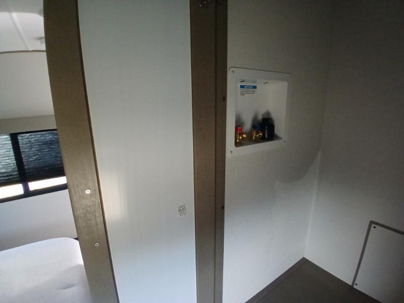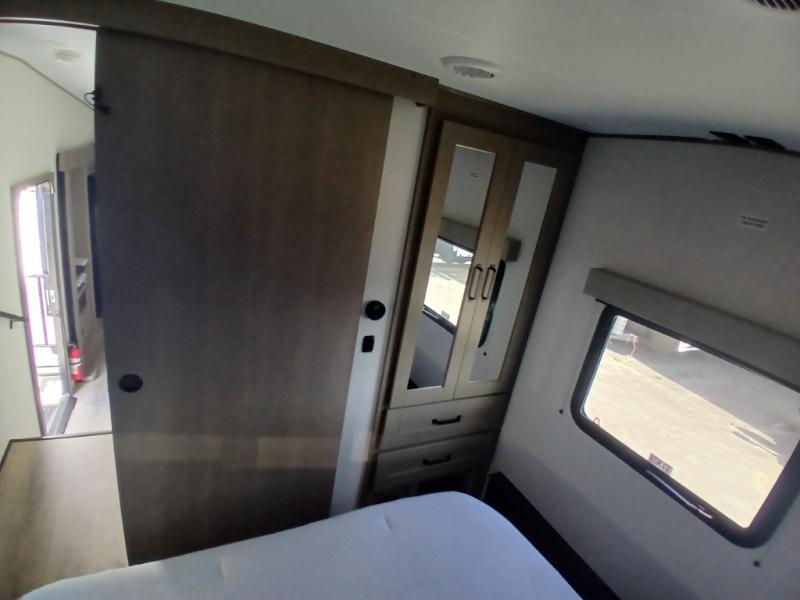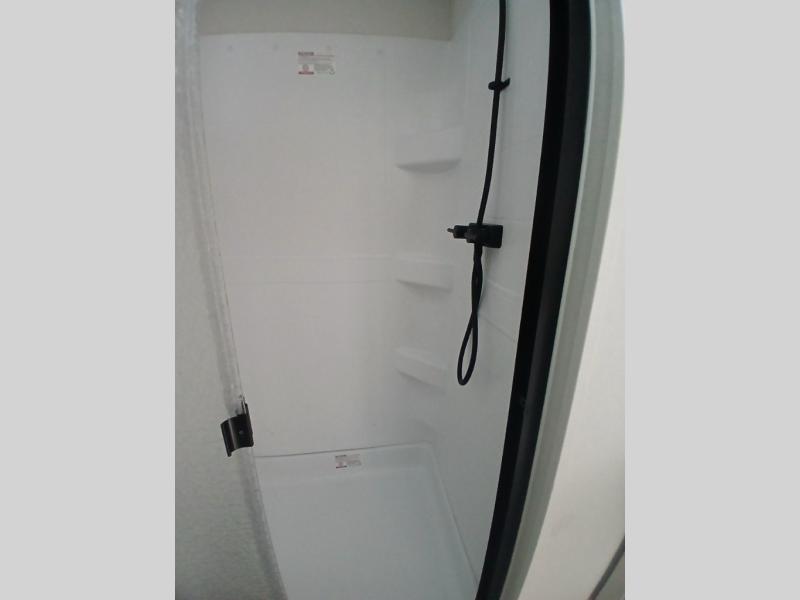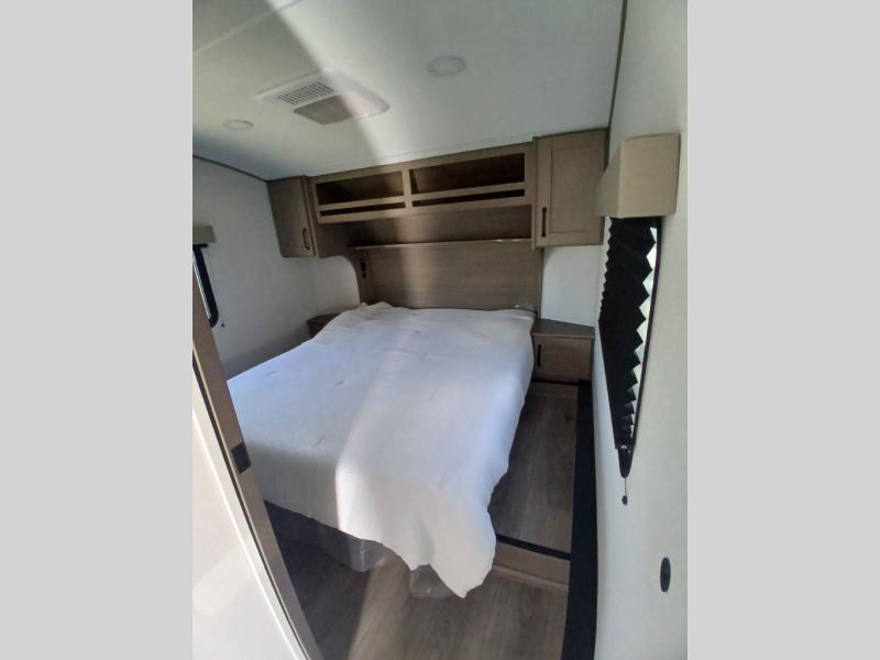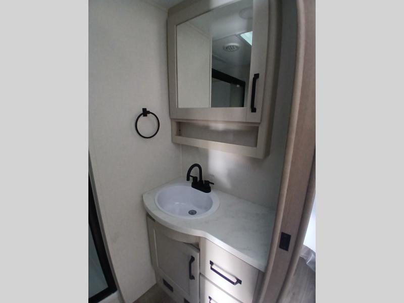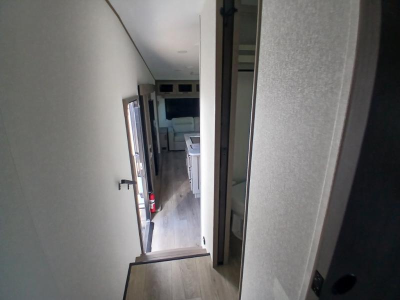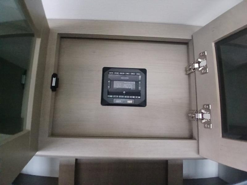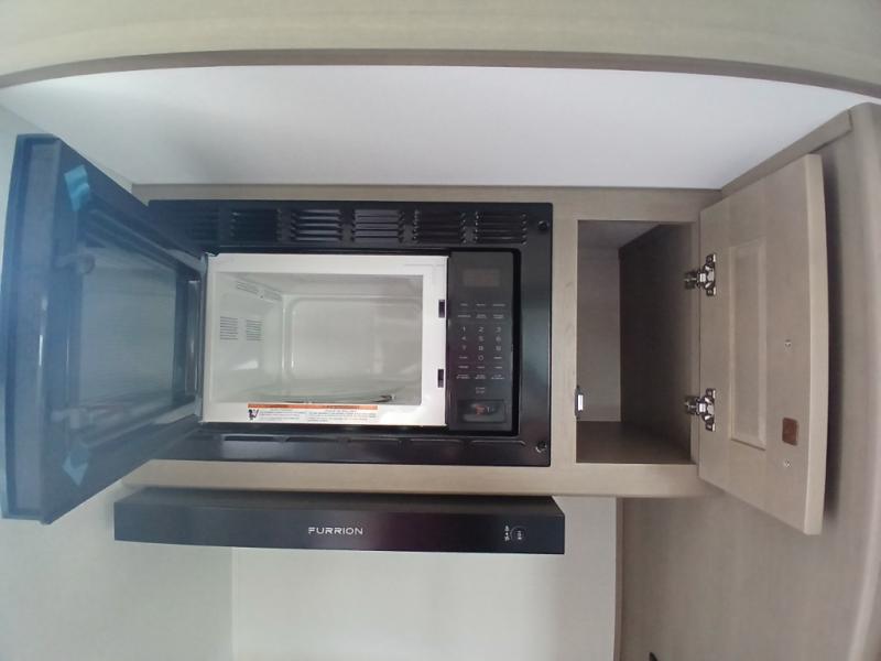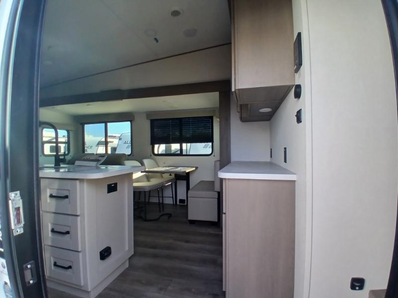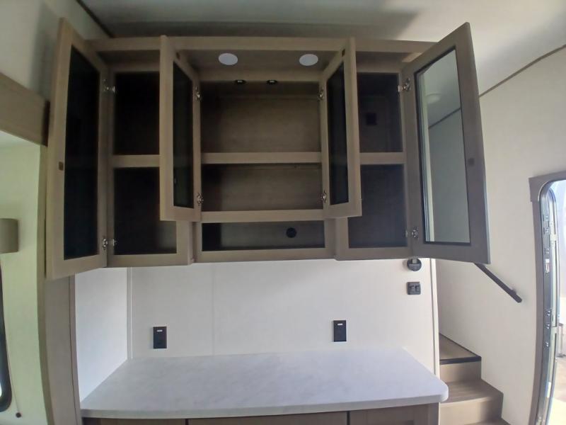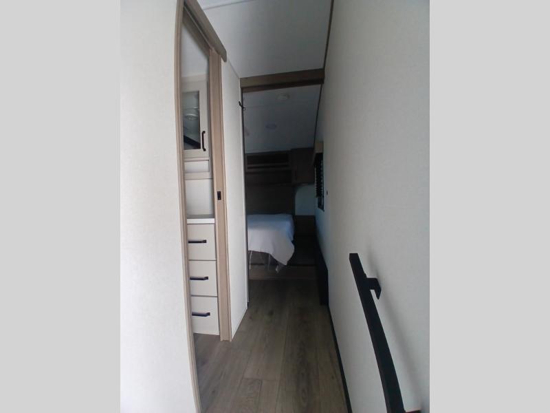 You'll love the amount of space you have in this fifth wheel thanks to the dual opposing slides in the rear living area/kitchen. Your friends and family can relax on the tri-fold sofa or theater seating across from the high-definition 40" LED TV. There is also a booth dinette or you can choose the optional swivel dinette if you prefer that seating. The chef of your group will appreciate having a kitchen island that will provide more counter space, plus there is a hutch with overhead cabinets for nice dishes. A full bath onboard lets you clean up each day and the front private bedroom includes a queen bed just like at home. You'll also love spending time outdoors under the electric awning, and there is an unobstructed pass-thru storage for fishing poles, hiking gear, and camp chairs!