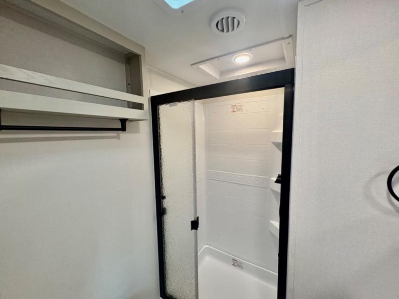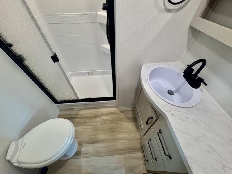 You'll love the amount of space you have in this fifth wheel thanks to the dual opposing slides in the rear living area/kitchen. Your friends and family can relax on the tri-fold sofa or theater seating across from the high-definition 40" LED TV. There is also a booth dinette or you can choose the optional swivel dinette if you prefer that seating. The chef of your group will appreciate having a kitchen island that will provide more counter space, plus there is a hutch with overhead cabinets for nice dishes. A full bath onboard lets you clean up each day and the front private bedroom includes a queen bed just like at home. You'll also love spending time outdoors under the electric awning, and there is an unobstructed pass-thru storage for fishing poles, hiking gear, and camp chairs!