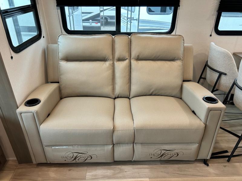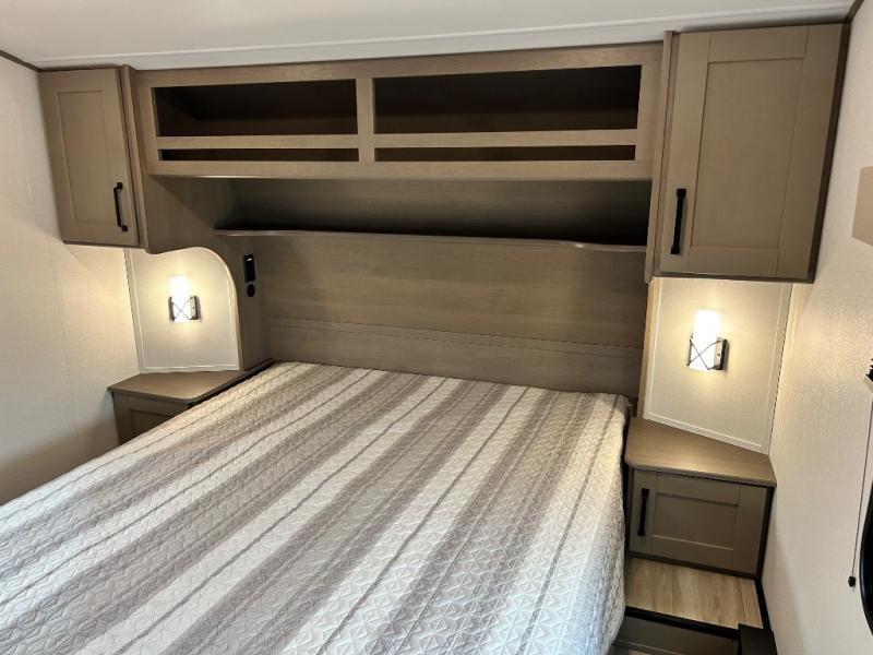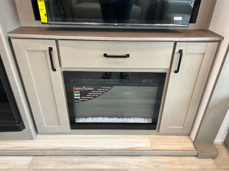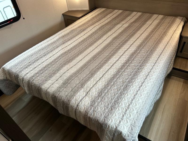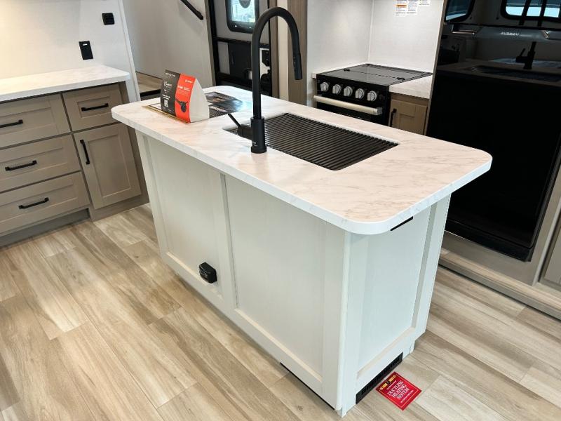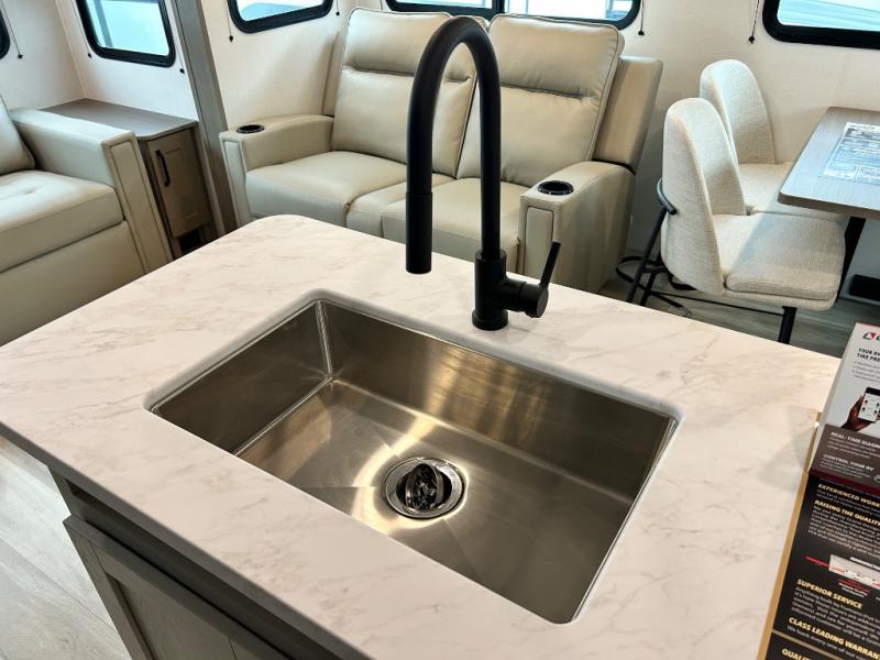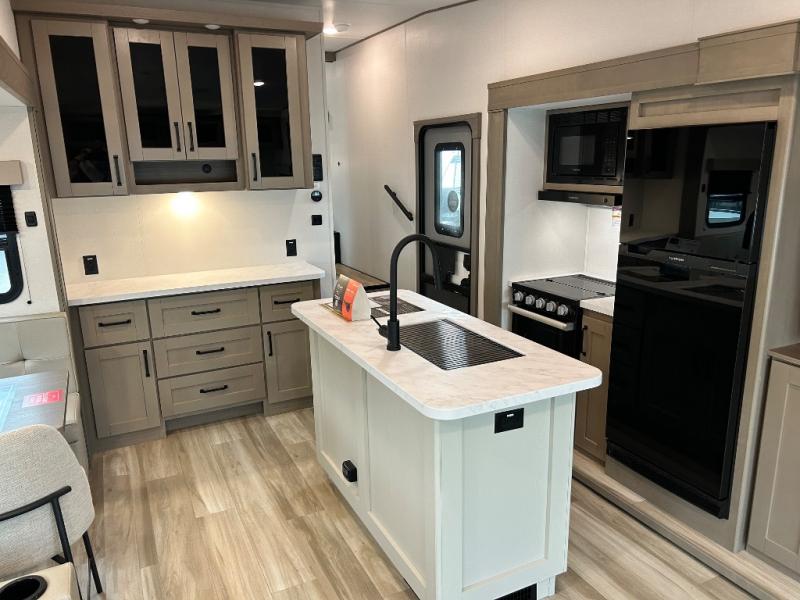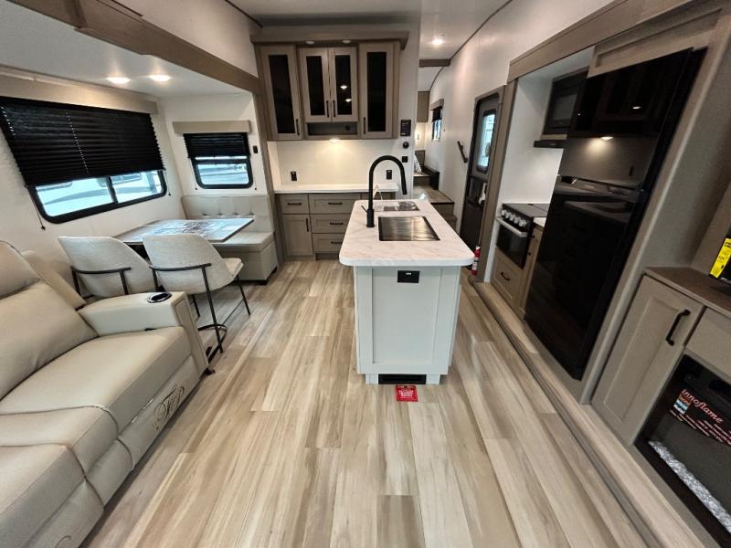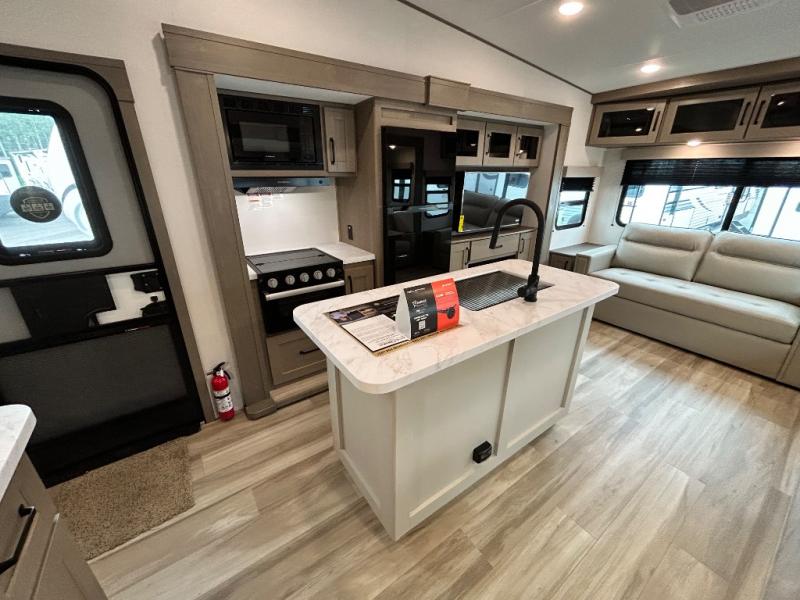 You'll love the amount of space you have in this fifth wheel thanks to the dual opposing slides in the rear living area/kitchen. Your friends and family can relax on the tri-fold sofa or theater seating across from the high-definition 40" LED TV. There is also a booth dinette or you can choose the optional swivel dinette if you prefer that seating. The chef of your group will appreciate having a kitchen island that will provide more counter space, plus there is a hutch with overhead cabinets for nice dishes. A full bath onboard lets you clean up each day and the front private bedroom includes a queen bed just like at home. You'll also love spending time outdoors under the electric awning, and there is an unobstructed pass-thru storage for fishing poles, hiking gear, and camp chairs!