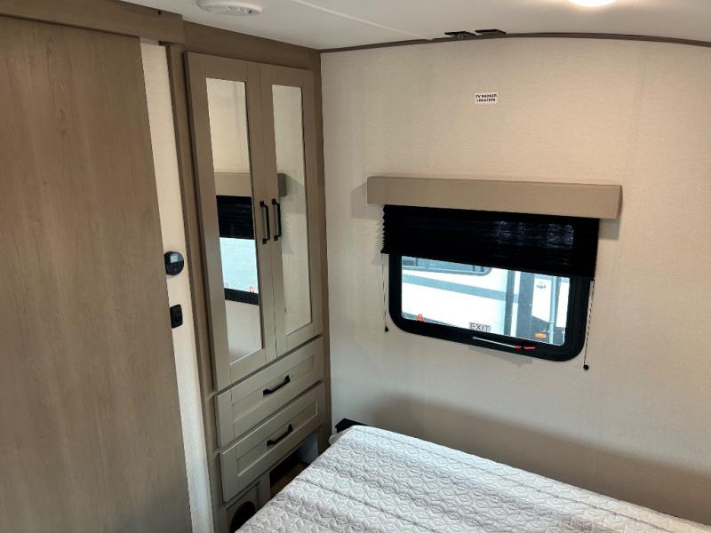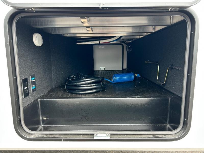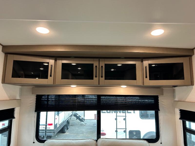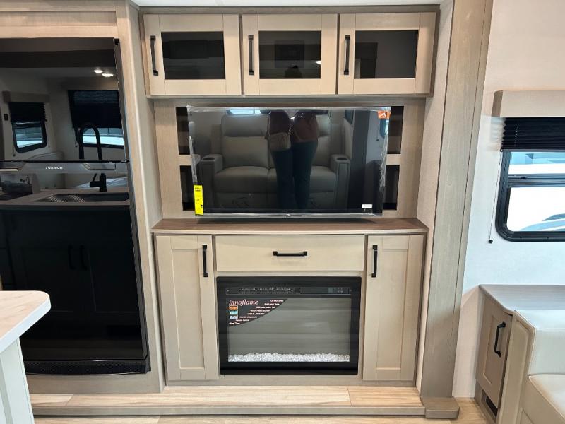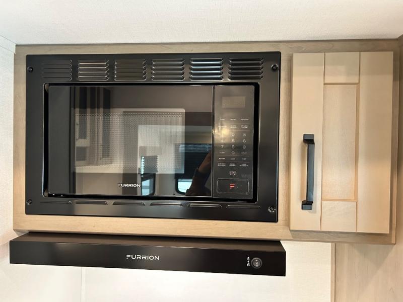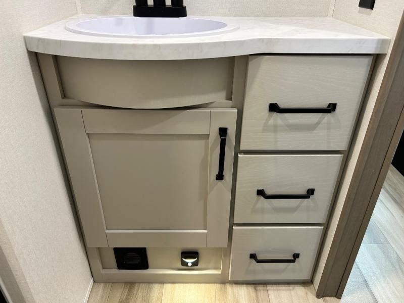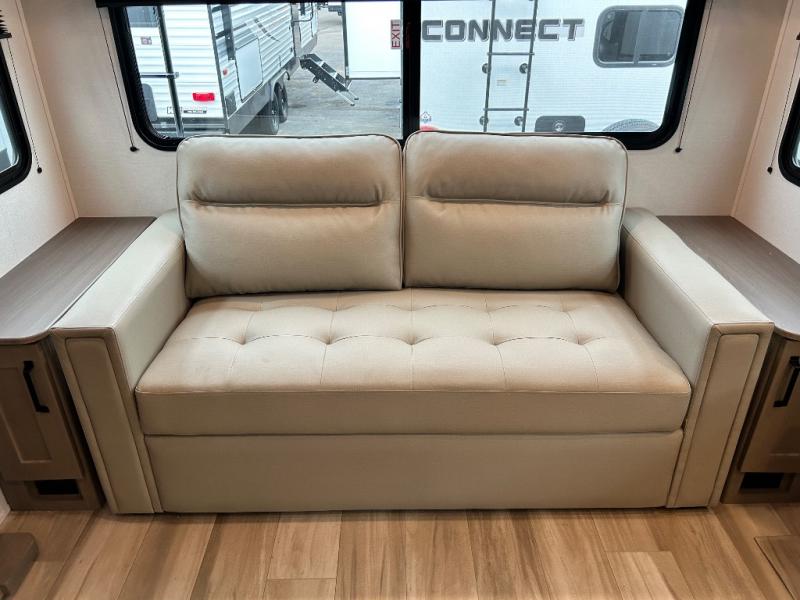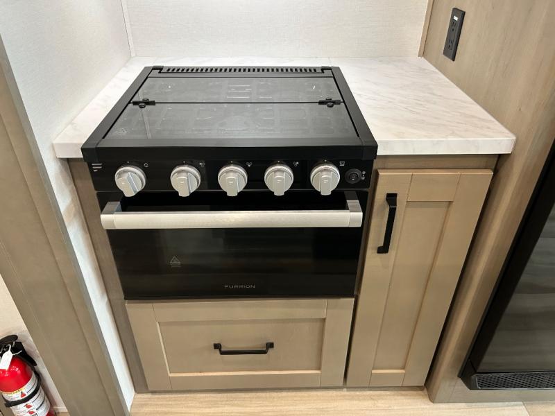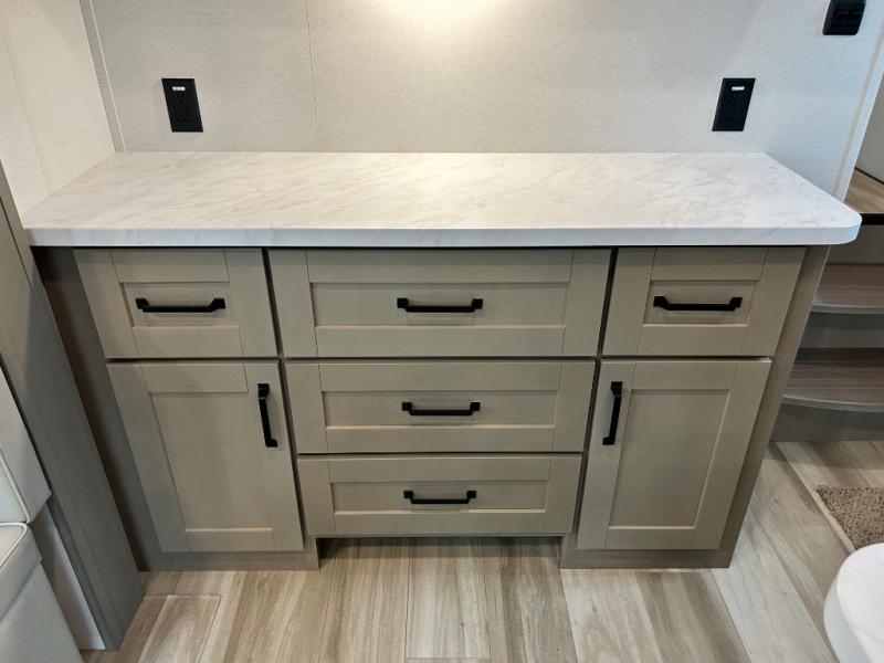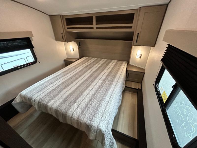 You'll love the amount of space you have in this fifth wheel thanks to the dual opposing slides in the rear living area/kitchen. Your friends and family can relax on the tri-fold sofa or theater seating across from the high-definition 40" LED TV. There is also a booth dinette or you can choose the optional swivel dinette if you prefer that seating. The chef of your group will appreciate having a kitchen island that will provide more counter space, plus there is a hutch with overhead cabinets for nice dishes. A full bath onboard lets you clean up each day and the front private bedroom includes a queen bed just like at home. You'll also love spending time outdoors under the electric awning, and there is an unobstructed pass-thru storage for fishing poles, hiking gear, and camp chairs!