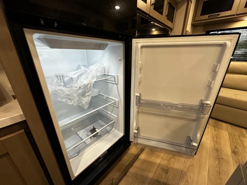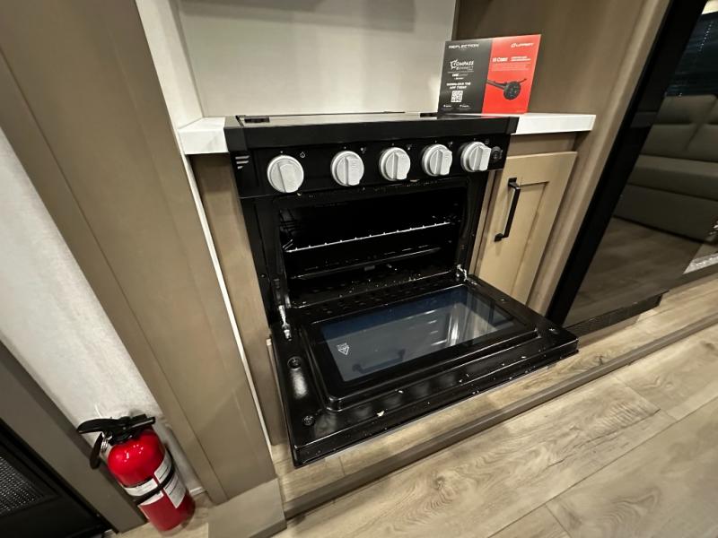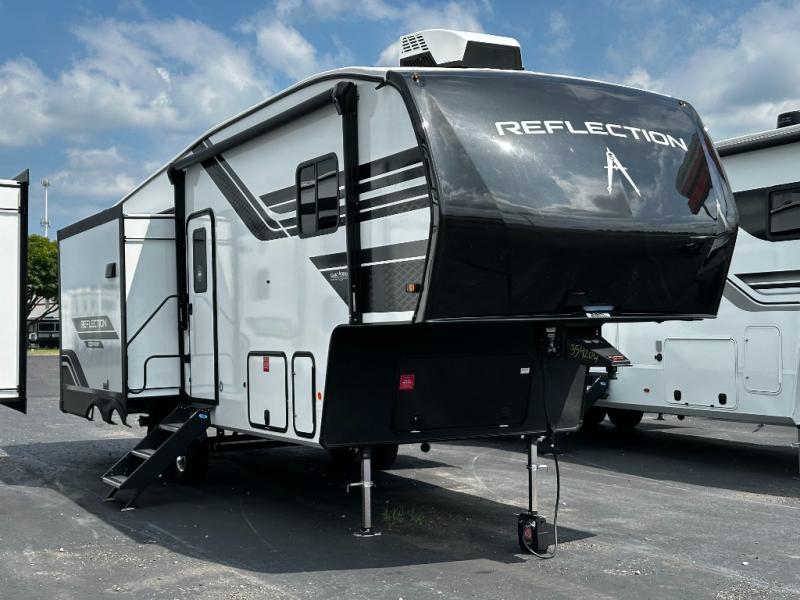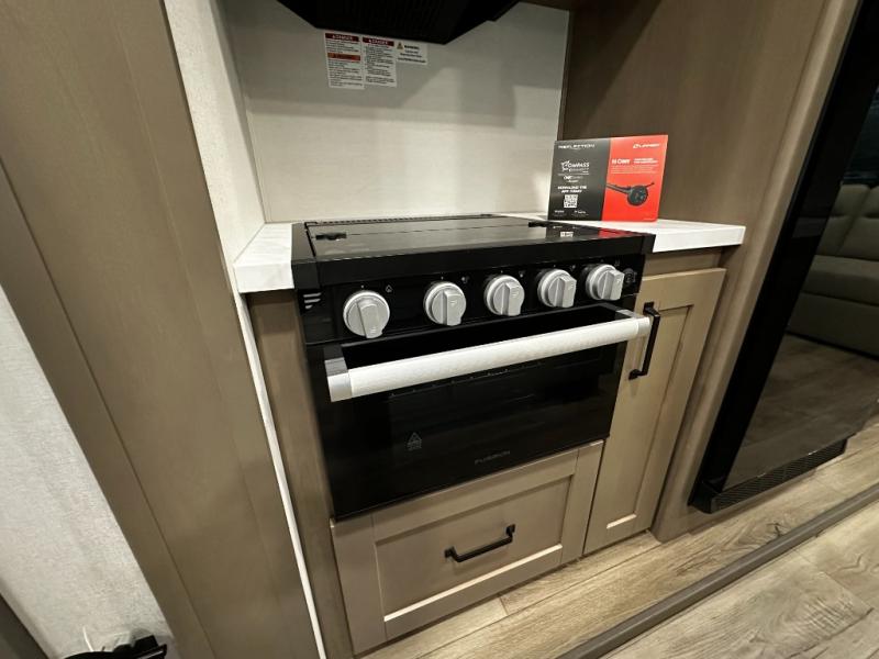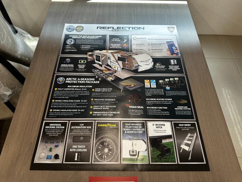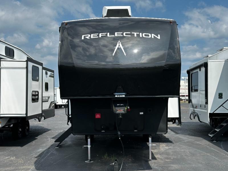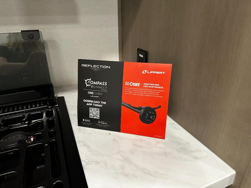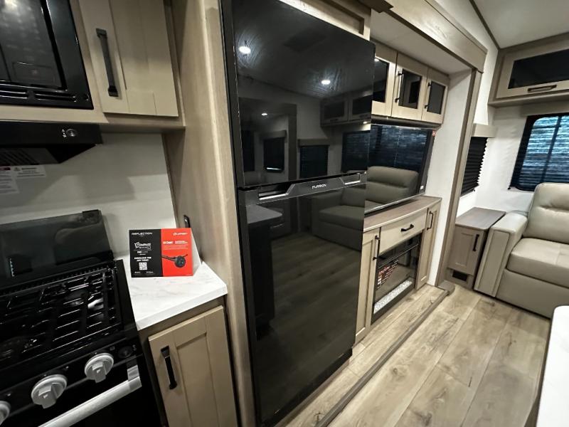 Step inside and feel right at home. The Reflection 28RL welcomes you with an open, airy floorplan featuring a spacious rear living area, premium theater seating, and a large entertainment center with a fireplace for cozy nights. The gourmet-style kitchen includes solid-surface countertops, a residential refrigerator, and an oversized pantry—making every meal on the road a pleasure. Whether you’re hosting friends or relaxing after a long day of exploring, the Reflection offers the perfect blend of elegance and practicality.