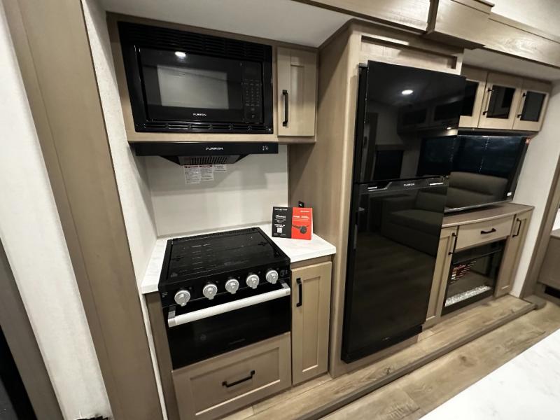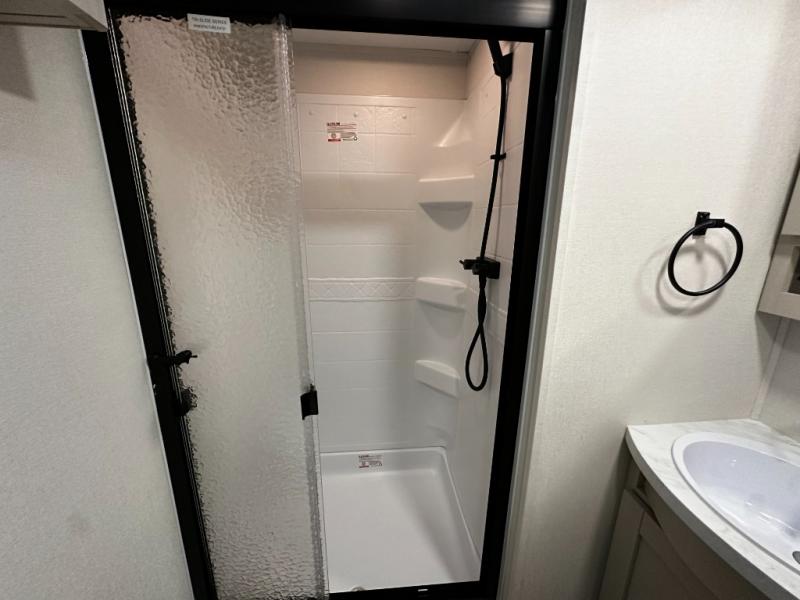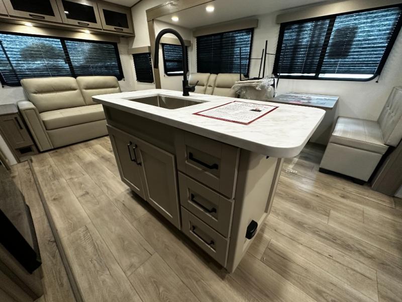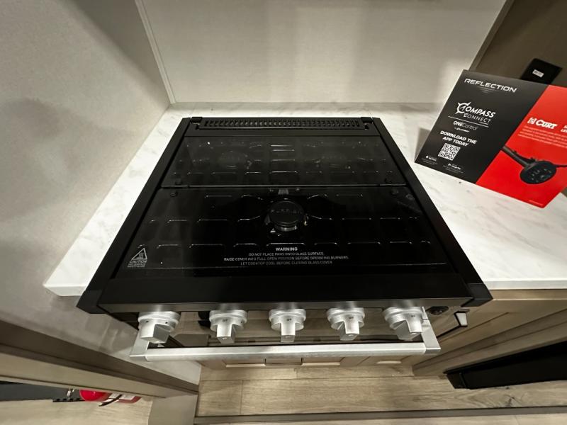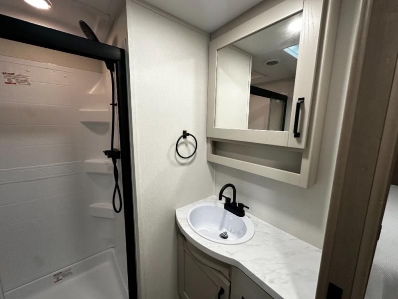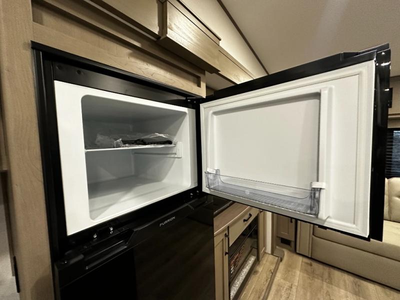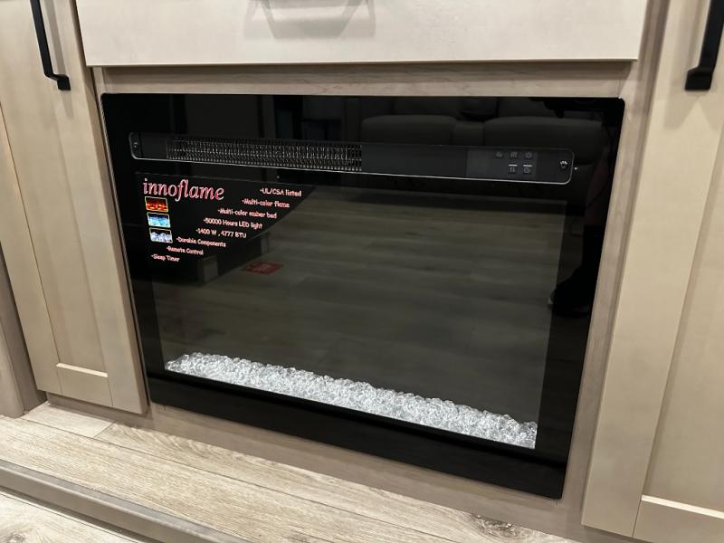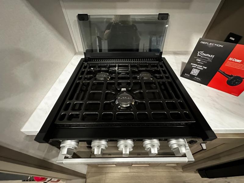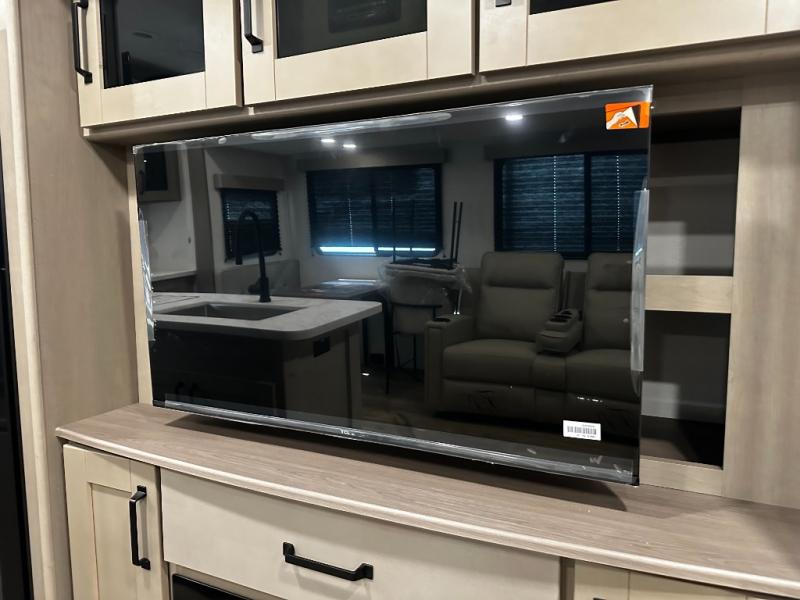 Step inside and feel right at home. The Reflection 28RL welcomes you with an open, airy floorplan featuring a spacious rear living area, premium theater seating, and a large entertainment center with a fireplace for cozy nights. The gourmet-style kitchen includes solid-surface countertops, a residential refrigerator, and an oversized pantry—making every meal on the road a pleasure. Whether you’re hosting friends or relaxing after a long day of exploring, the Reflection offers the perfect blend of elegance and practicality.