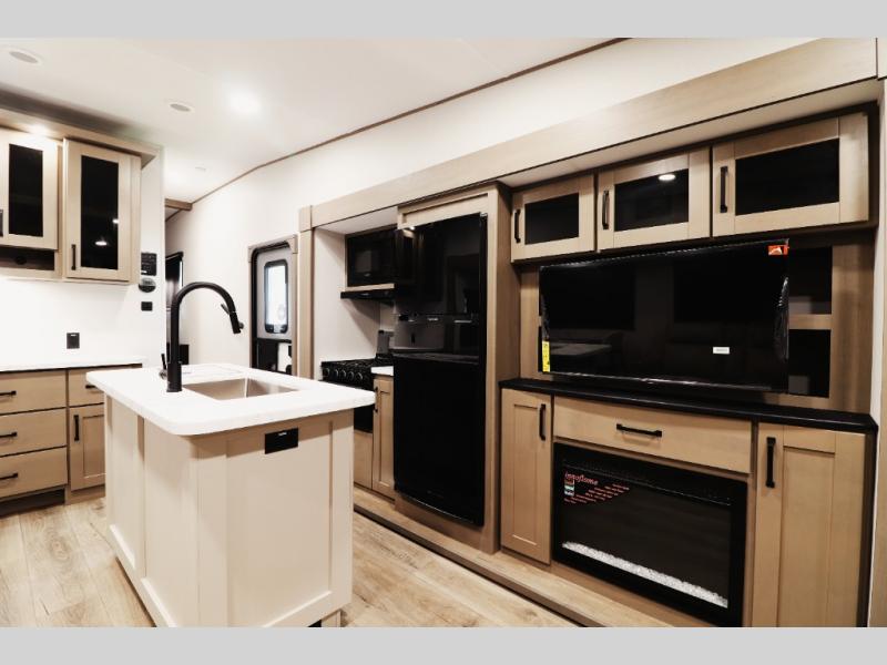 Chef-Approved Kitchen: Island layout, deep stainless sink, 12 V 10 cu ft refrigerator, 3-burner cooktop, built-in microwave with hood, and residential-style cabinetry (Peace of Mind Package).