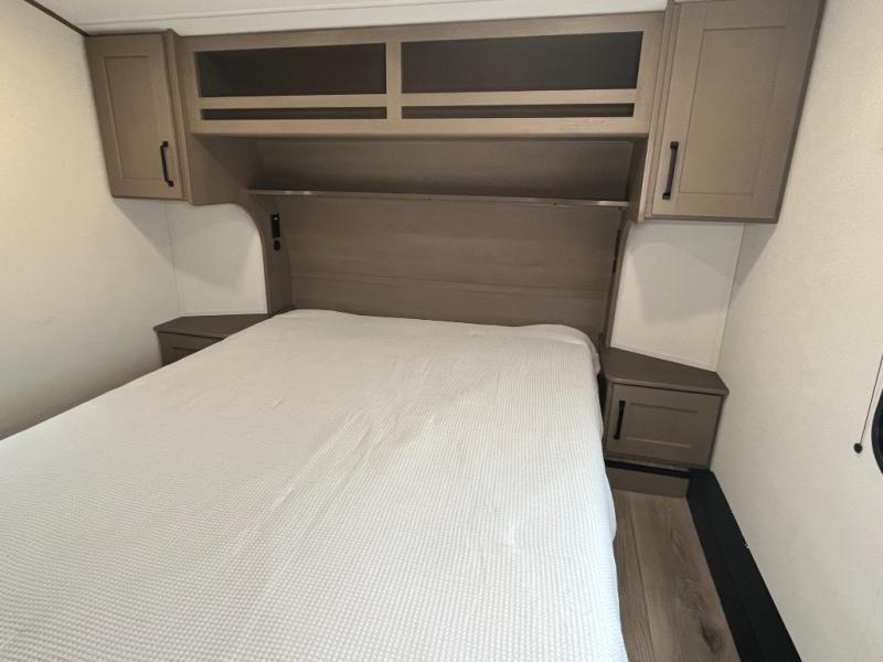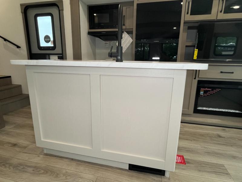 You'll love the amount of space you have in this fifth wheel thanks to the dual opposing slides in the rear living area/kitchen. Your friends and family can relax on the tri-fold sofa or theater seating across from the high-definition 40" LED TV. There is also a booth dinette or you can choose the optional swivel dinette if you prefer that seating. The chef of your group will appreciate having a kitchen island that will provide more counter space, plus there is a hutch with overhead cabinets for nice dishes. A full bath onboard lets you clean up each day and the front private bedroom includes a queen bed just like at home. You'll also love spending time outdoors under the electric awning, and there is an unobstructed pass-thru storage for fishing poles, hiking gear, and camp chairs!