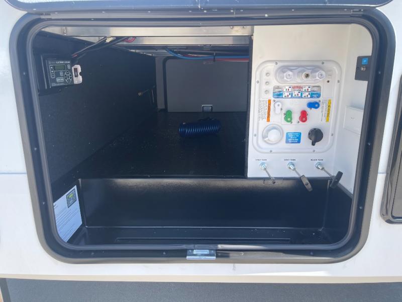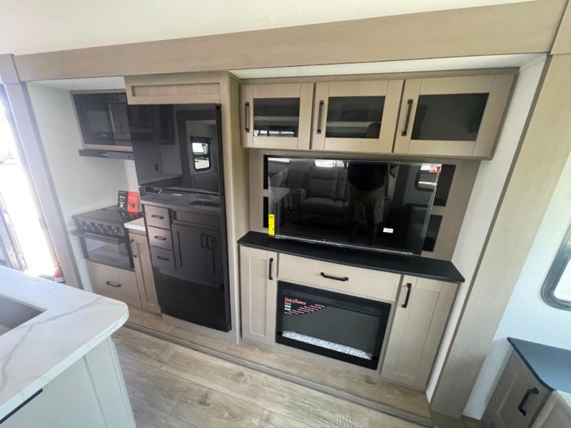 You'll love the amount of space you have in this fifth wheel thanks to the dual opposing slides in the rear living area/kitchen. Your friends and family can relax on the tri-fold sofa or theater seating across from the high-definition 40" LED TV. There is also a booth dinette or you can choose the optional swivel dinette if you prefer that seating. The chef of your group will appreciate having a kitchen island that will provide more counter space, plus there is a hutch with overhead cabinets for nice dishes. A full bath onboard lets you clean up each day and the front private bedroom includes a queen bed just like at home. You'll also love spending time outdoors under the electric awning, and there is an unobstructed pass-thru storage for fishing poles, hiking gear, and camp chairs!